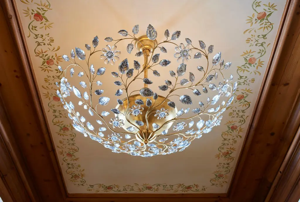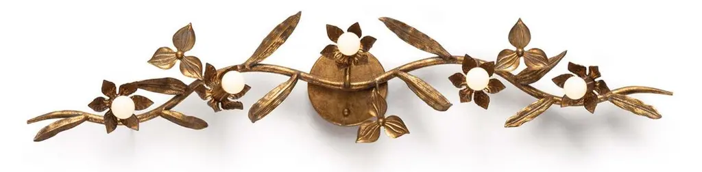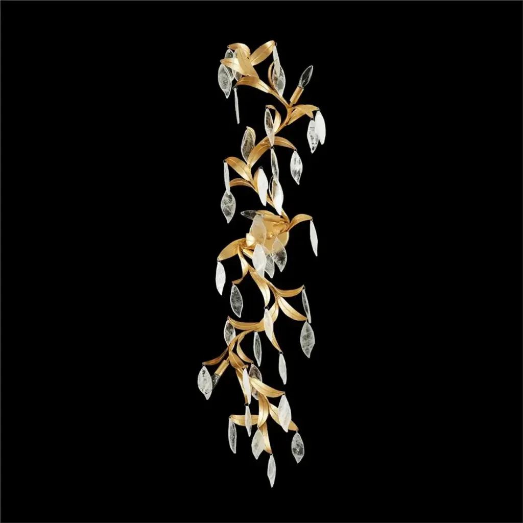 The Blooming Selenite Wall Sconce showcases beautiful natural motifs that imbue an interior space with an elegant ambiance. Crafted from metal in a stunning Gold Leaf finish, twisting vines with gorgeous selenite leaves create a serene look. The piece features four bulbs among the foliage, providing a wealth of ambient illumination.