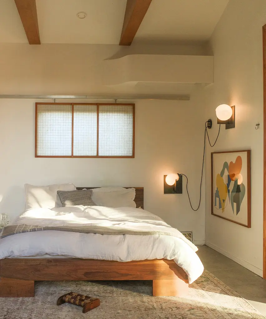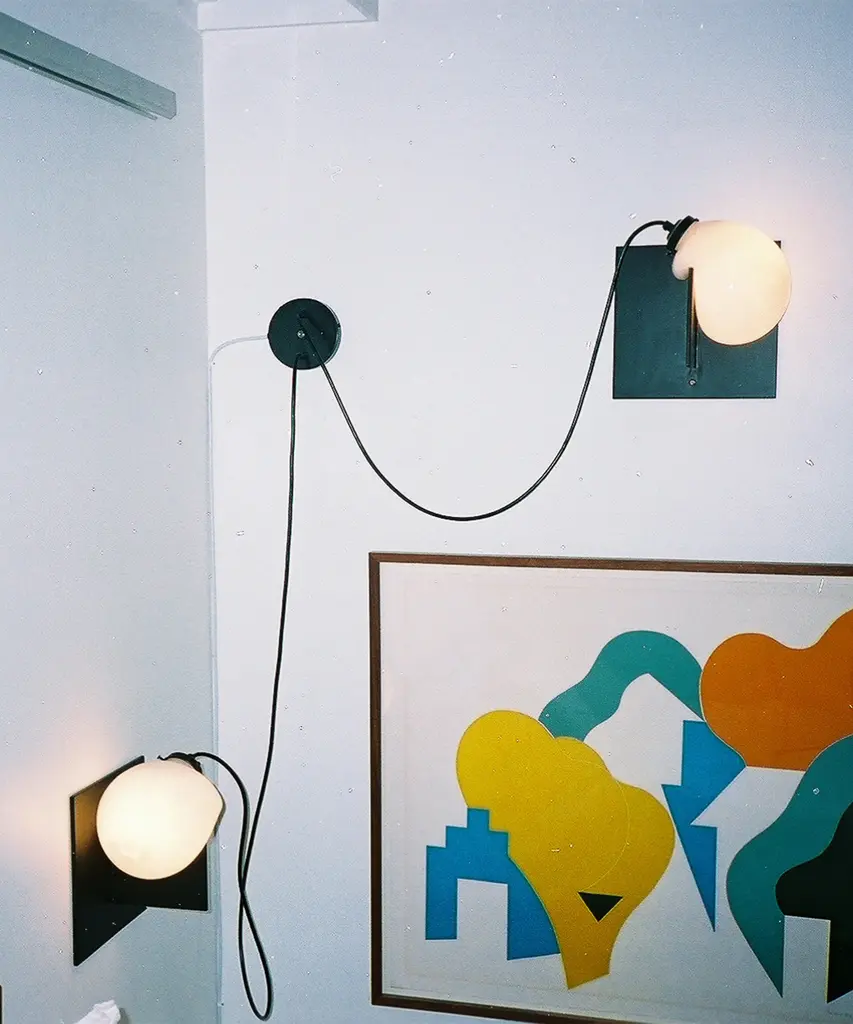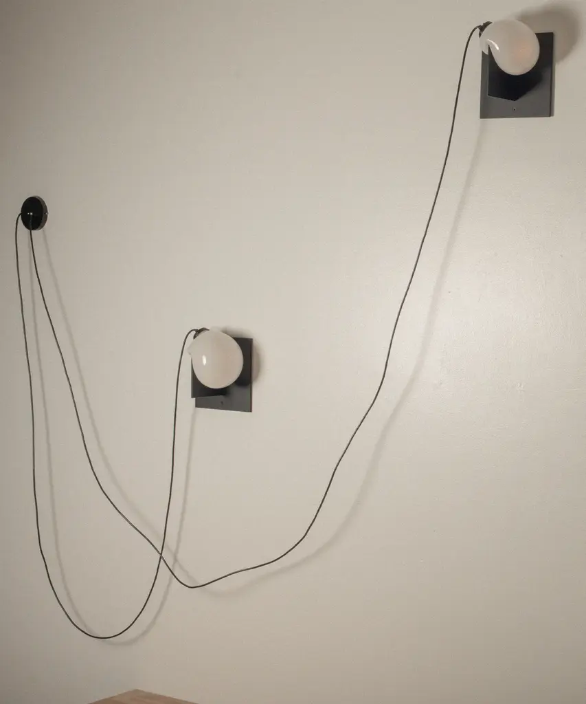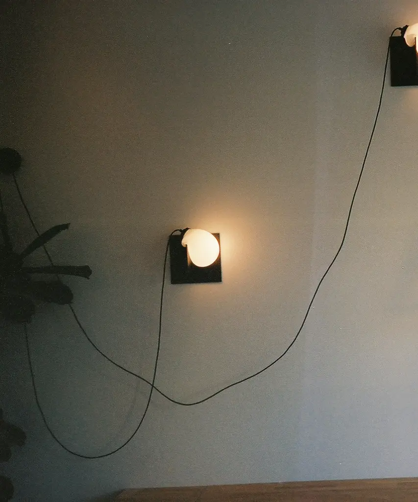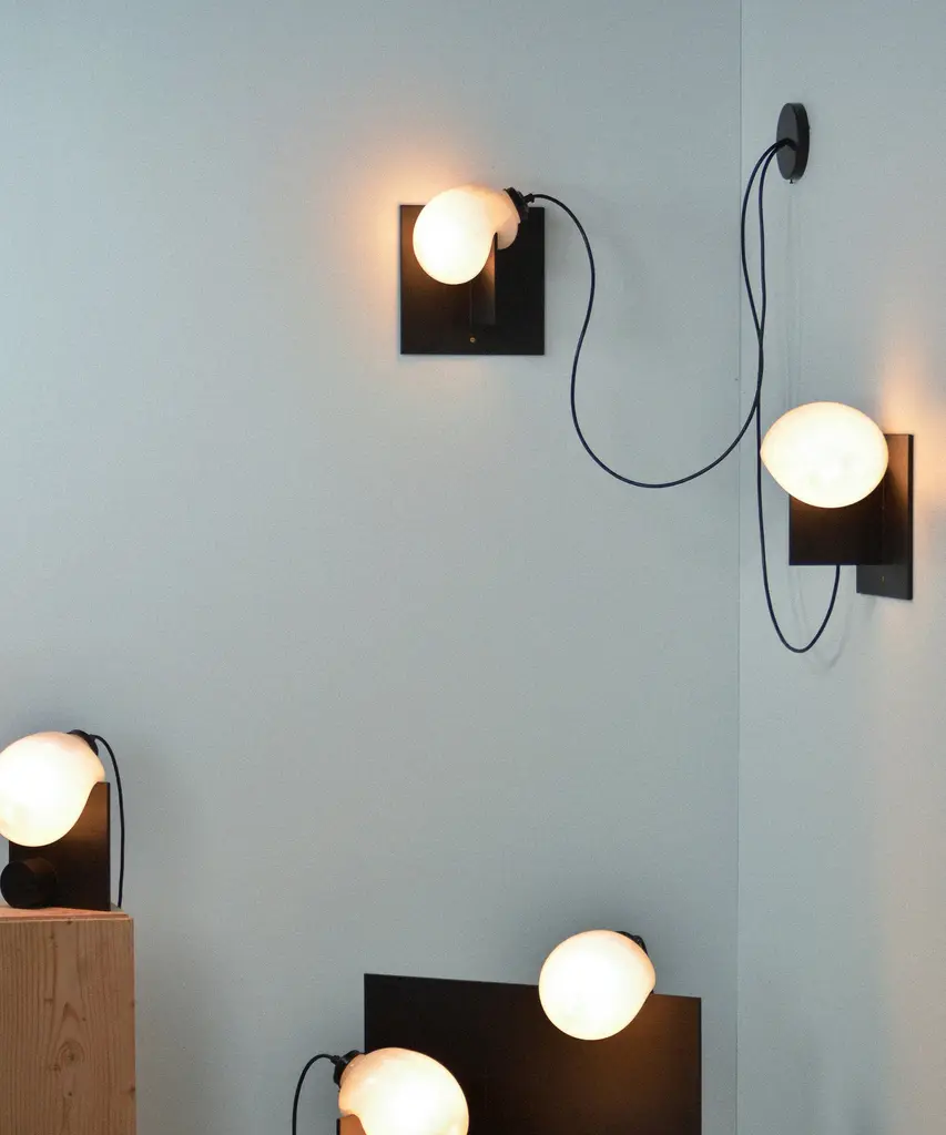 Hand blown glass lights that drape over handmade metal bases. The bulb’s own form helps balance and lock in safely on the base without hardware. Hand blown glass pieces made to droop over the metal fixture. These lights give a soft white hue that adds warmth to any space. The bulbs are varying in size and shape due to the handmade production process. Bulb is approximately 6” W x 6” H x 6” D. Sconces are sold individually. Pieces can be hardwired fro professional installation or made with a wire lead and plug depending on install needs. If multiples are ordered, the units can be wired together as seen in photos.