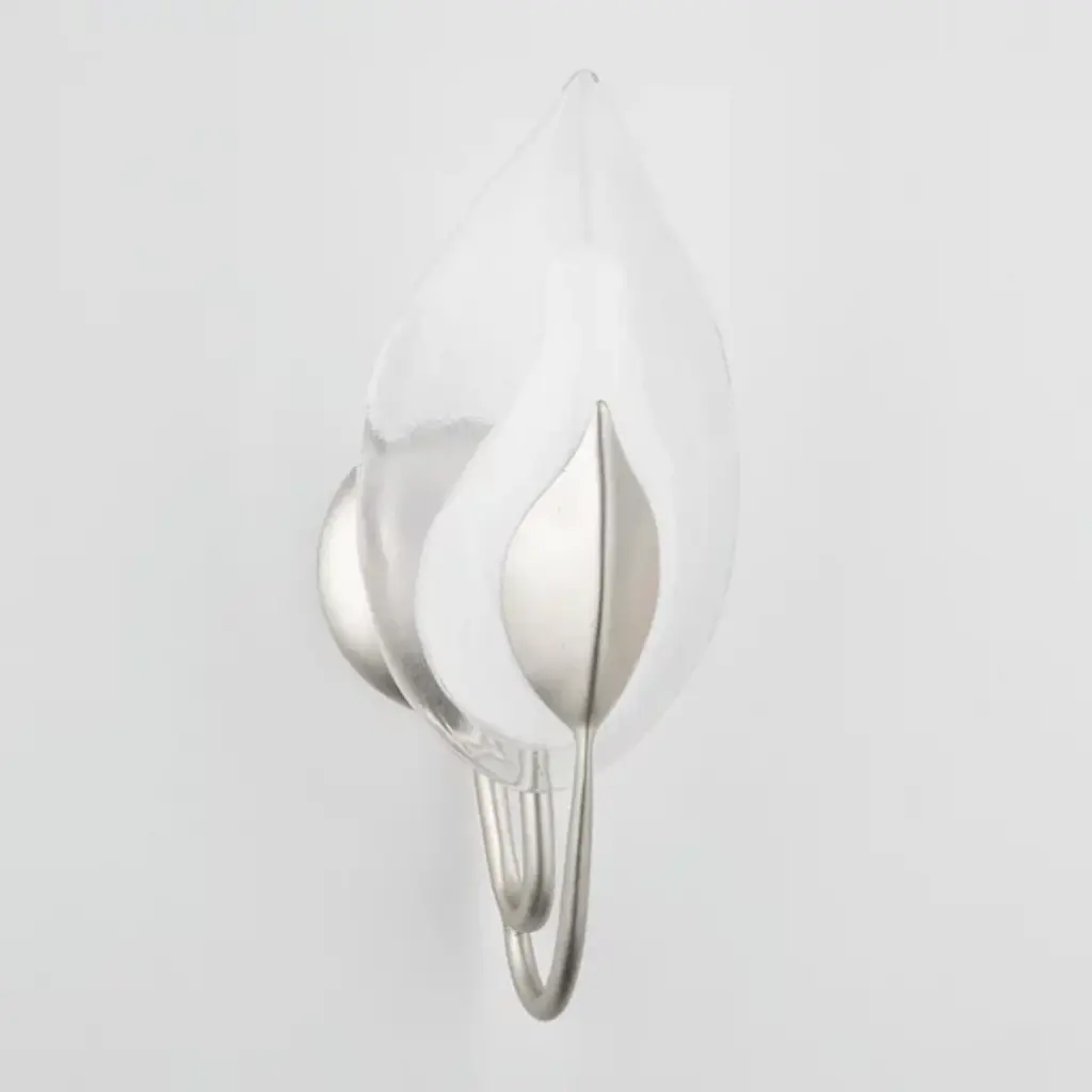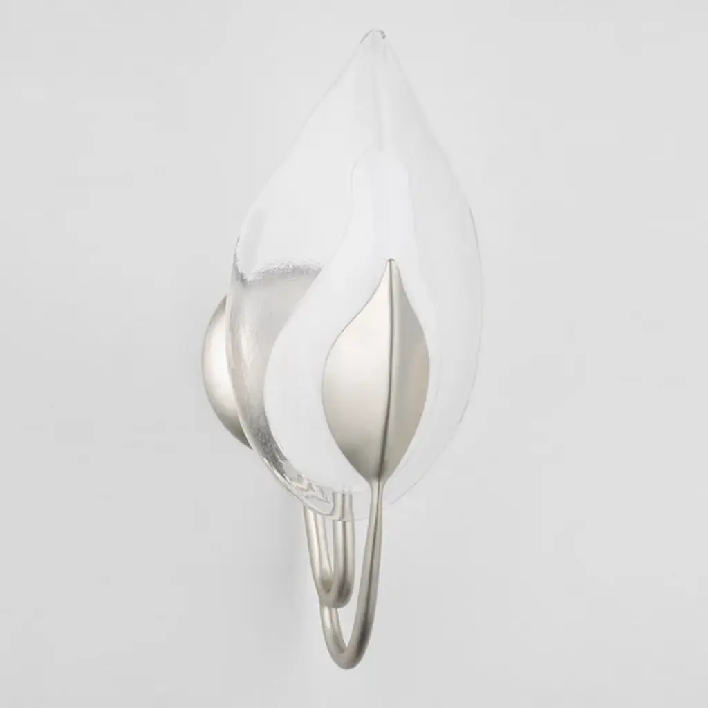 Give your home the pleasant touch of a blooming bouquet with the Blossom Wall Sconce by Hudson Valley Lighting. This charming fixture is supported by a domed wall mount that sprouts two gracefully curving stems. At their end, delicate leaf panels support textural glass in the shape of a single petal to create a shade over its incandescent bulb. When lit, the fixture emits a soft and delicate beam of light that harmonizes with the gentle beauty of its design.