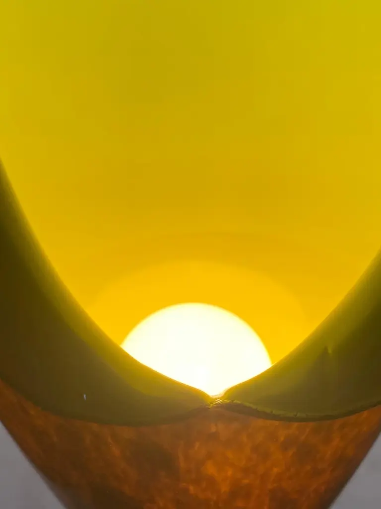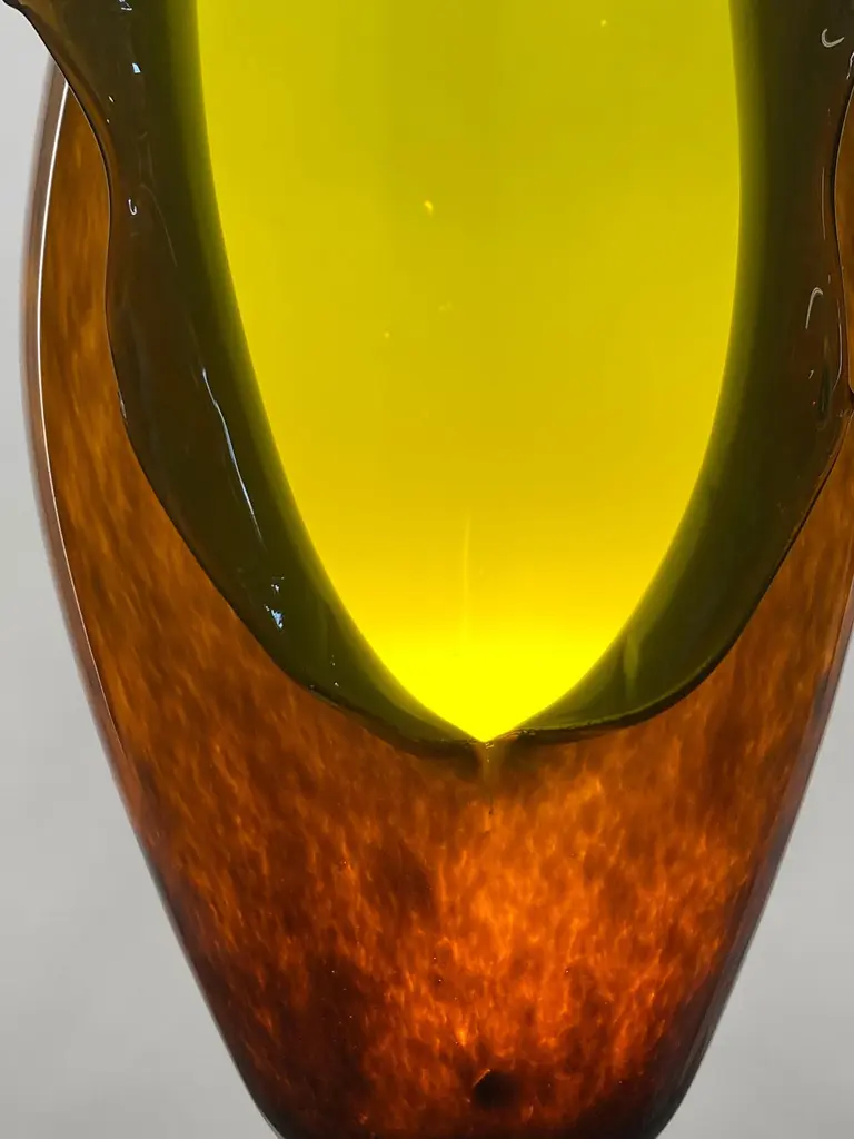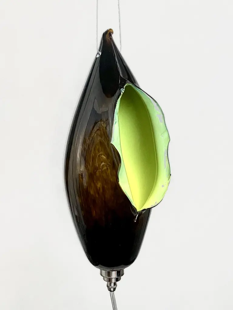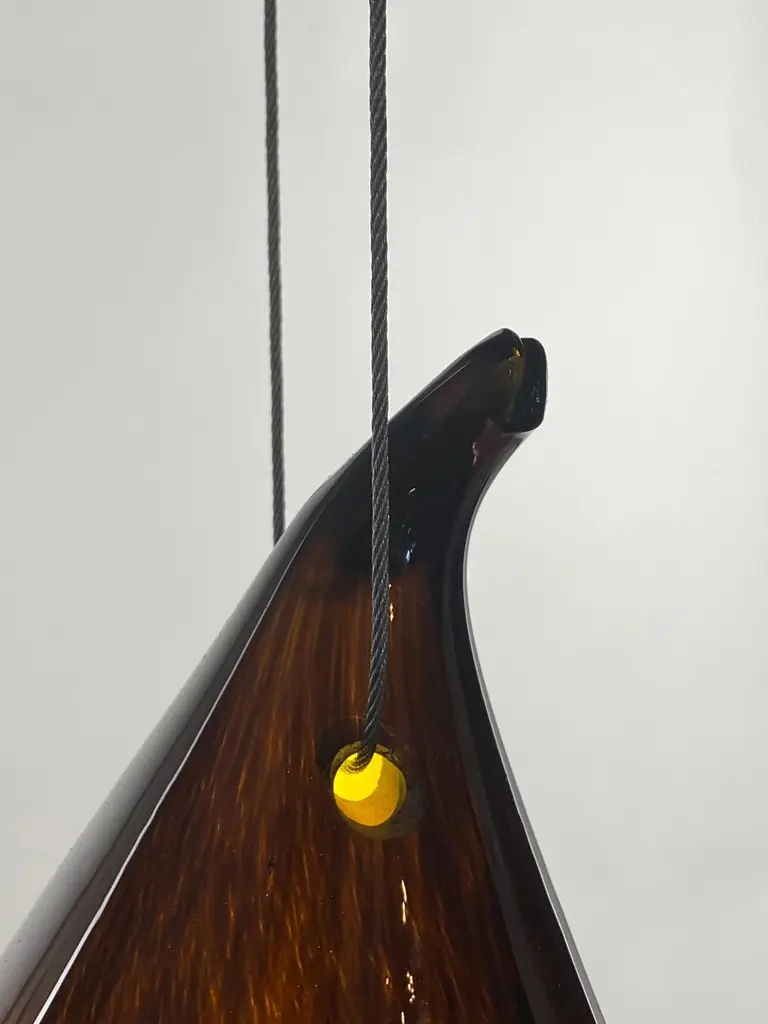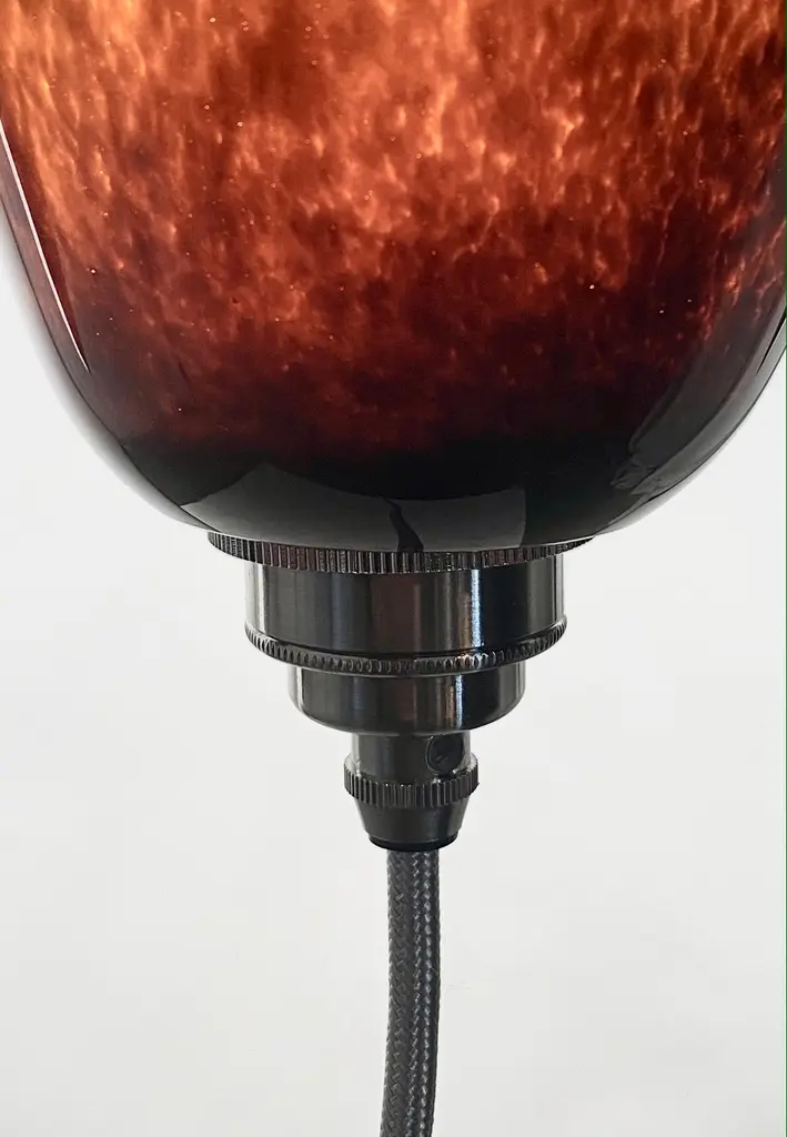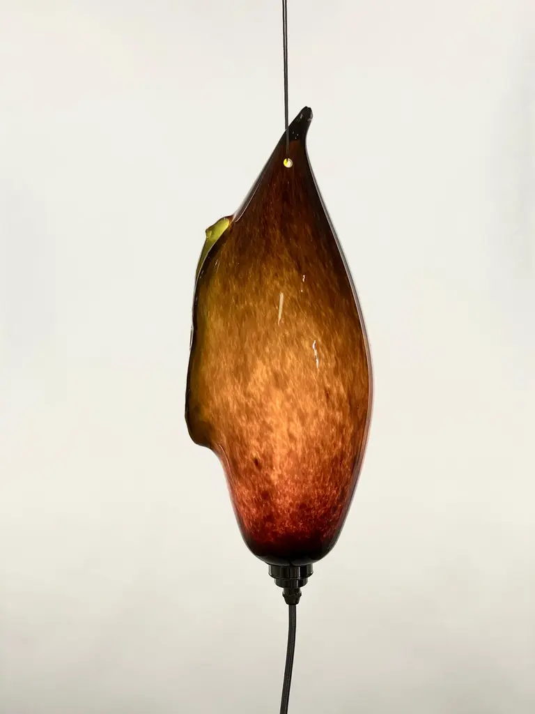 This is a new work by Mattia Biagi in a glass.The sculptural lamp can be used as a table lamp or hang.16ft robust cloth covered wire in nickel color allows for multiple hanging possibilities. Integrated on/off switch located conveniently 2 feet from the plug, allowing for easy lighting control in any environment. Swag it, hang it or sconce it.