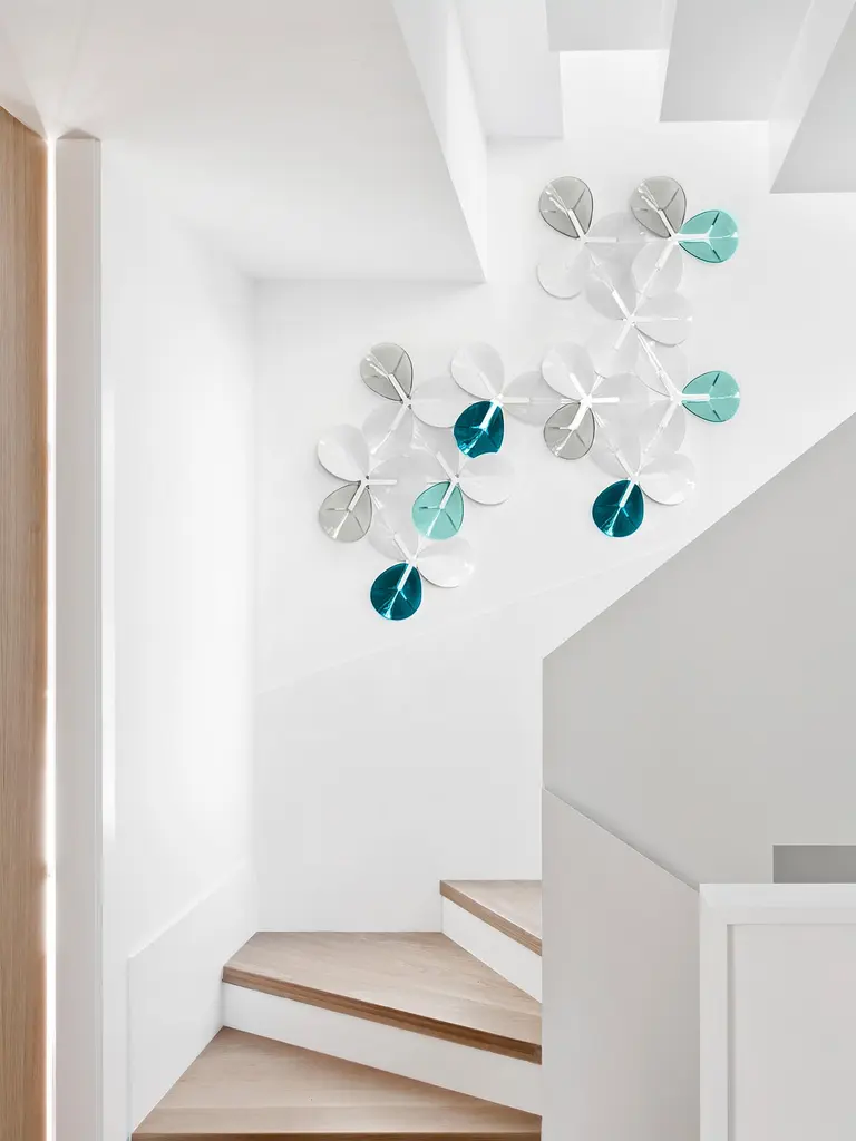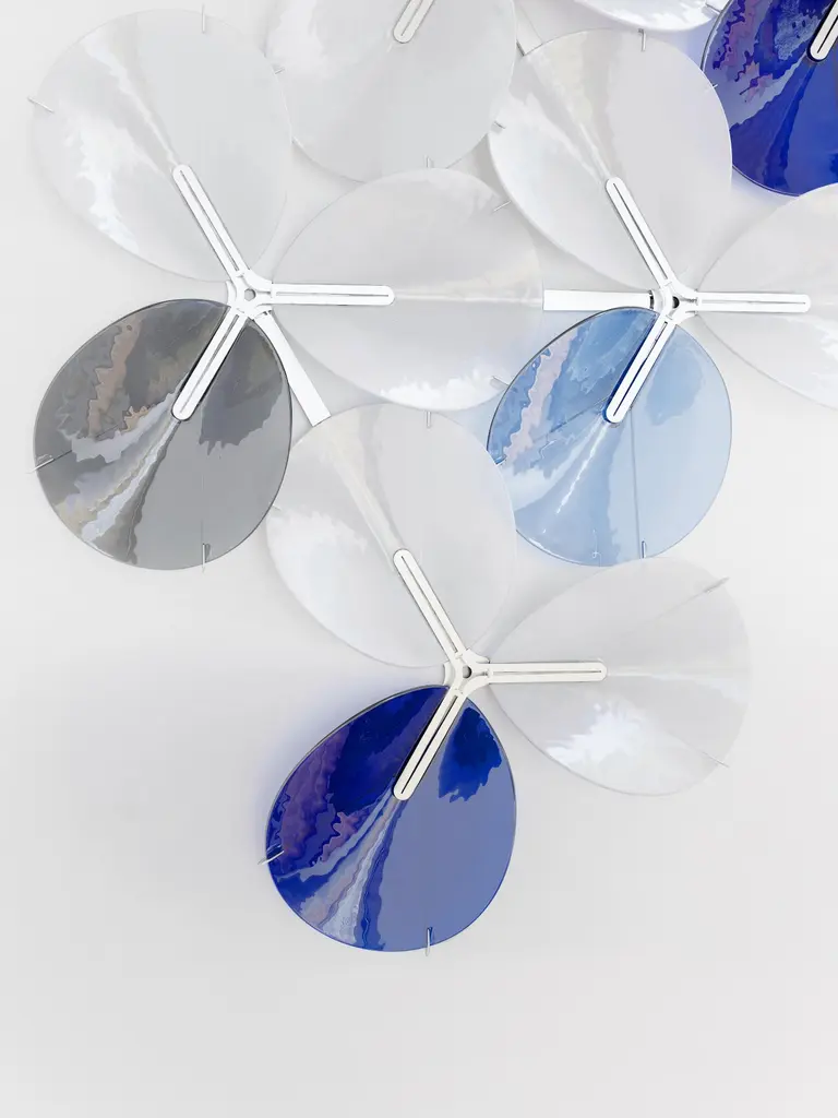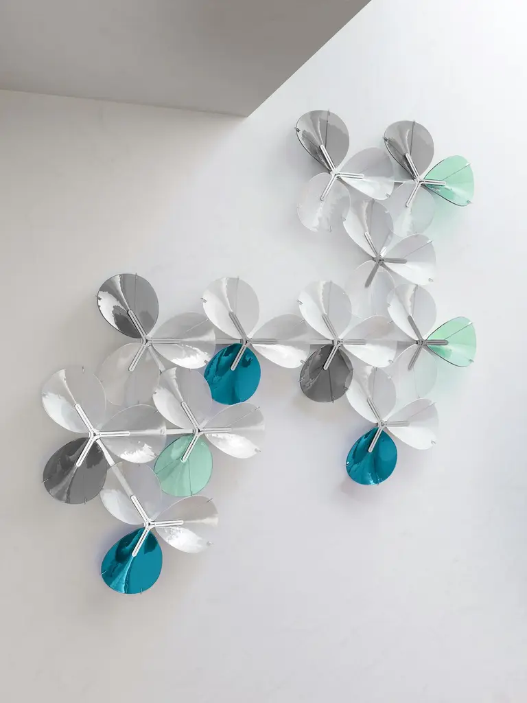 The PETALO wall art piece is a composition of 33 petal-shaped glass pieces assembled in groups of 3 pieces that form a clover. There are 3 color palettes available and other combinations on demand.The colored artisan glass pieces are mounted on a polished stainless steel structure.Hand-crafter and ready-made for each customer.Designed in Barcelona and handmade in our workshop overlooking the Mediterranean sea.Illuminated compositions on a separate listing. PETALO wall lamp.