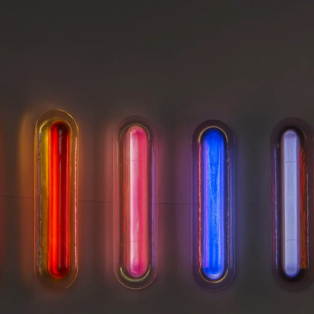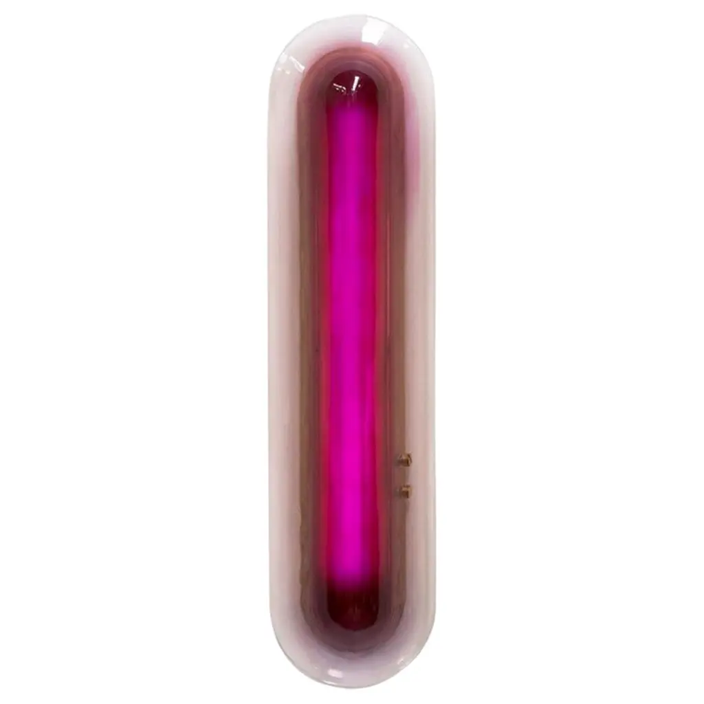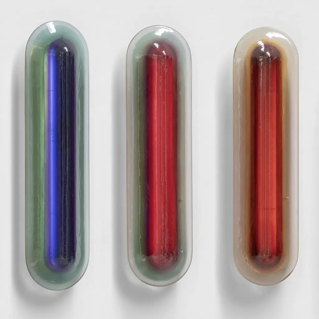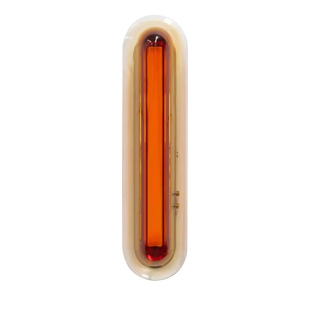 The unique crafting of this sculptural wall lamp is evident in its vibrant gradients of cerulean and vivid green, resulting from a special casting technique where various layers of colored epoxy resin are placed in the mould. Part of the Transparency Matters Collection available in a wide range of colors, this dimmable lighting fixture is mounted on a brass frame. Any variation in shape is due to a stylistic choice of the designer and is not to be considered a flaw.