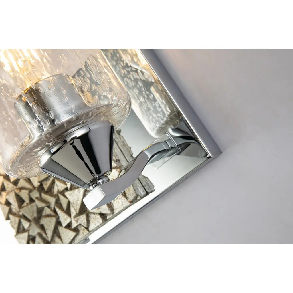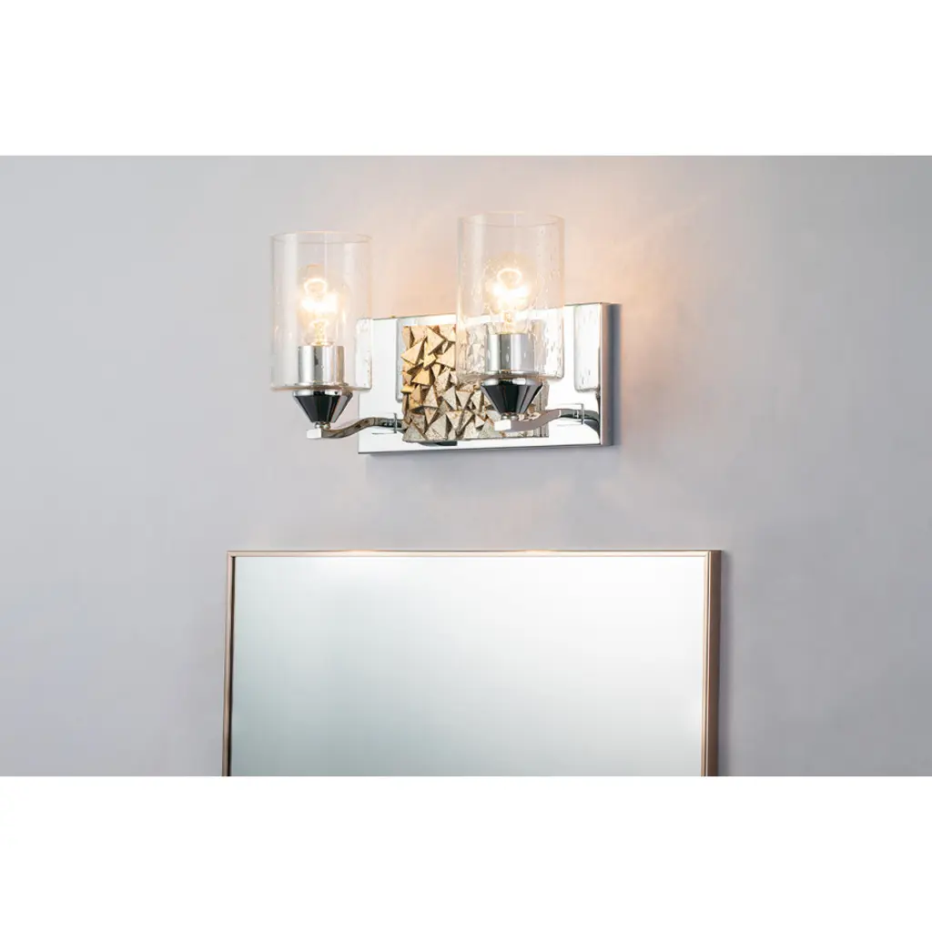 Clean lines and timeless design this double vanity light is perfect for brightening your bathroom space giving it texture and dimension. Featuring a clean-cut rectangle backplate with textured traditional shapes, simple curved arm and a unique two-toned finish of polished chrome and antique silver. Showing off its contemporary side, this 2-light bathroom light uses a cylinder shaped clear seeded glass to bring attention to the mix of texture and details that come together in our Bocage collection. Measuring 13" Wide, 8" in height and 6.5" in depth, this two-light vanity light can fit in nearly any space.