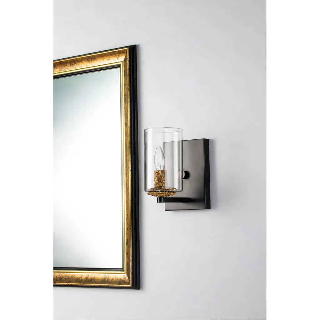 Charming and vintage inspired, the Bolivar 1-light wall sconce uses a mixed gold and Matte black finishes to give a genuine and edgy candle style design that shows off the antique gold detail used on the candle sleeve. This one-light wall sconce has cylinder shaped clear glass, and uses a modern crisp shape to update your bathroom space. The rectangle back plate finished in a sophisticated matte black s is the perfect finishing detail.