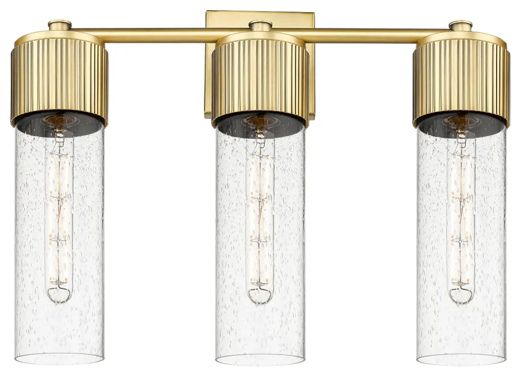 INNOVATIONS 428-3W-BB-G428-7SDY Bolivar 3 20.5 inch Bath Vanity Light Brushed Brass. Style: Industrial, Restoration, Transitional. Collection Name: Downtown Urban. Metal Finish(Body): Brushed Brass. Material: Steel, Cast Brass, Glass. Dimension(in): 9.5(H) x 20.5(W) x 6(Ext). Bulb: (3)5W LED(Included). Voltage: 120. Dimmable: Yes. Color Temperature (Kelvin): 2700. Color Rendering Index (CRI): 90. Lumens: 500. Life Expectancy (Hours): 15000. Glass Shade Description: Seedy Bolivar. Glass Type: Seedy. Shade Shape: Cylinder. Glass or Metal Shade Color: Seedy. Shade Material: Glass. Shade Dimension(in): 3.5(W) x 6.75(H). ADA Compliant: No. California Proposition 65 Warning Required: Yes. UL/ETL Certification Type: Damp Location.