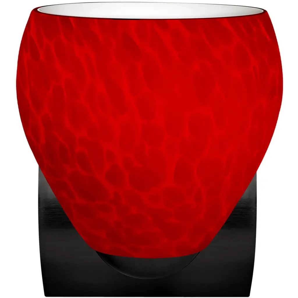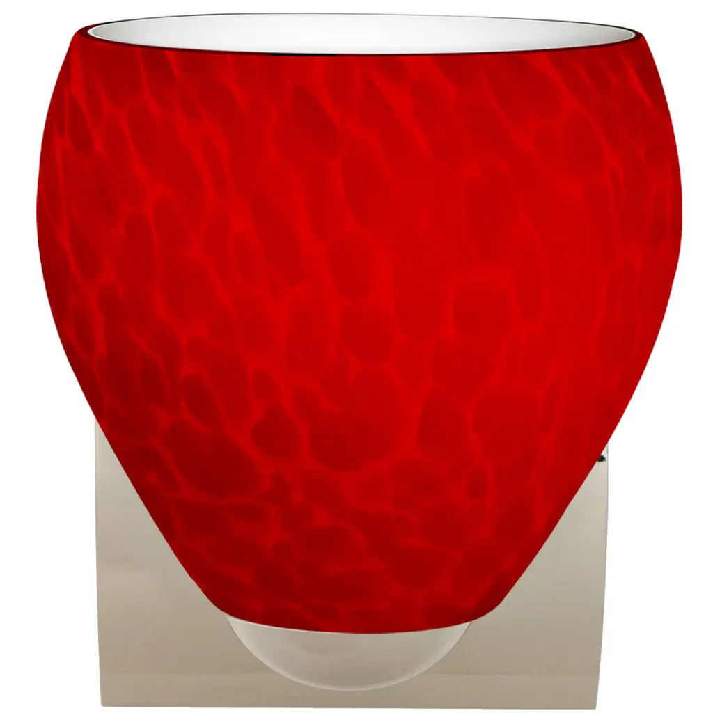 The Bolla is a compact handcrafted glass, softly radiused to fit gracefully into contemporary spaces. Our Red Cloud glass is full of floating, splashes of red tones over cased red that resembles a watercolor painting when illuminated. This combination of color is crisp and timeless. This décor is created by rolling molten glass in small bits of red hues called frit. The result is a multi-layered blown glass, where frit color is nestled between an opal inner layer and a clear glossy outer layer. The handcrafted touch of a skilled artisan, utilizing century-old techniques passed down from generation to generation, creates variations in color and design that are to be appreciated. The mini sconce fixture is equipped with a sleek arcing diecast lampholder and matching radiused rectangular canopy. These stylish and functional luminaries are offered in a beautiful Chrome finish.