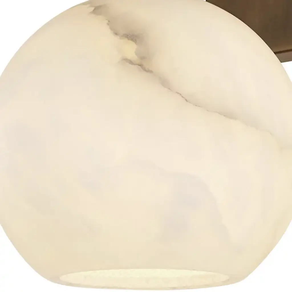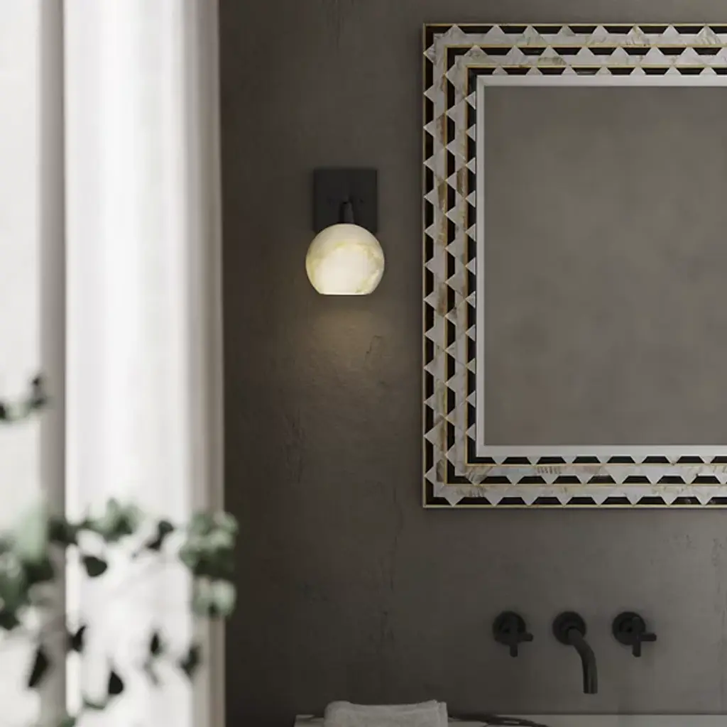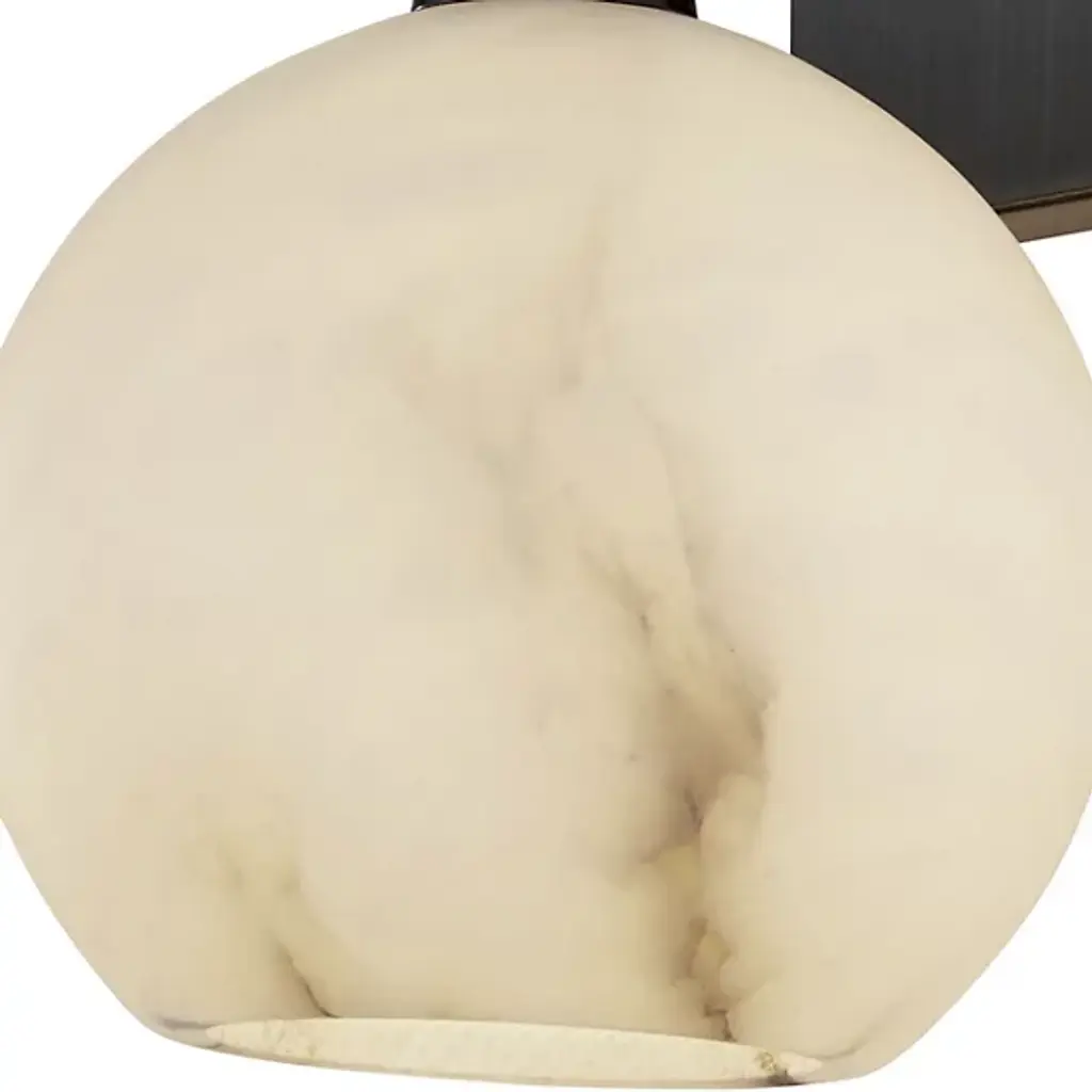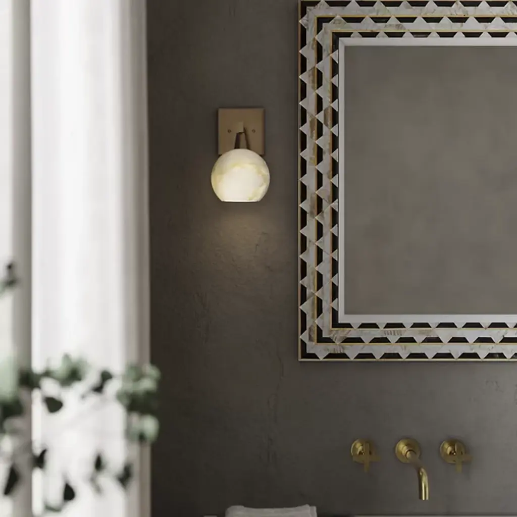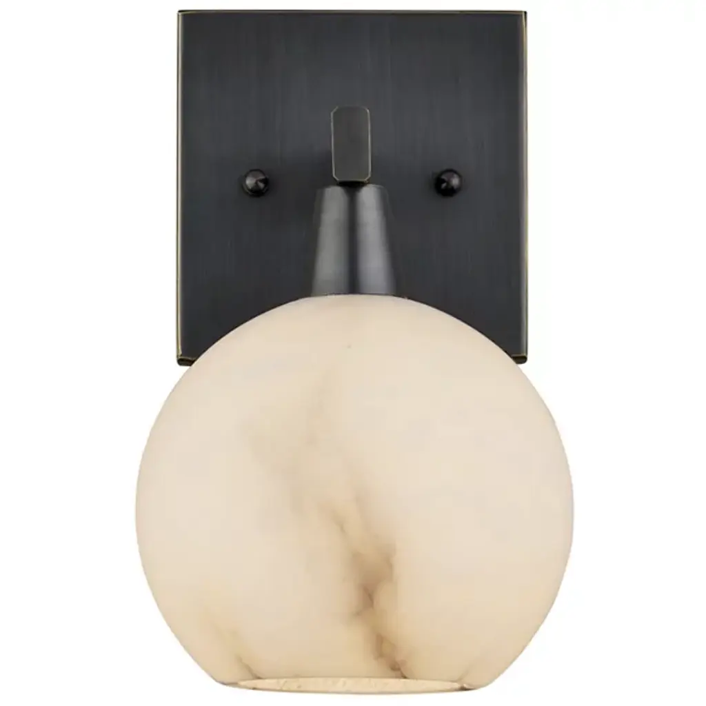 The Bombelles Bath Sconce from Currey & Company is crafted to illuminate bathroom counters with abundant light. Its natural alabaster globe emits a luminous glow when lit, complemented by an oil-rubbed bronze finish on the metal that adds warmth to its design. Each fixture boasts unique variations due to alabaster's natural properties, ensuring a bespoke touch. Versatile in installation, the Bombelles can be mounted with the globe pointing up or down, offering flexibility to suit various aesthetic preferences.