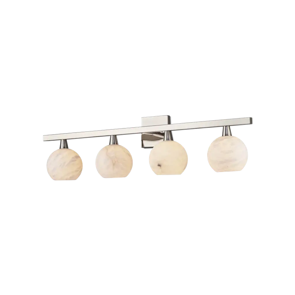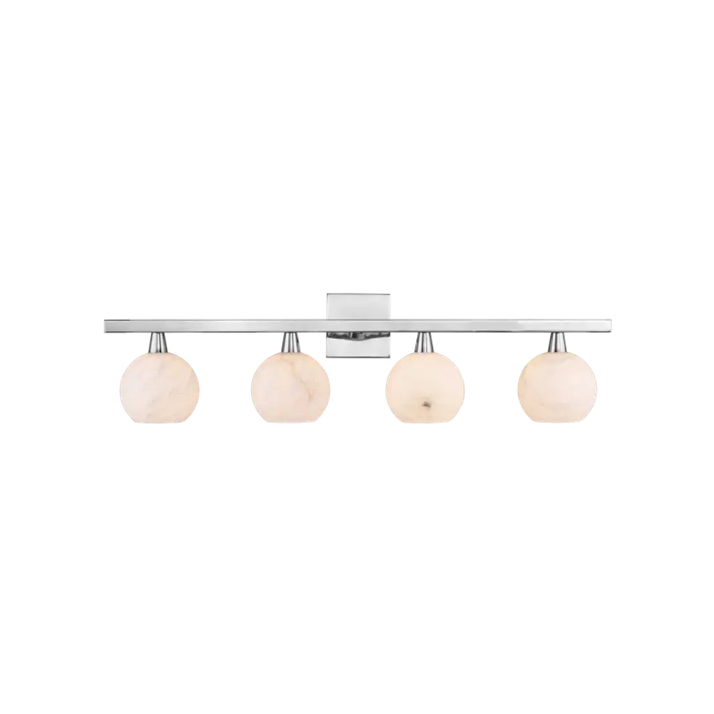 The Bombelles Bath Bar was designed to spread abundant light over a bathroom counter, the fixture joining others in the bath collection. The globes will be luminous when they are lit, as they are made of natural alabaster, and the metal adds warmth to the design. Alabaster is a natural material, so there will be slight variations in each of the fixtures.