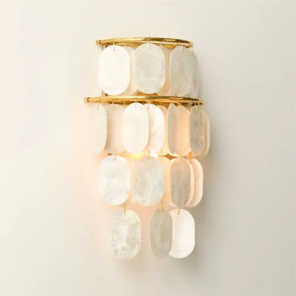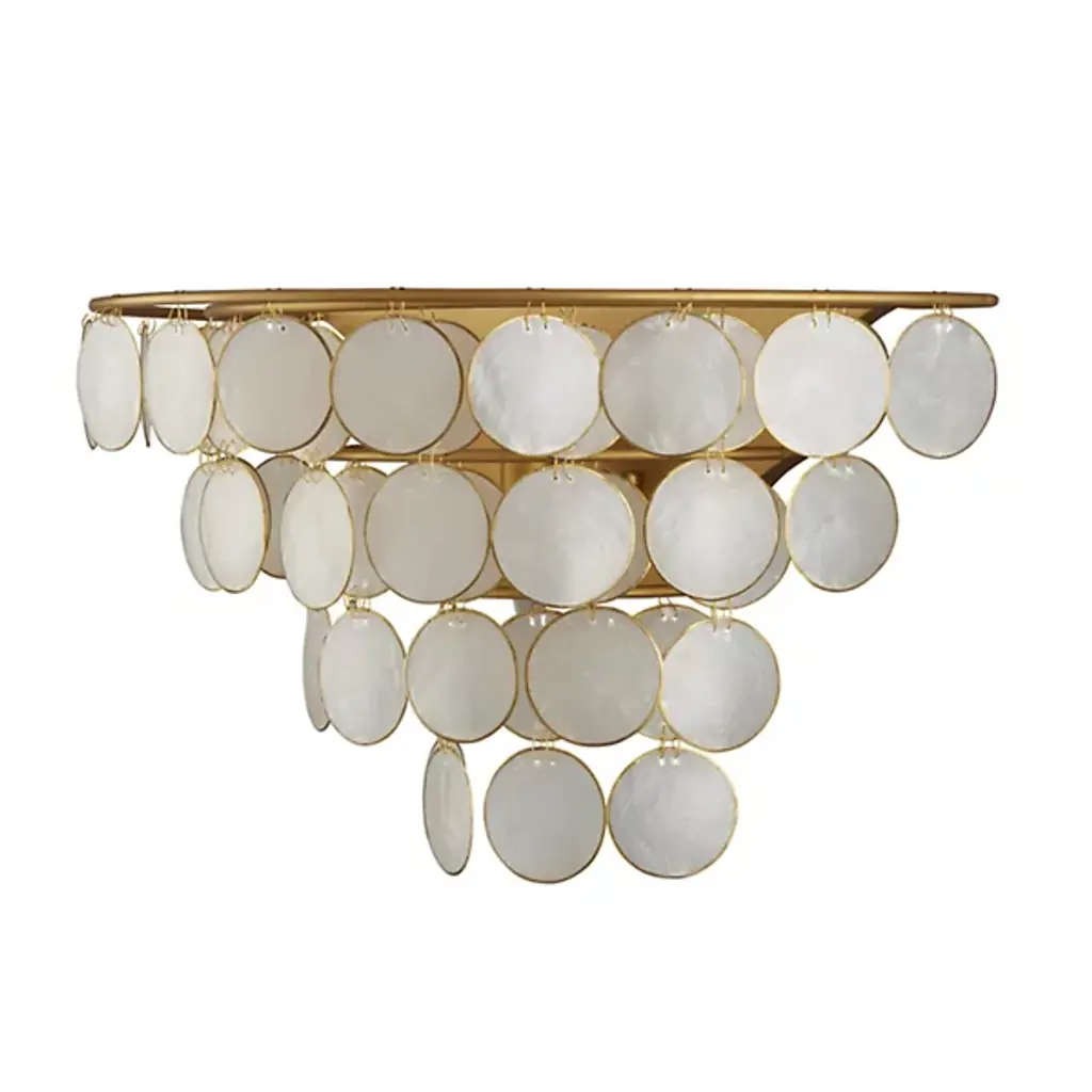 The Bon Vivant Wall Sconce by Currey & Company exudes an ethereal charm, assembled with artistry. Designed by Tom Caldwell, its effervescent illumination emanates through discs crafted from Capiz shells, encircled by a decorative metal edge that harmonizes with the fixture's gold finish. The delicate scale of the wires, elegantly fastening the discs to the frame, adds a sophisticated, intricate touch. This mid-century modern-inspired sconce combines gold glitter and pale hues, creating a captivating coastal and nautical note accentuated by its meticulous craftsmanship and delivering a pleasant, inviting glow.