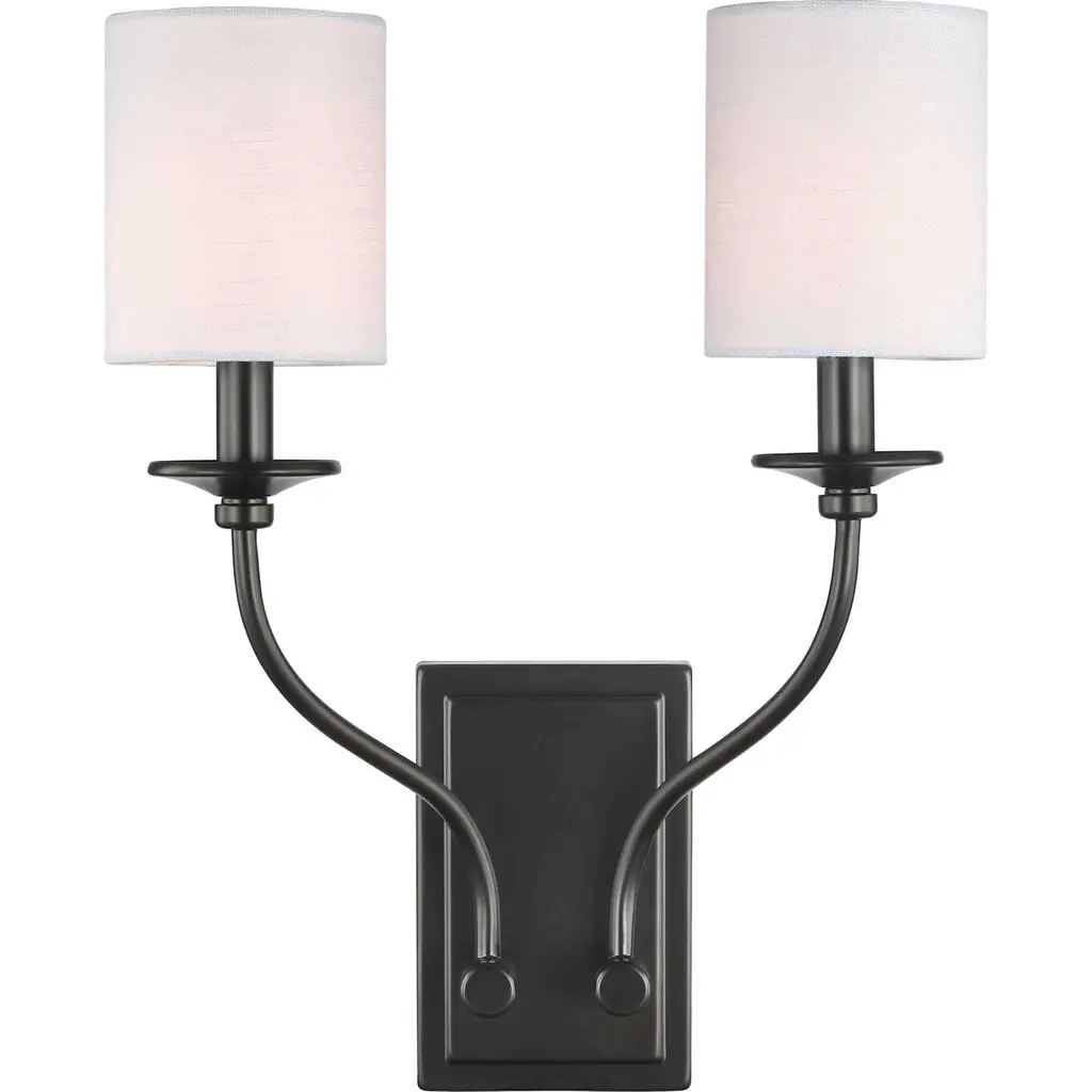 Inspired at its roots by an understated beauty and a breathtaking formal elegance, this wall sconce will make a stunning addition to any luxurious living space. Black arms flow down from ornamental light bases to a rectangular backplate. On top of the light bases sit summer linen shades.