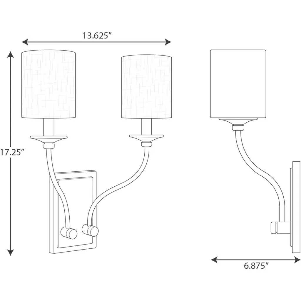 Inspired at its roots by an understated beauty and a breathtaking formal elegance, this wall sconce will make a stunning addition to any luxurious living space. Black arms flow down from ornamental light bases to a rectangular backplate. On top of the light bases sit summer linen shades.