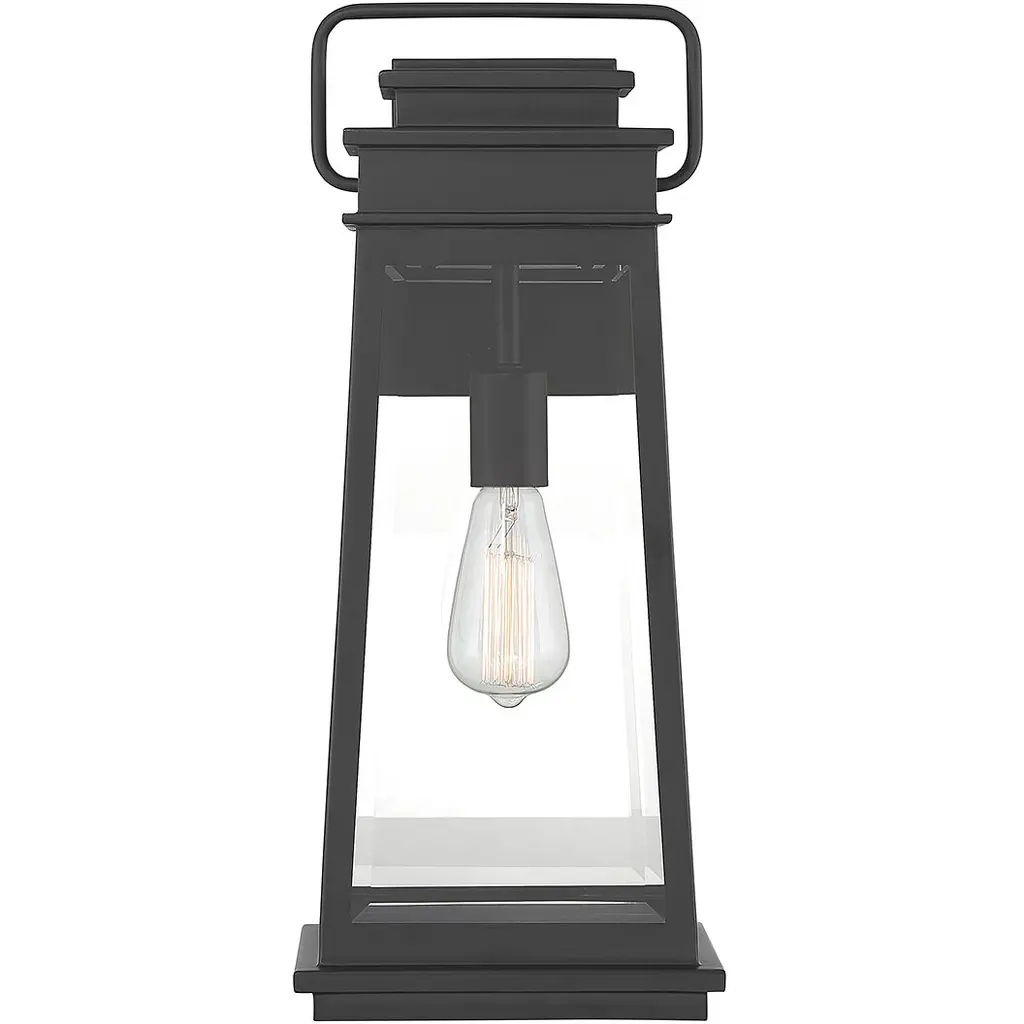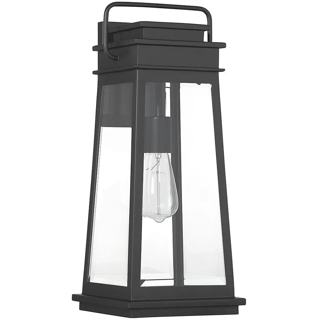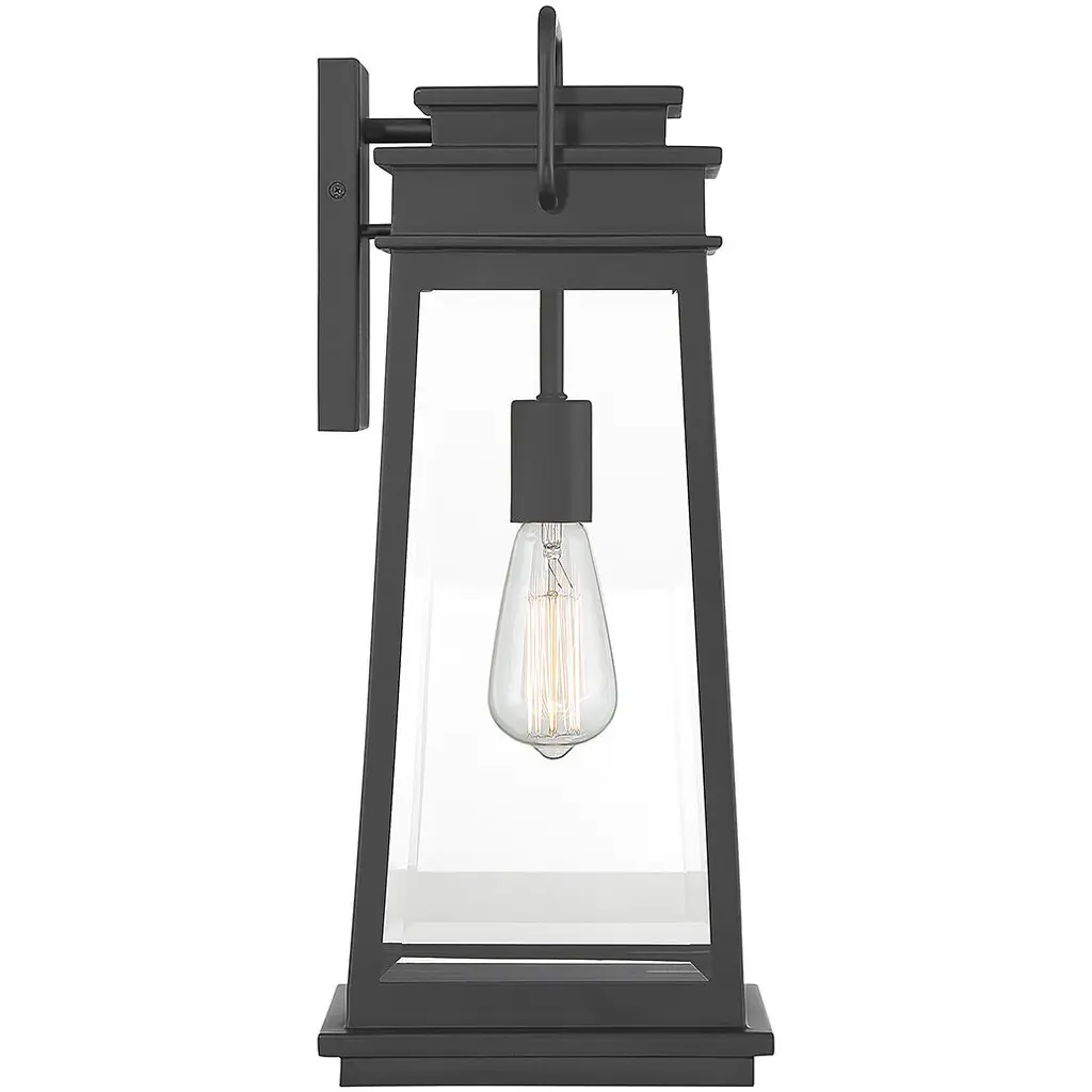 The Savoy House Boone 1-light outdoor wall light showcases a classic lantern-style lighting look with panes of clear beveled glass and a matte black finish that adds versatility. Boone is 20" in height, 8.25" in width and extends 8.5" from the wall. It uses 1 standard size bulb with a max of 60 watts (bulb not included).
