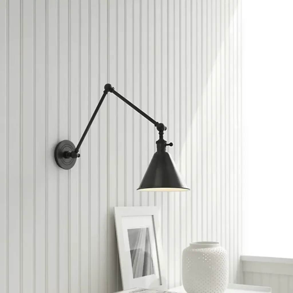Function and form have come together beautifully to create the Boston Functional Double Arm Library Light. It was designed by E.F. Chapman and is presented by Visual Comfort Signature, formerly known as Visual Comfort, The transitional style of this handsome metallic structure includes a hi-lo fixture switch and an adjustable arm for versatile placement and focus. The coned shade attached at the endpoints a spotlight of illumination downward onto the surface below. Beyond being a fantastic light for reading, it will also serve creatives and makers quite well.