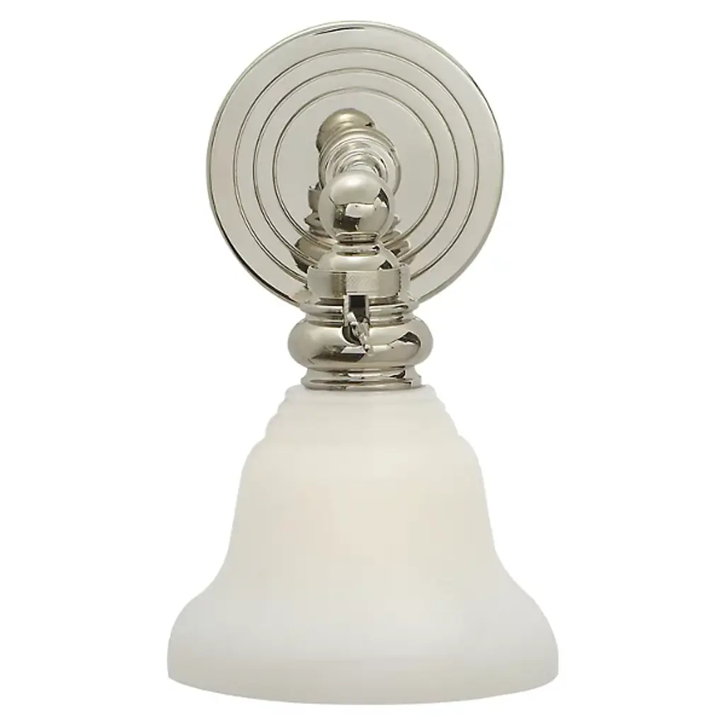 The Boston Wall Sconce by Visual Comfort Signature, formerly known as Visual Comfort, brings form as well as function to your living space, featuring a concentrically etched wallplate, a dramatically angled stem, and a lavish metal holder (with industrial-styled grooves and accents). Available in a variety of finishes and shade options to ensure the right fit for your personal space.