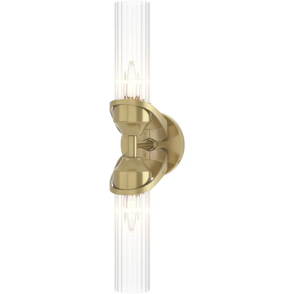 The Bow 2-Light Bath Sconce can be placed vertically or horizontally in any spa bath environment. A traditional shape, the Bow's ribbed glass cylinder shades give it an Art Deco feel. Forged metal collars, handcrafted by Vermont makers, are affixed to its round backplate. Available in Black, Oil Rubbed Bronze, Vintage Platinum, Soft Gold, Sterling and Modern Brass.