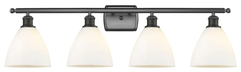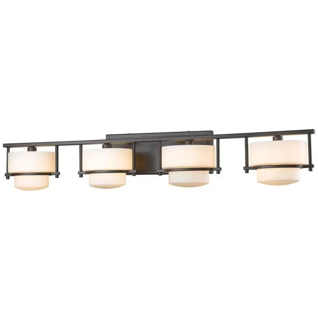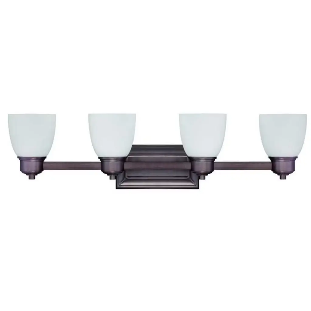 • The beauty of our entire product line is the opportunity to create a look all of your own, as we now offer over 40 glass shade choices, with most being available as an option on every lighting family. So, as you can see, your variations are limitless. It really doesn''t matter if your project requires Traditional, Transitional, or Contemporary styling, as our fixtures will fit most any decor. • 4 medium base bulbs (not included), • 100 watt, • UL/CUL listed, • hardwired.• Bow 4 Light Bath Bar • Bronze Finish• 4.5"• White Muslin Glass• •