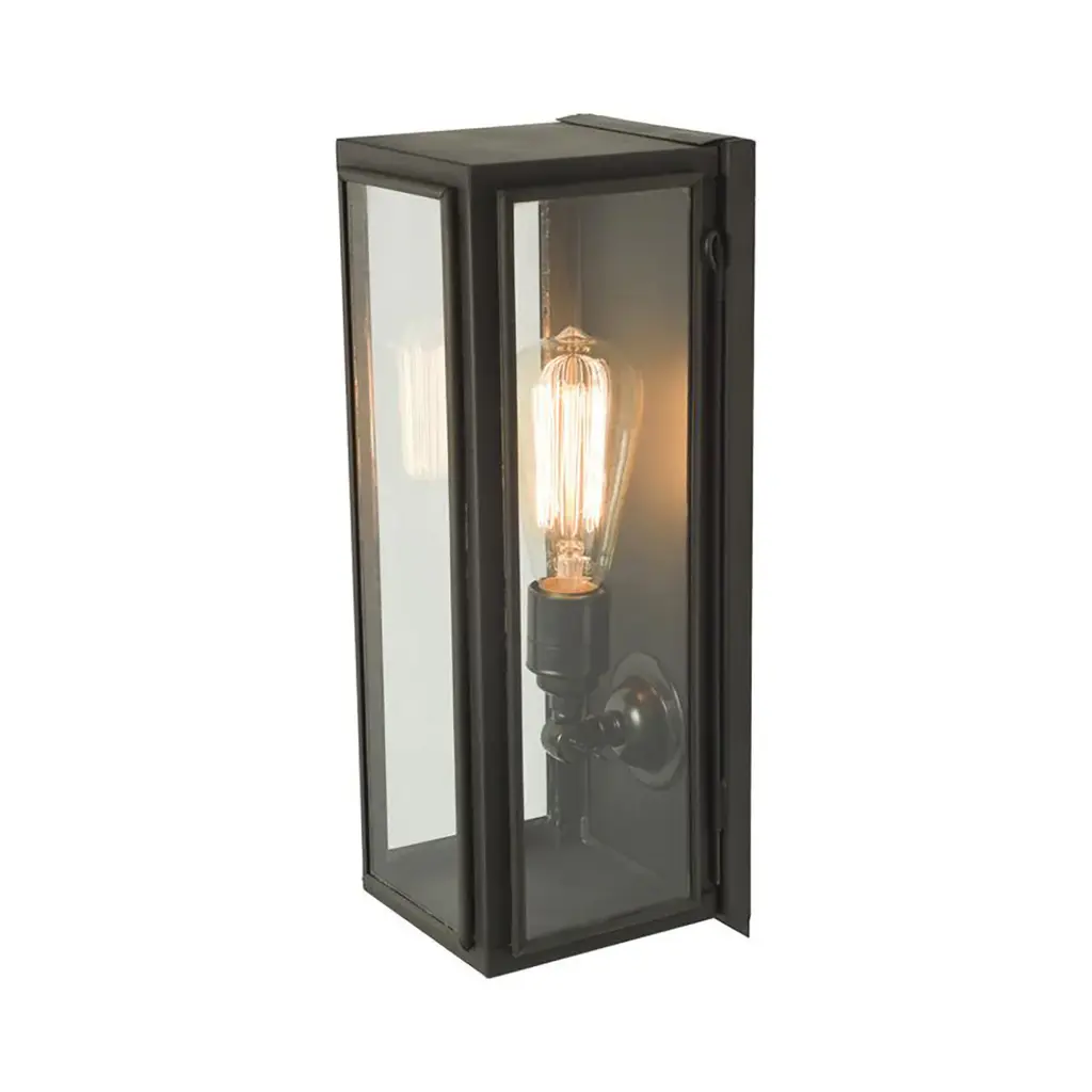 An attractive internally glazed box wall light in brass finishe with glass that is fitted inside the box frame on three sides. A narrow box wall light, handmade in brass, with an antique finish. Glass panels with brass beaded frames applied externally to three sides. Removable pins at each side to allow access. Features
