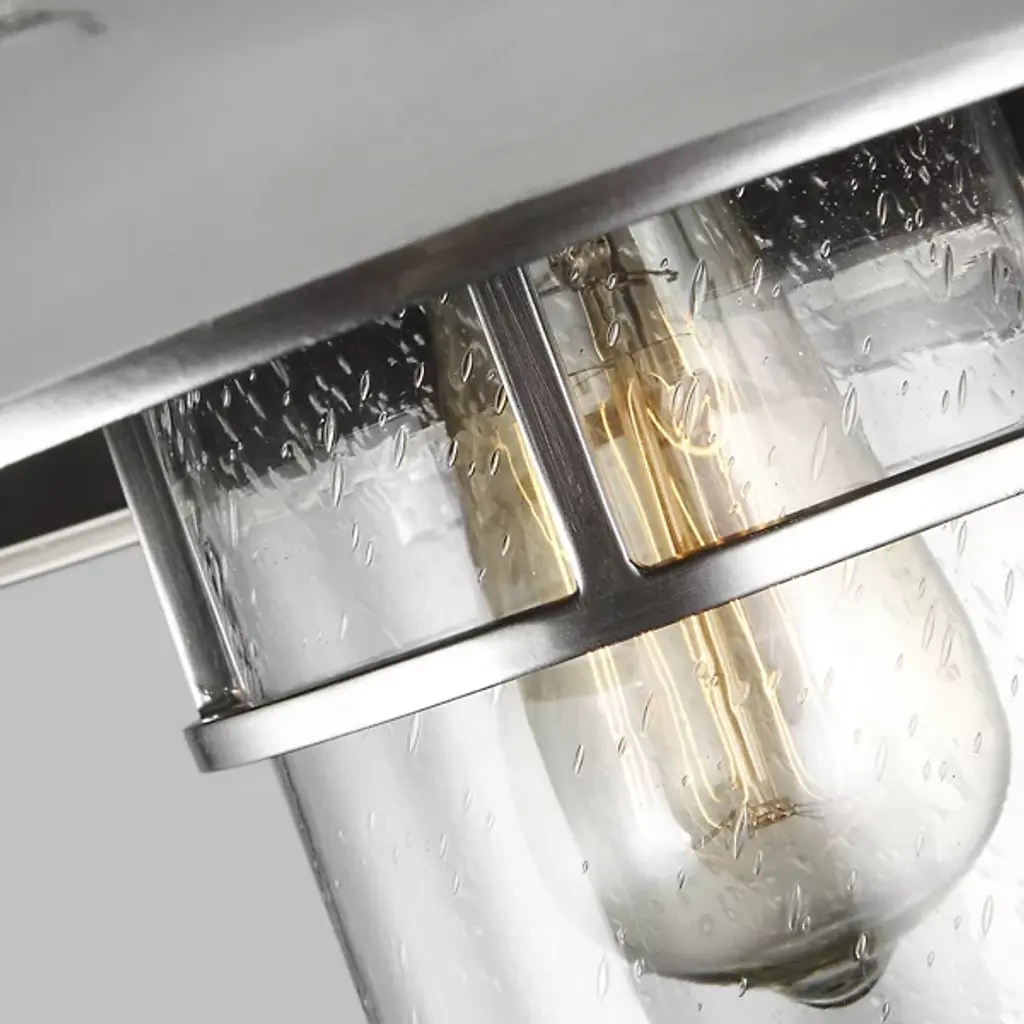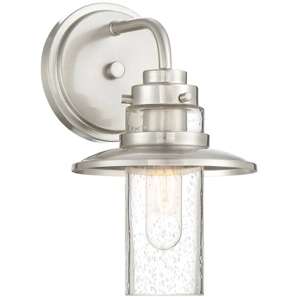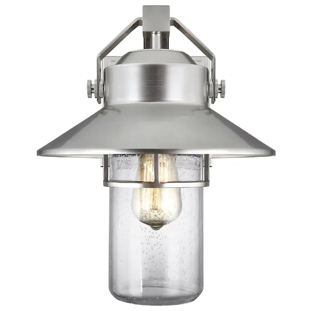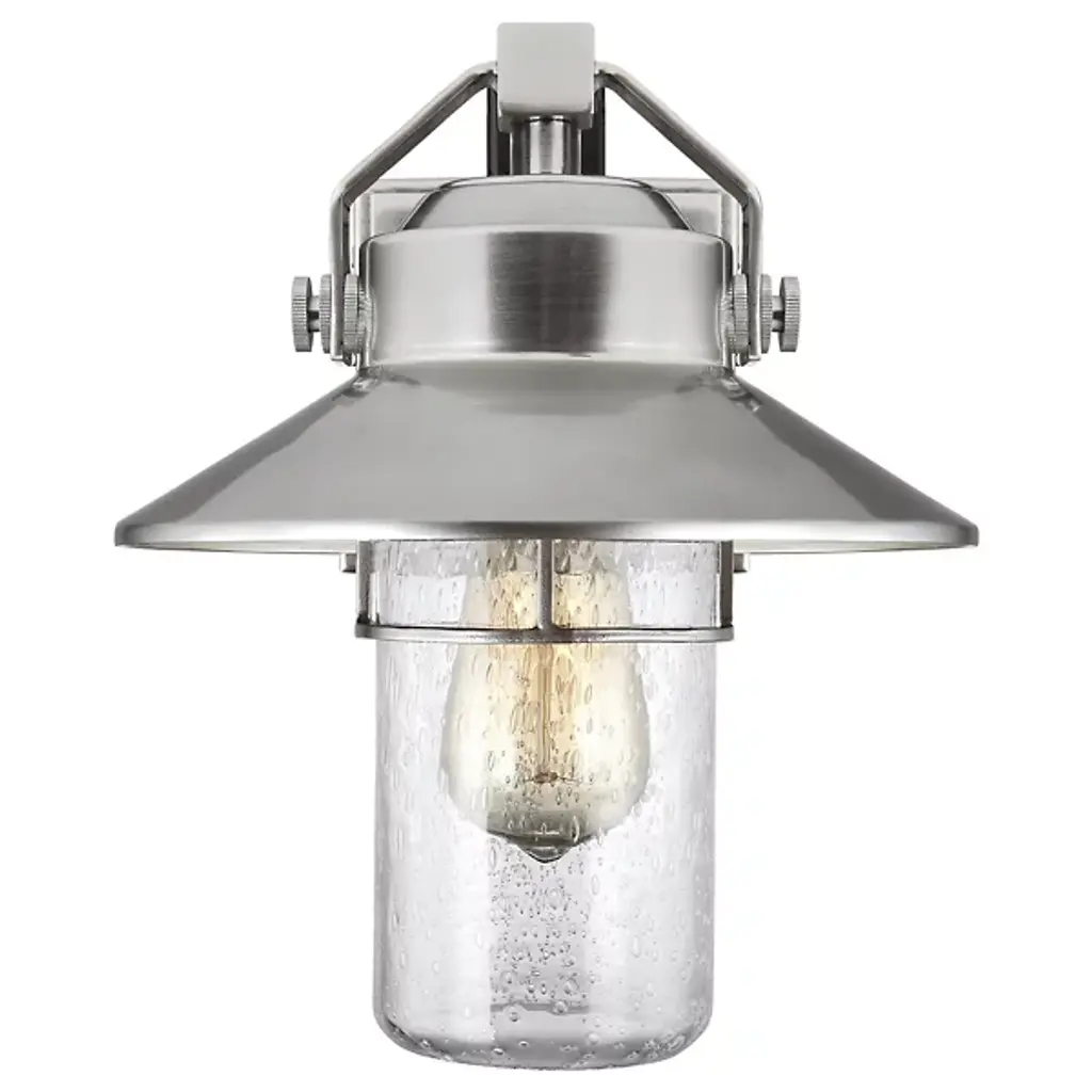 Inspired by nautical lighting, the Boynton Outdoor Wall Sconce by Visual Comfort Studio, formerly known as Sean Lavin, brings a distinct seaside warmth to your outdoor setting. Its familiar design features a tapered Brushed Steel body complete with knob accents and extension arms that angle up and into a square hub. A Clear Seeded glass shade suspends below the body, diffusing light from an inner tungsten Edison bulb for a dynamic, shimmering ambiance.