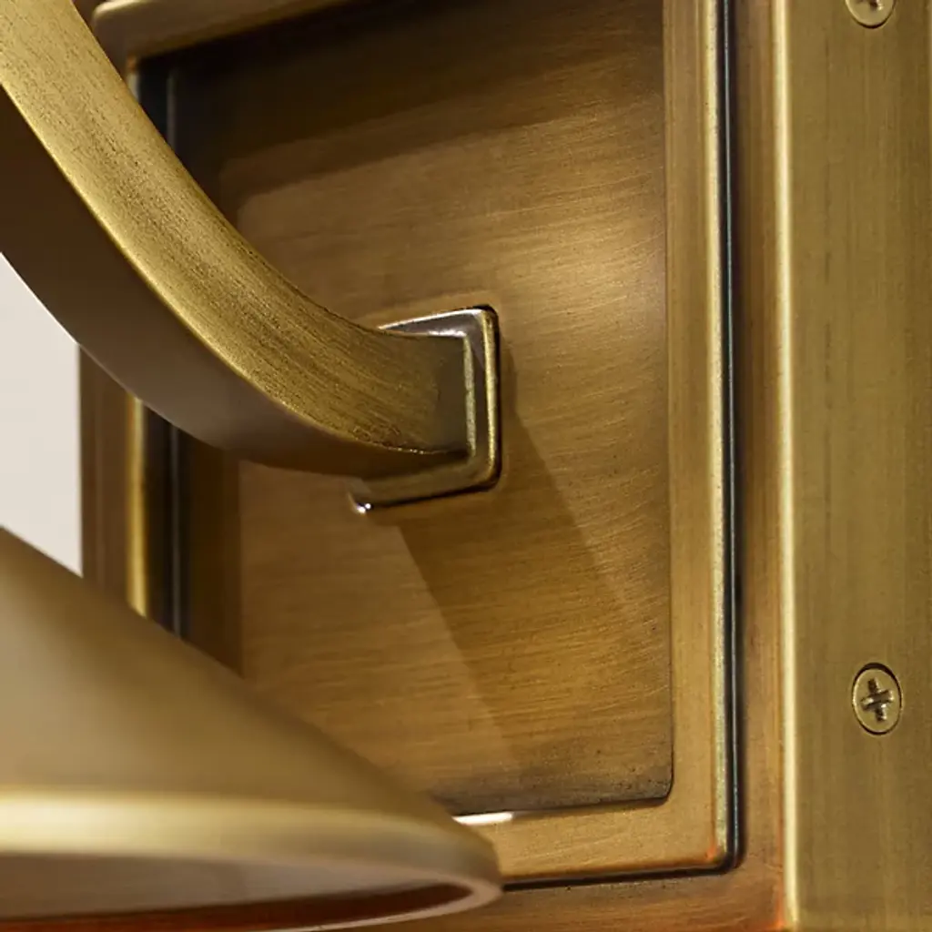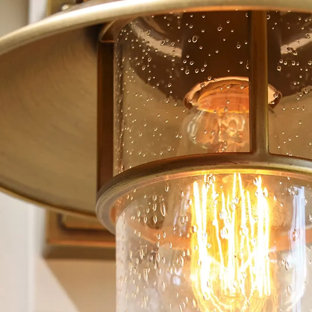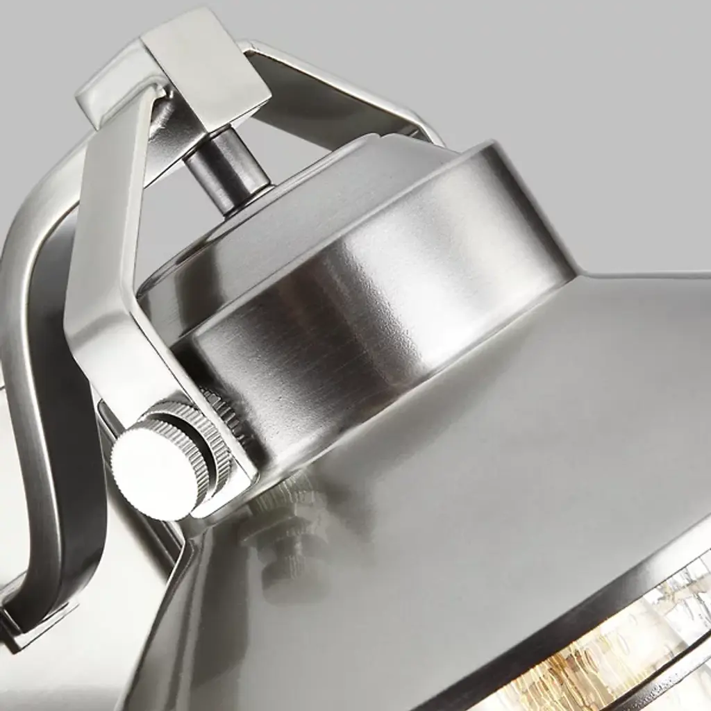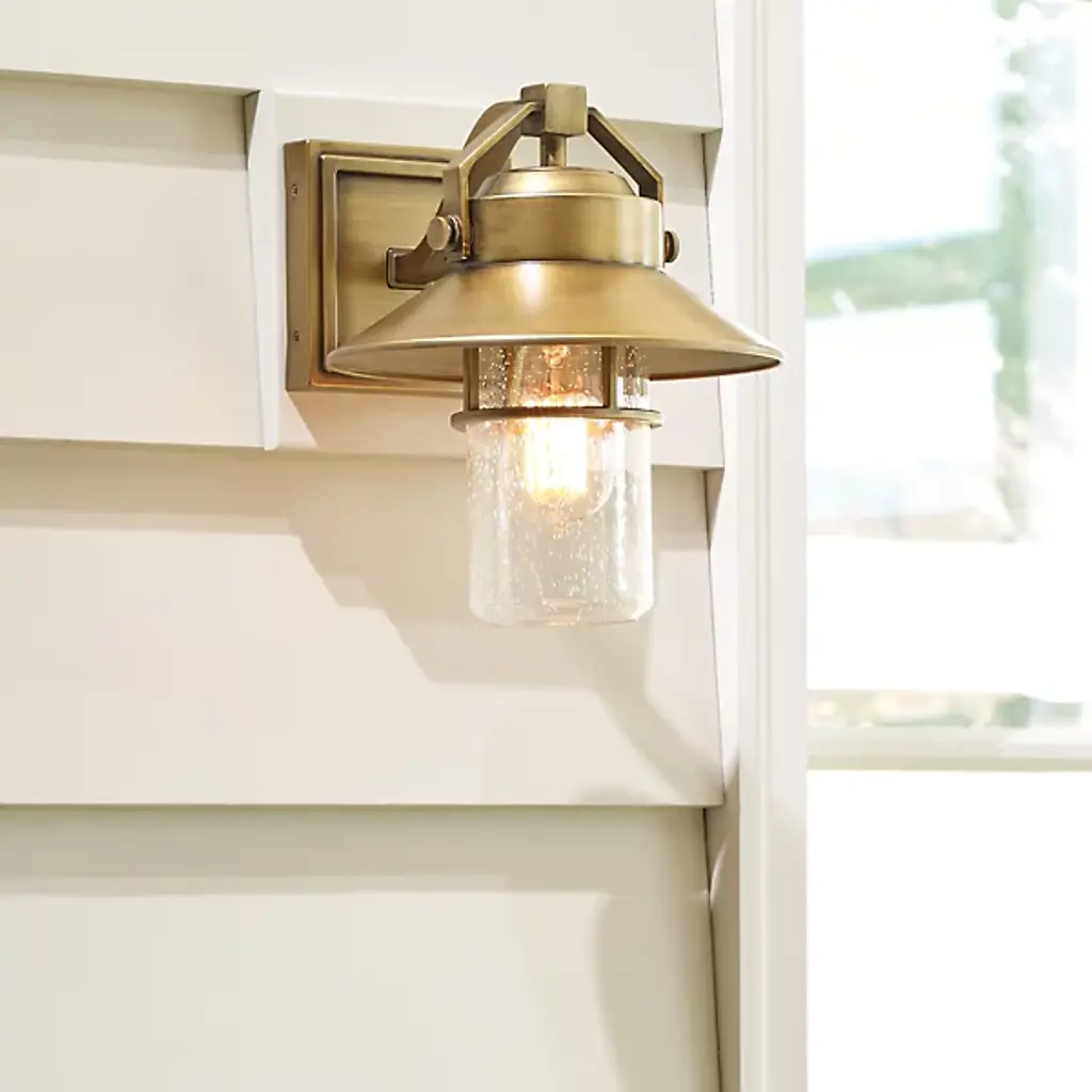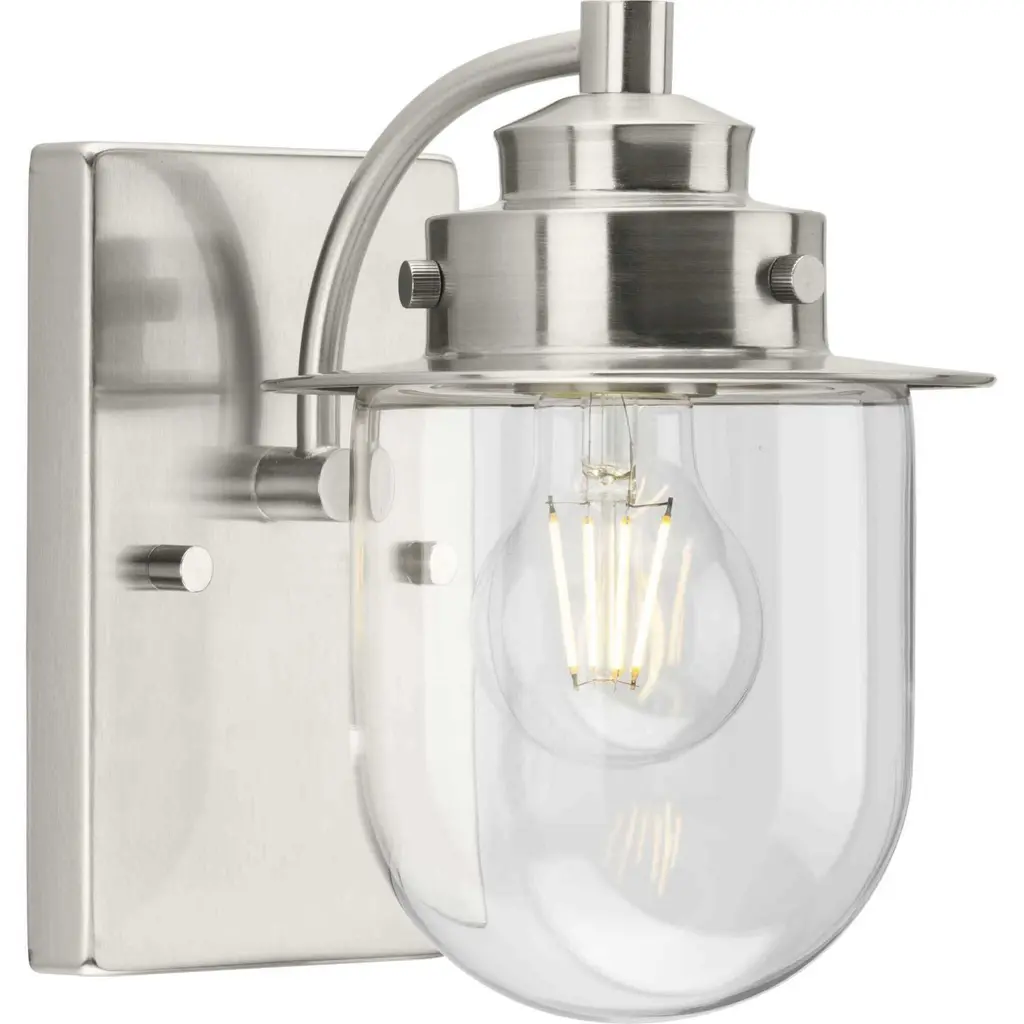 Inspired by nautical lighting, the Boynton Outdoor Wall Sconce by Visual Comfort Studio, formerly known as Sean Lavin, brings a distinct seaside warmth to your outdoor setting. Its familiar design features a tapered Brushed Steel body complete with knob accents and extension arms that angle up and into a square hub. A Clear Seeded glass shade suspends below the body, diffusing light from an inner tungsten Edison bulb for a dynamic, shimmering ambiance.