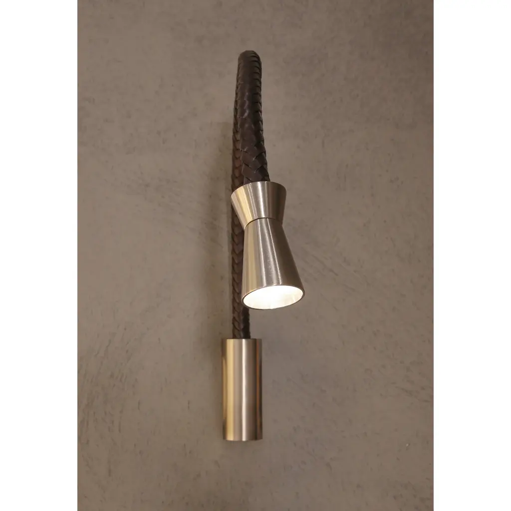 Introducing the Braided Leather Wall Lamp by Contardi G+T. This portable and luxurious reading lamp is perfect for yachts, historic buildings, and exclusive boutique stores. The head resembles a cocktail jigger, while the brass arm is encased in braided leather. Add a touch of elegance and functionality to your space with this innovative lamp.