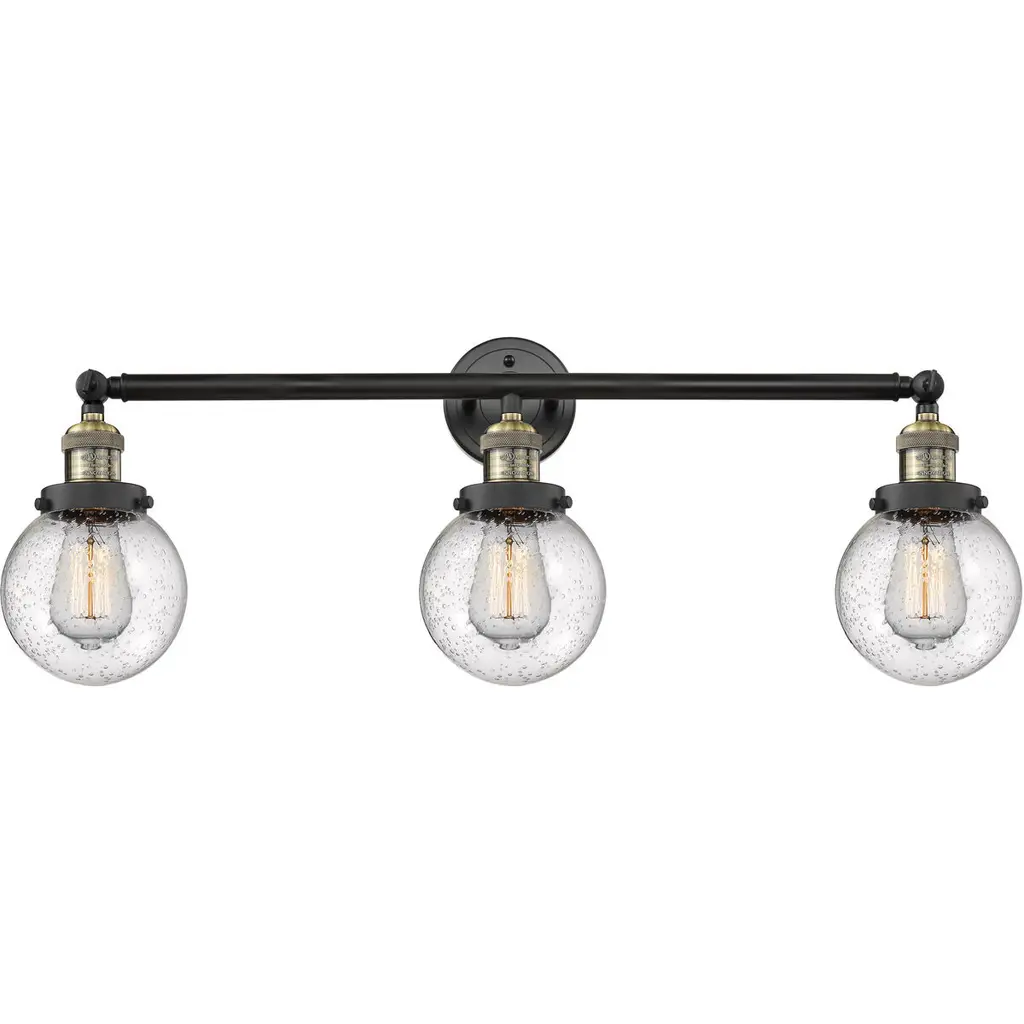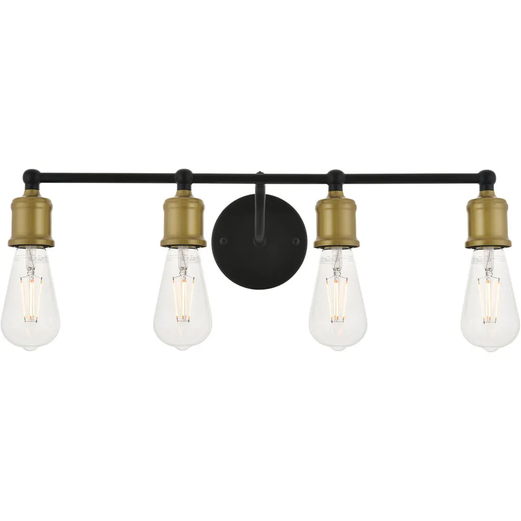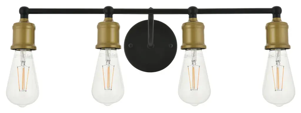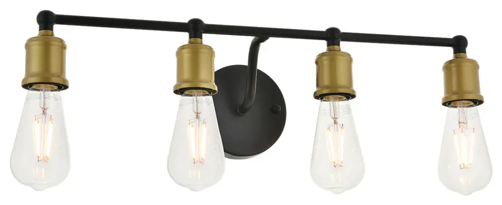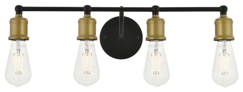 The delightful classical style with a minimalistic approach is seen in this 4-light brass and black finish wall sconce. A curving arm supports the light bulb that shines beautifully without obstruction. Its gentle demeanor makes this the perfect lighting piece for any room of your home--hallway, bedroom, or bathroom.Two-toned brass and black finish 4-light wall sconce with an undulating arm and circular back plateRequires 4 E26 bulbs (bulbs not included)Exposed bulbs (no shade)Wall sconce back plate finish: blackBack plate width: 4.7"; height: 1"Wall sconce extension: 6.3"assembly required: no