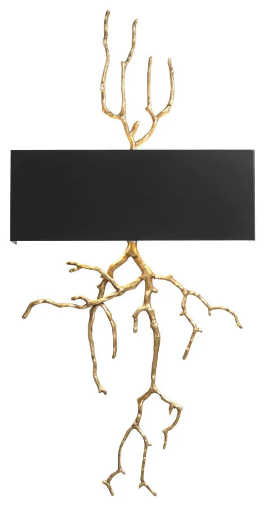 The Sorento Wall Lamp features a splendid design and striking appeal. Two twig-shaped limbs appear from behind a black fabric rectangular lamp shade. They are skillfully crafted from iron and provided with an antique brass finish.W16 x D5 x H33 in | Weight 9lbsMaterials | Brass | Iron2 Bulbs (not incl.): Max. 40W - E12 - 110 Volt