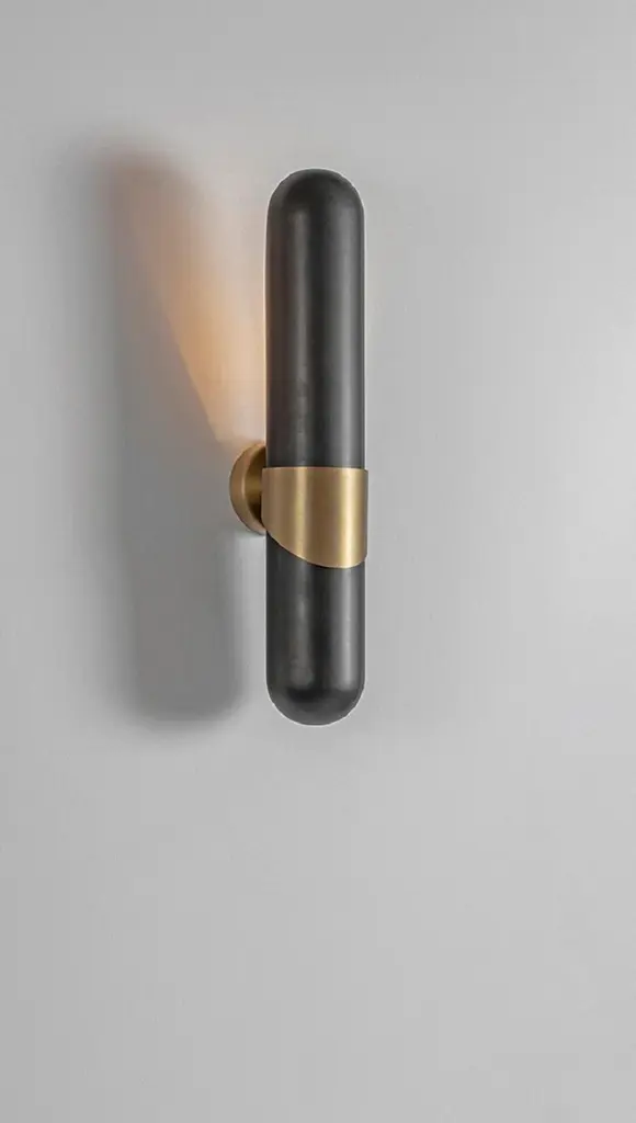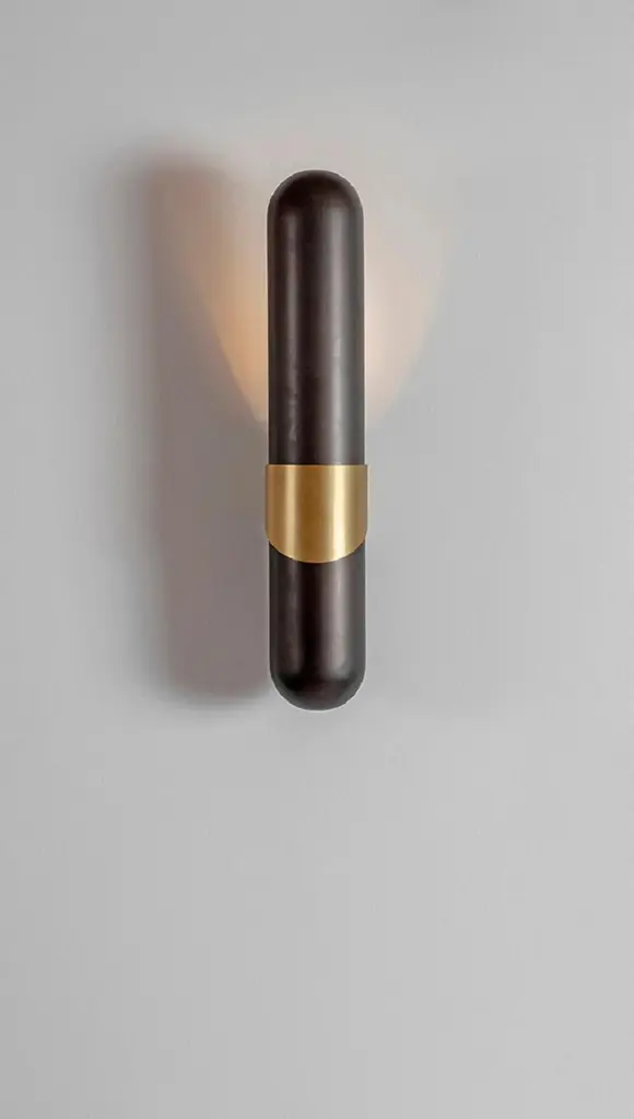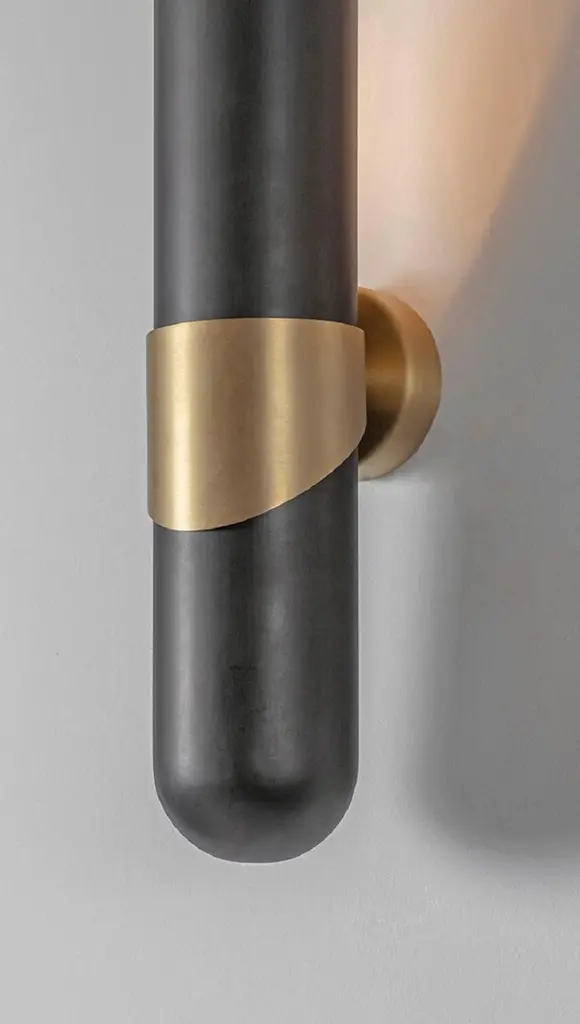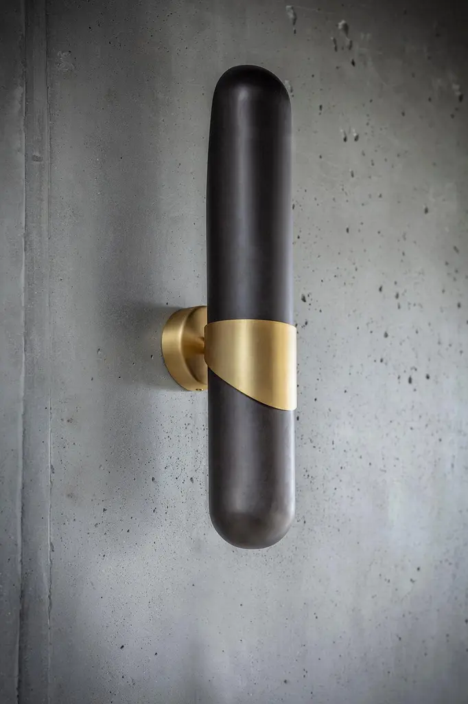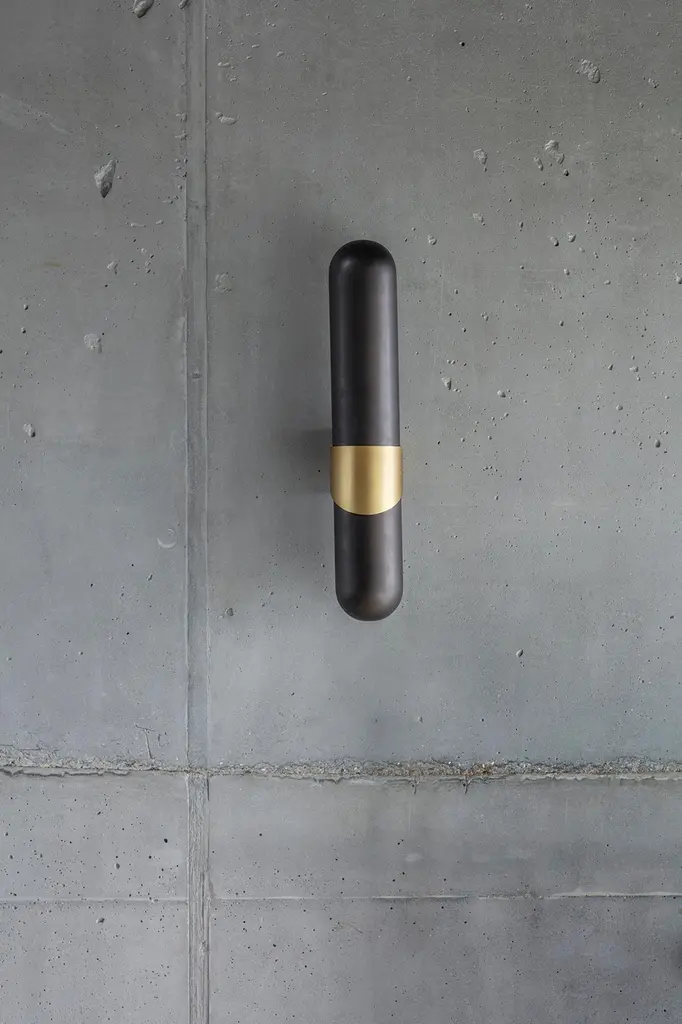 Brass Dream Wall Light by Square in CircleDimensions: W 8 x H 45 x D 12 cm.Materials: brushed brass finish, black powder coated metal.A cylindrical wall light with rounded edges on both sides, cut at the back to give an ambient glow close to the wall. The semicircular rounded ring is replicated to blend with the concept. The inner side of the light is brass finished to give a soft, inviting glow, whilst the outer side is black matt shop sprayed metal finish.Square In Circle is a London-based design studio founded in 2019. The studio explores lighting design in minimal, geometric forms inspired by the Modernist Era. Materials such as marble, metal and glass combine to make each sculptural piece a 'total and complete work of art', as in the manner of Gesamtkunstwerk.All our lamps can be wired according to each country. If sold to the USA it will be wired for the USA for instance.