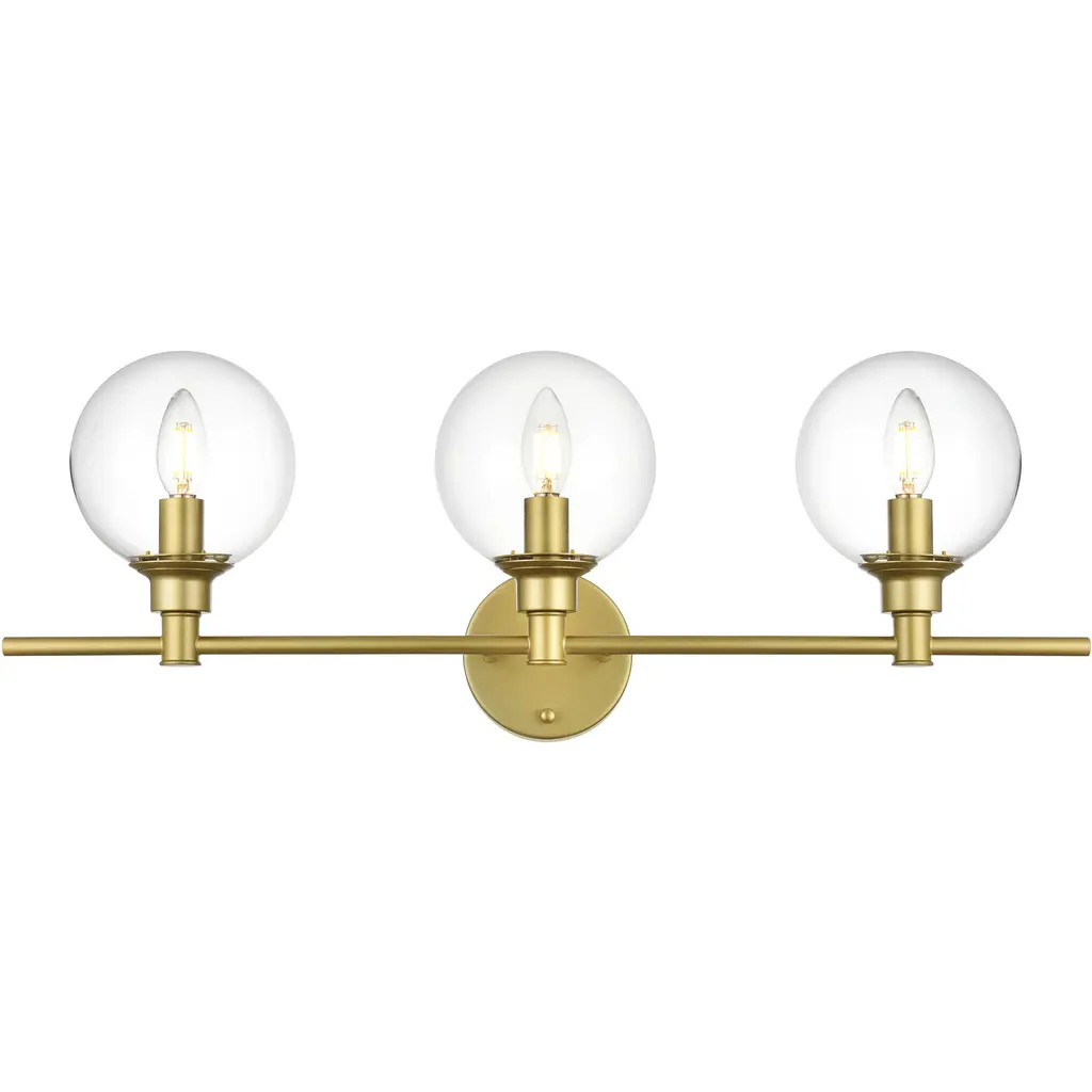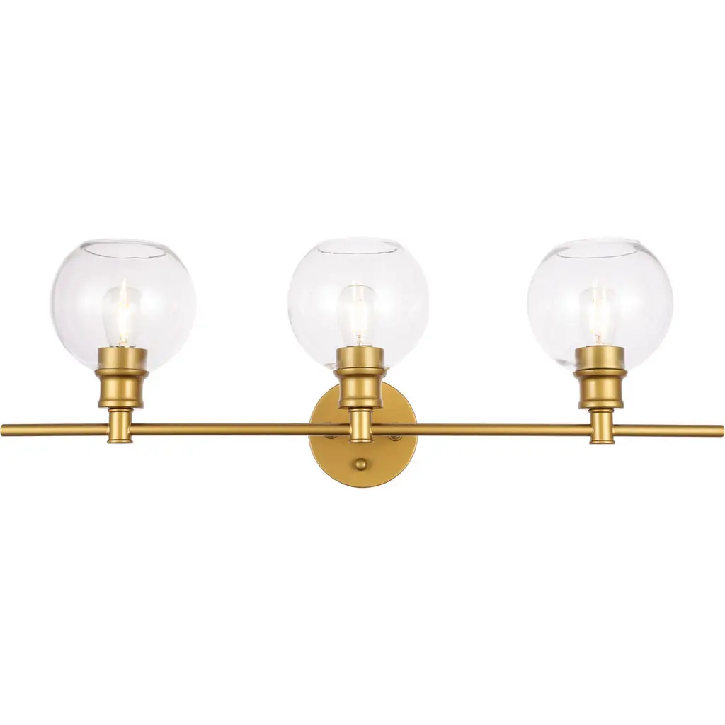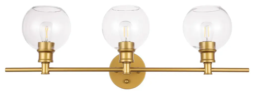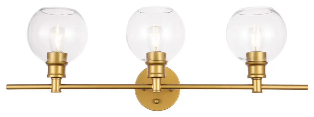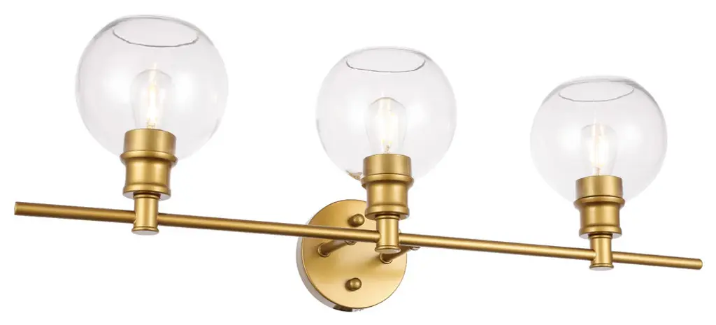 Elevate the contemporary style of your home with this midcentury modern wall sconce in a brass finish. The 3-lights within the spherical clear glass shades will create an illuminating spotlight, and its minimalistic clean-line style will subtly complement your room with sleek elegance--its versatile beauty seen in your choice of orienting the light facing up or down. Let this wall sconce shine in your home singularly or in a pair whether it''s in your hallways, bathroom, or powder room.Clean sleek lines and a minimalistic design that is a versatile fit for any aestheticHardware finish in brassClear glass ball shaped shade3 lights that illuminate down or upwards ; dimmableFixture material: iron and glasseasily mounted on wallLight bulb type: LED E26 (not included)