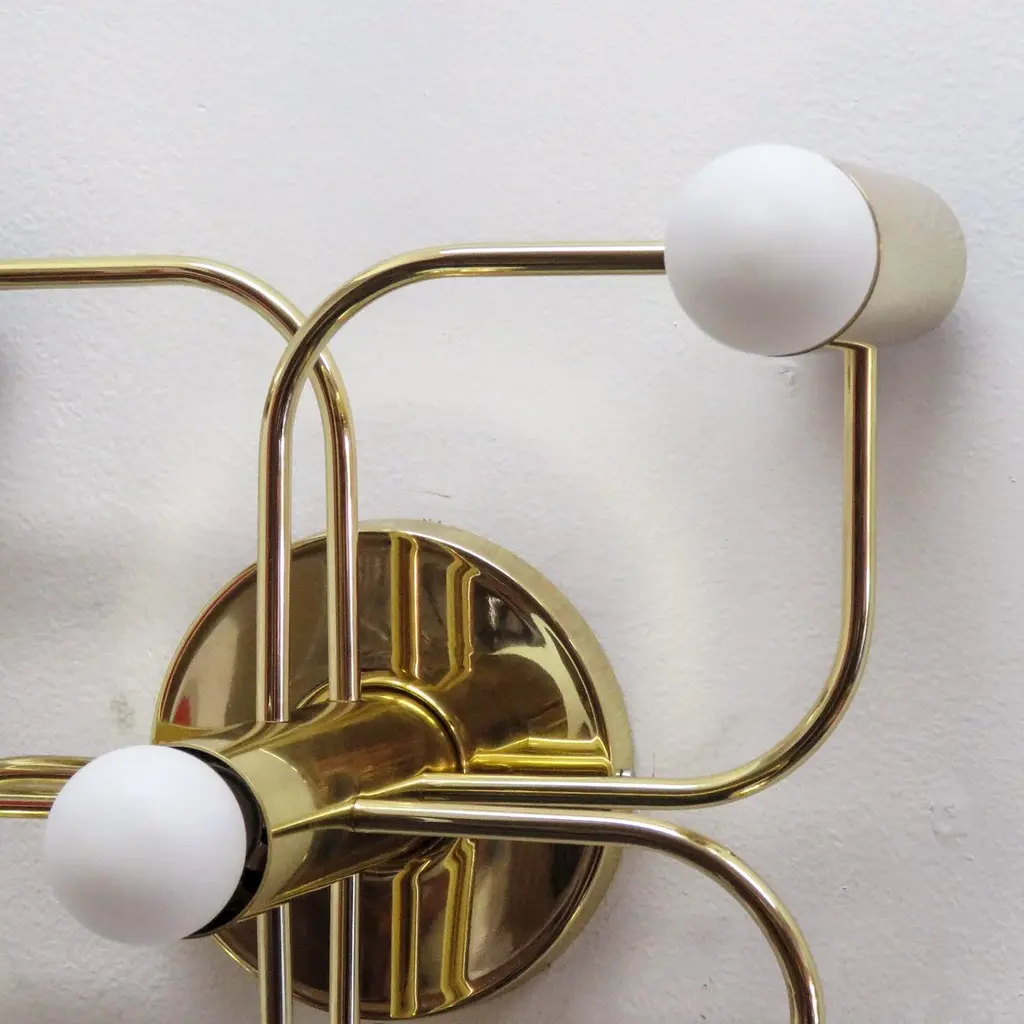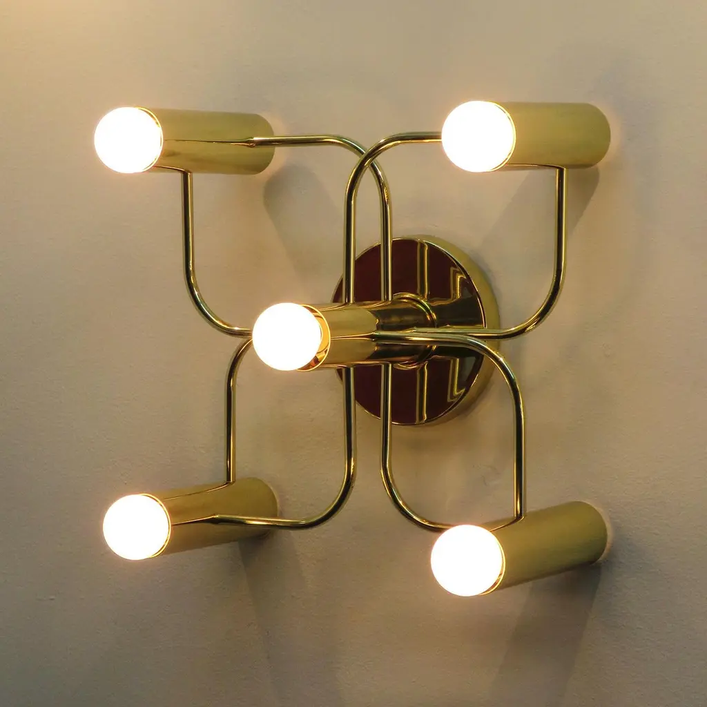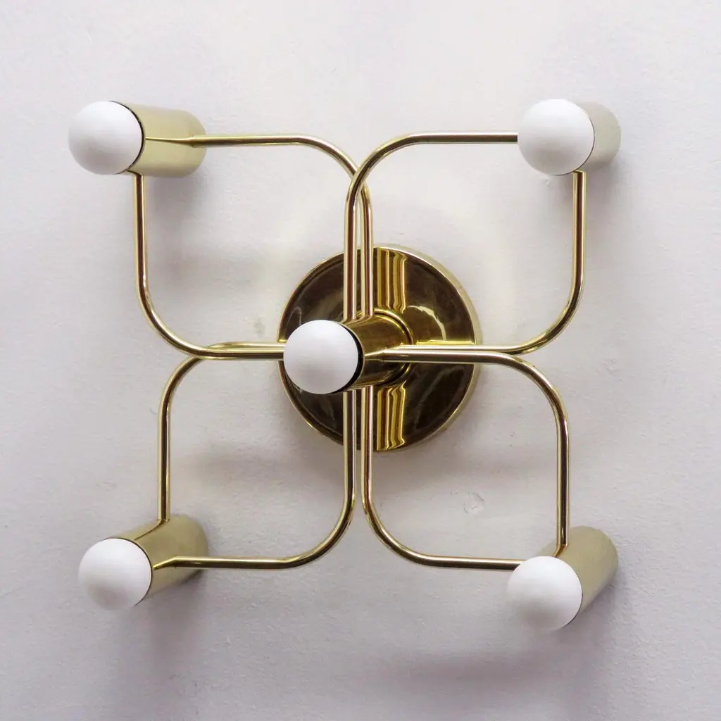 Wonderful German five-light polished brass flush mount lights, can be used as wall or ceiling lights. Wired for US standards, five E12 sockets per fixture, max. wattage 40w each, bulbs provided as a one time courtesy. Priced individually.
