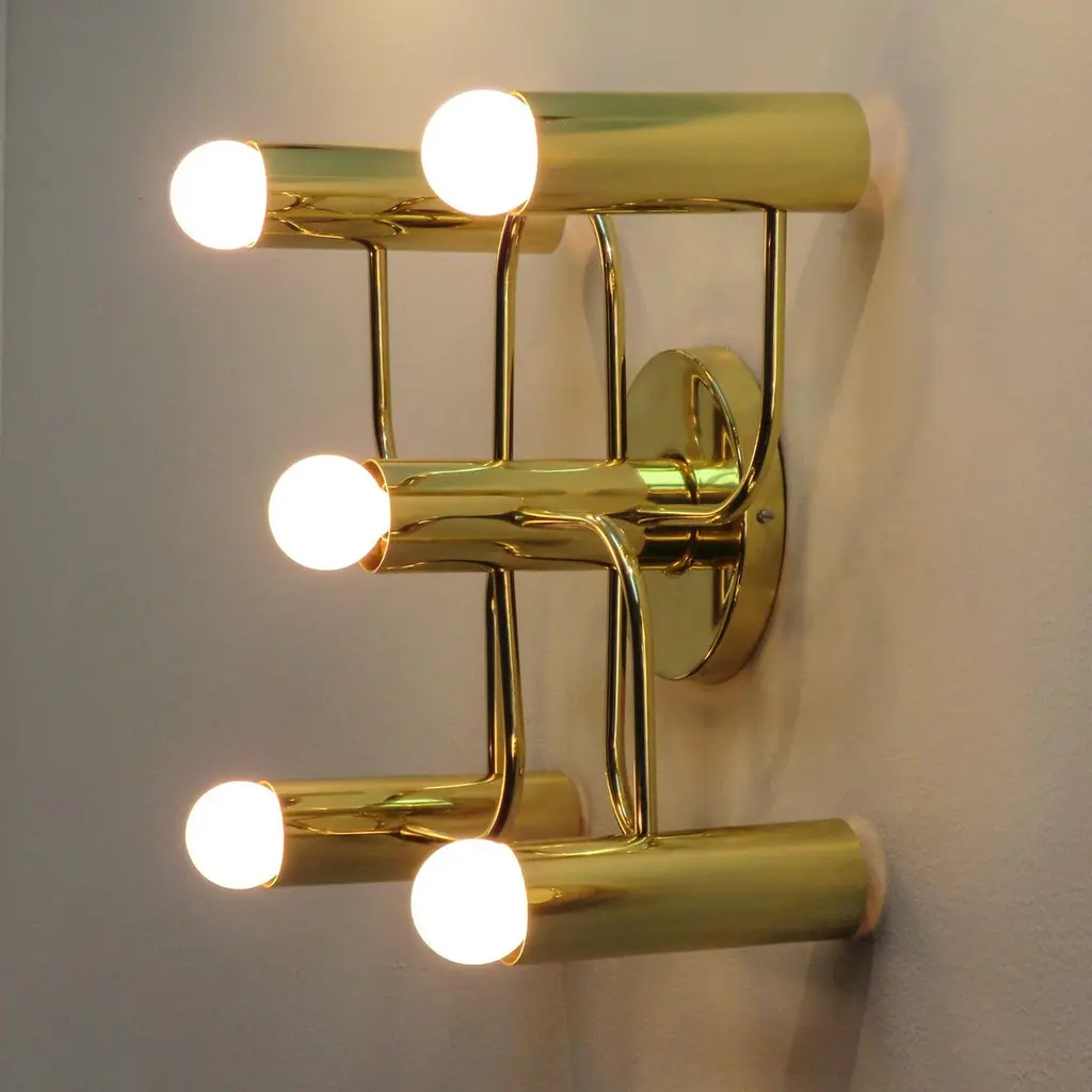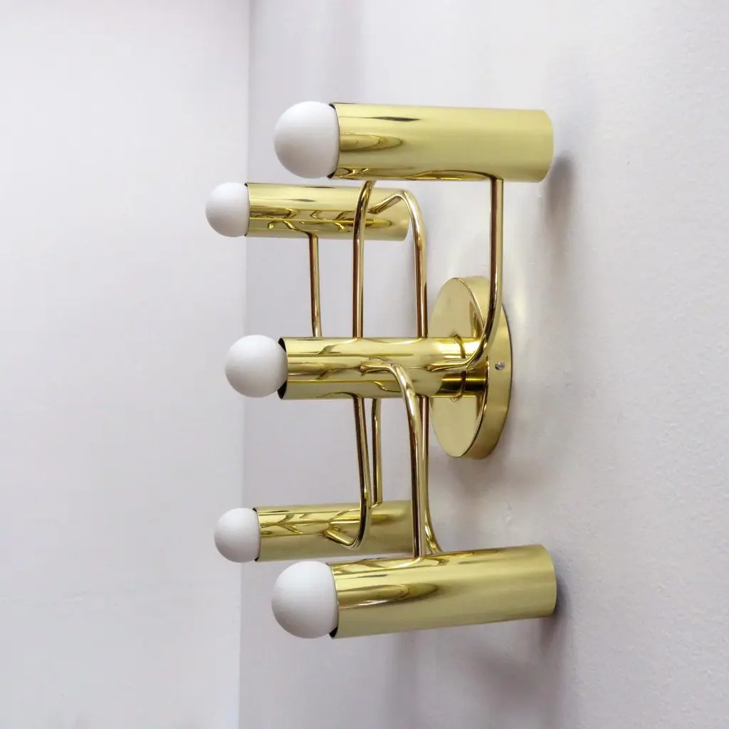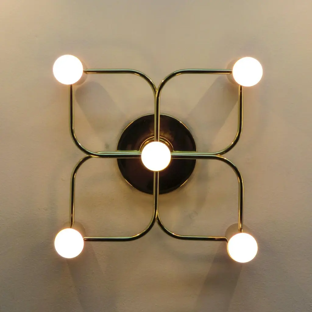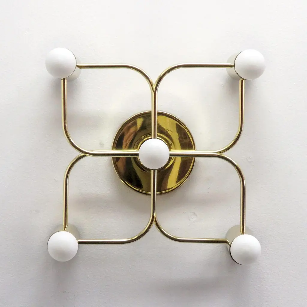 Wonderful German five-light polished brass flush mount lights, can be used as wall or ceiling lights. Wired for US standards, five E12 sockets per fixture, max. wattage 40w each, bulbs provided as a one time courtesy. Priced individually.