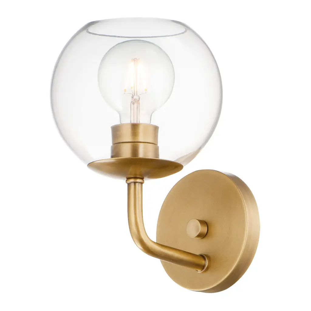 Illuminate your interior in contemporary style with the Jade Wall Lamp. This lovely indoor sconce is crafted from iron in an antique brass finish and topped with a clear glass globe shape. Equally at home in your bedroom, hallway, lounge or dining room.