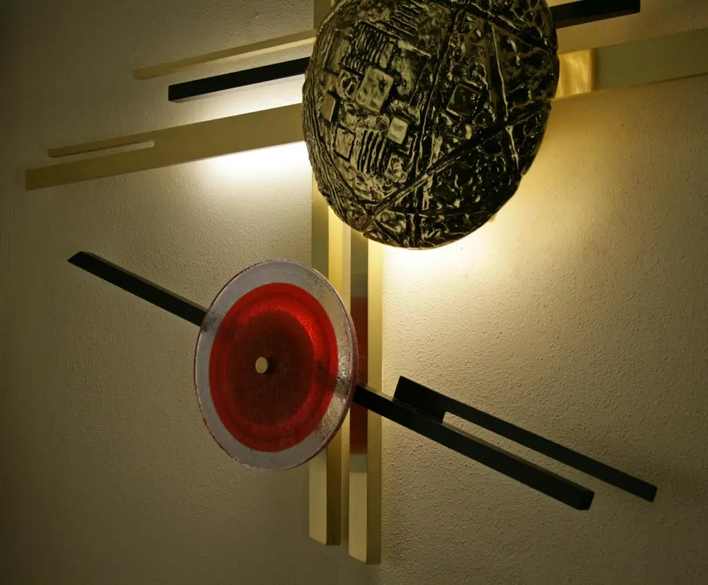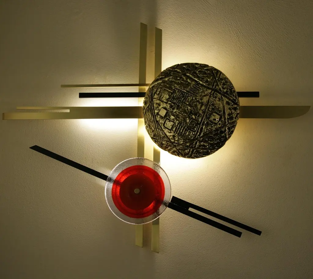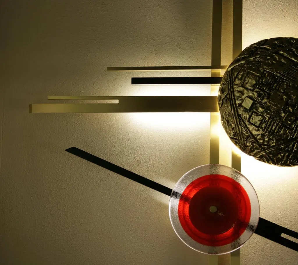 Murano glass "Natalia" floor lamp, Angelo BrottoDimensions: 86 x 5 x 65cmMaterials: brass, ironInspired by Kandinskij's paintings. Luminous wall sculpture in iron, brass and cast brass. Also available in the version with red Murano glass disk.