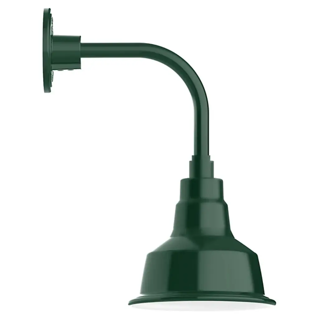 Bring industrial chic to your outdoor walls with the Brea Outdoor Curved Arm Wall Sconce from Alder & Ore. Based around 1920s industrial fixtures and starting with a sleek circular wall mount, this fixture extends a curving stem downward, seating a potent, wet-listed lamp inside a flaring shade made from spun aluminum, which adds physical strength to an elegant profile. The shade’s dark, matte exterior of polyester powder contrasts well with a reflective interior that blocks the bright glare from the side while distributing a warm glow through its open base.