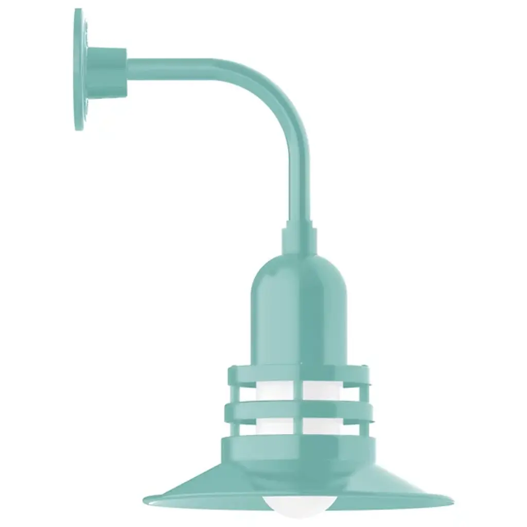 Bring industrial chic to your outdoor walls with the Brea Outdoor Curved Arm Wall Sconce from Alder & Ore. Based around 1920s industrial fixtures and starting with a sleek circular wall mount, this fixture extends a curving stem downward, seating a potent, wet-listed lamp inside a flaring shade made from spun aluminum, which adds physical strength to an elegant profile. The shade’s dark, matte exterior of polyester powder contrasts well with a reflective interior that blocks the bright glare from the side while distributing a warm glow through its open base.
