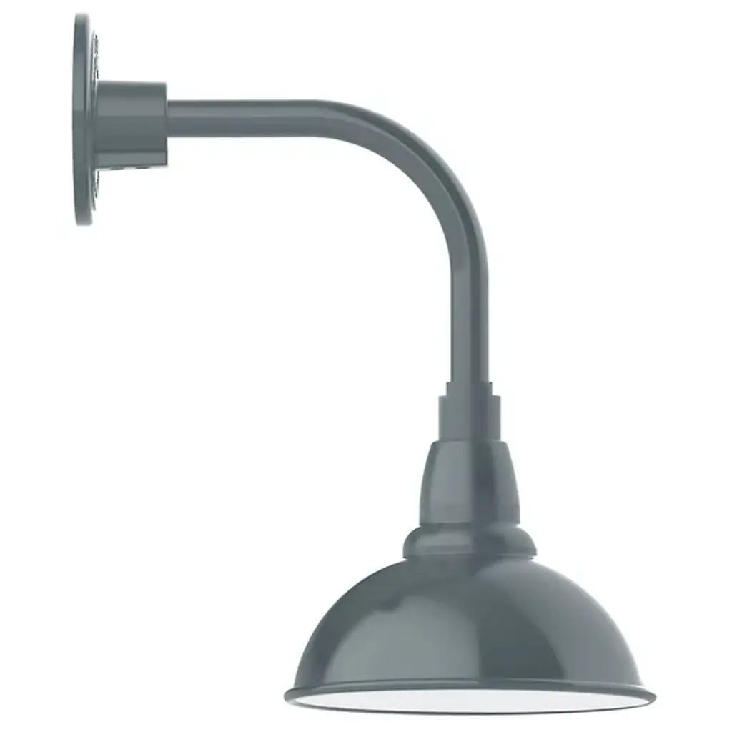 Bring industrial chic to your outdoor walls with the Brea Outdoor Curved Arm Wall Sconce from Alder & Ore. Based around 1920s industrial fixtures and starting with a sleek circular wall mount, this fixture extends a curving stem downward, seating a potent, wet-listed lamp inside a flaring shade made from spun aluminum, which adds physical strength to an elegant profile. The shade’s dark, matte exterior of polyester powder contrasts well with a reflective interior that blocks the bright glare from the side while distributing a warm glow through its open base.