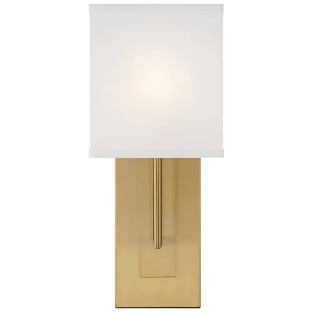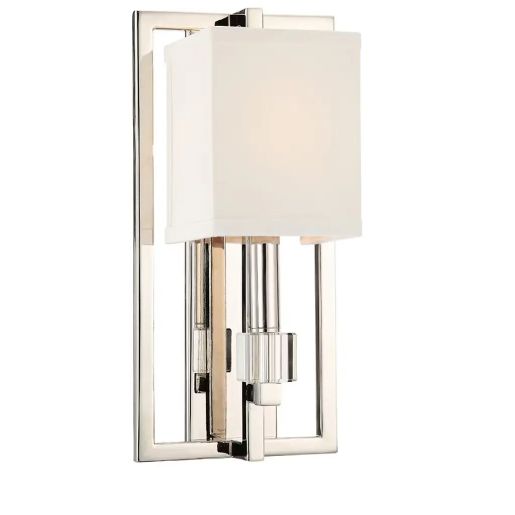 The Brent Wall Sconce by Crystorama is a cool and contemporary addition to spaces. Topped with a crisp, rectangular, silk shade, this wall sconce features a simply structured body that is dressed up with a bold mix of finishes. With clean lines, a single-arm is anchored by a sleek, layered, rectangular wall plate for a minimalistic look that mixes and matches with a range of décor and design styles to bring rooms a bright touch.