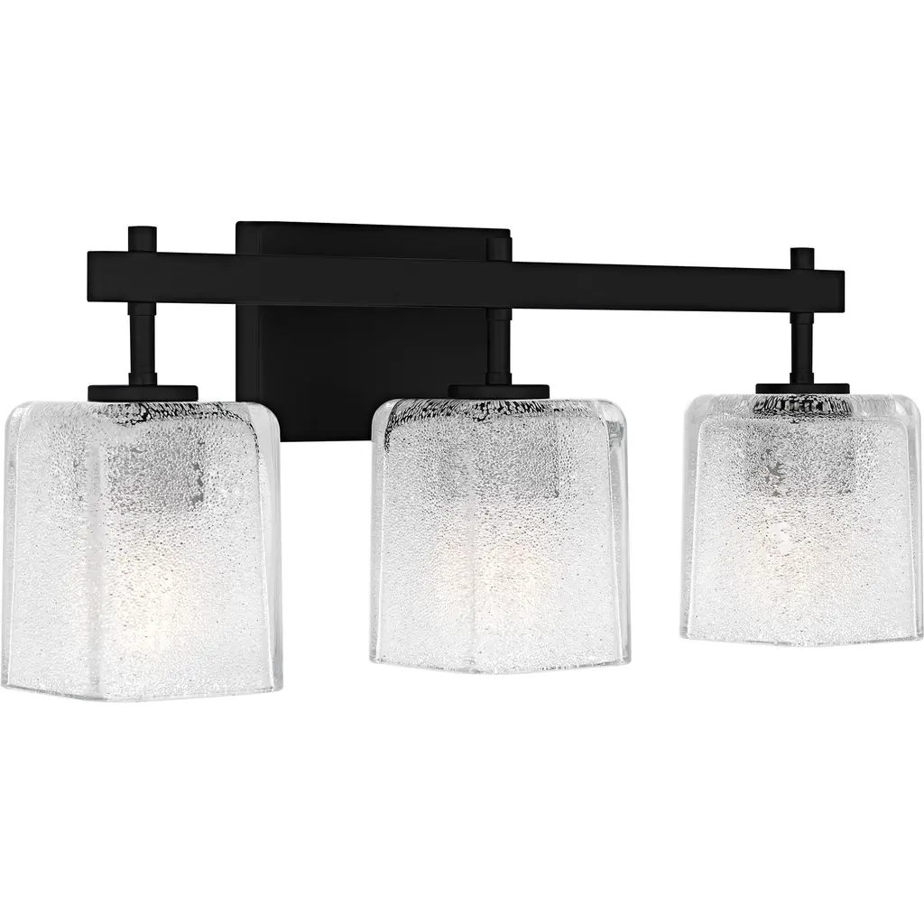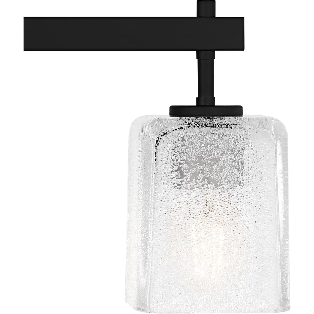 The Brenthouse bath light features a clean, minimalist design with a striking visual impact. Square glass shades cast a soft, diffused glow while adding a touch of texture to the simple silhouette. The thick glass shades feature tiny crystals on the inside, creating a look reminiscent of sparkling sand. The vanity light's slender metal frame, available in a versatile matte black or brushed nickel finish, complements a variety of bathroom styles.
