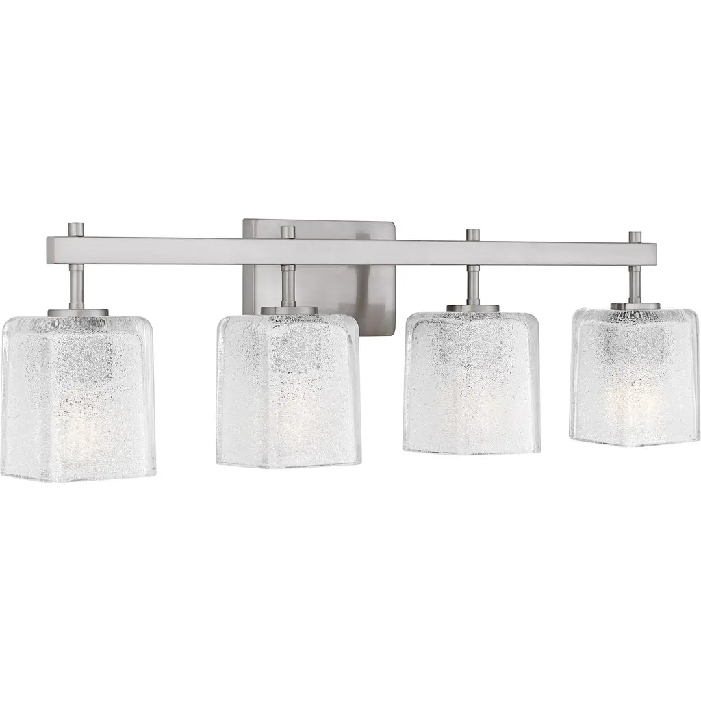 The Brenthouse bath light features a clean, minimalist design with a striking visual impact. Square glass shades cast a soft, diffused glow while adding a touch of texture to the simple silhouette. The thick glass shades feature tiny crystals on the inside, creating a look reminiscent of sparkling sand. The vanity light's slender metal frame, available in a versatile matte black or brushed nickel finish, complements a variety of bathroom styles.