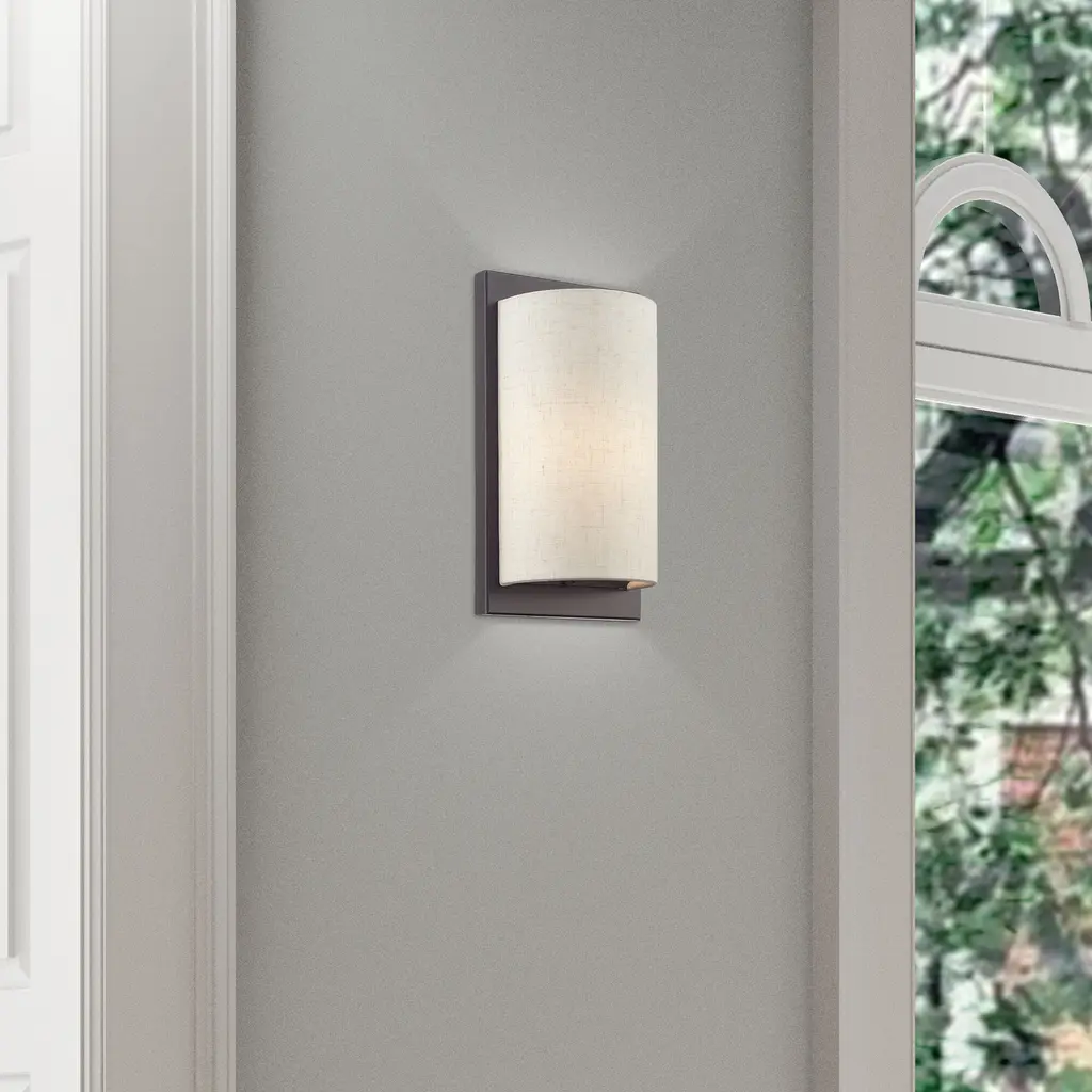 The timeless, transitional style Brenton ADA wall sconce is great for any style of decor. A hand crafted oatmeal fabric hardback shade is paired handsomely with an English bronze finish, so you can give your home warm, even illumination. Perfect for entry