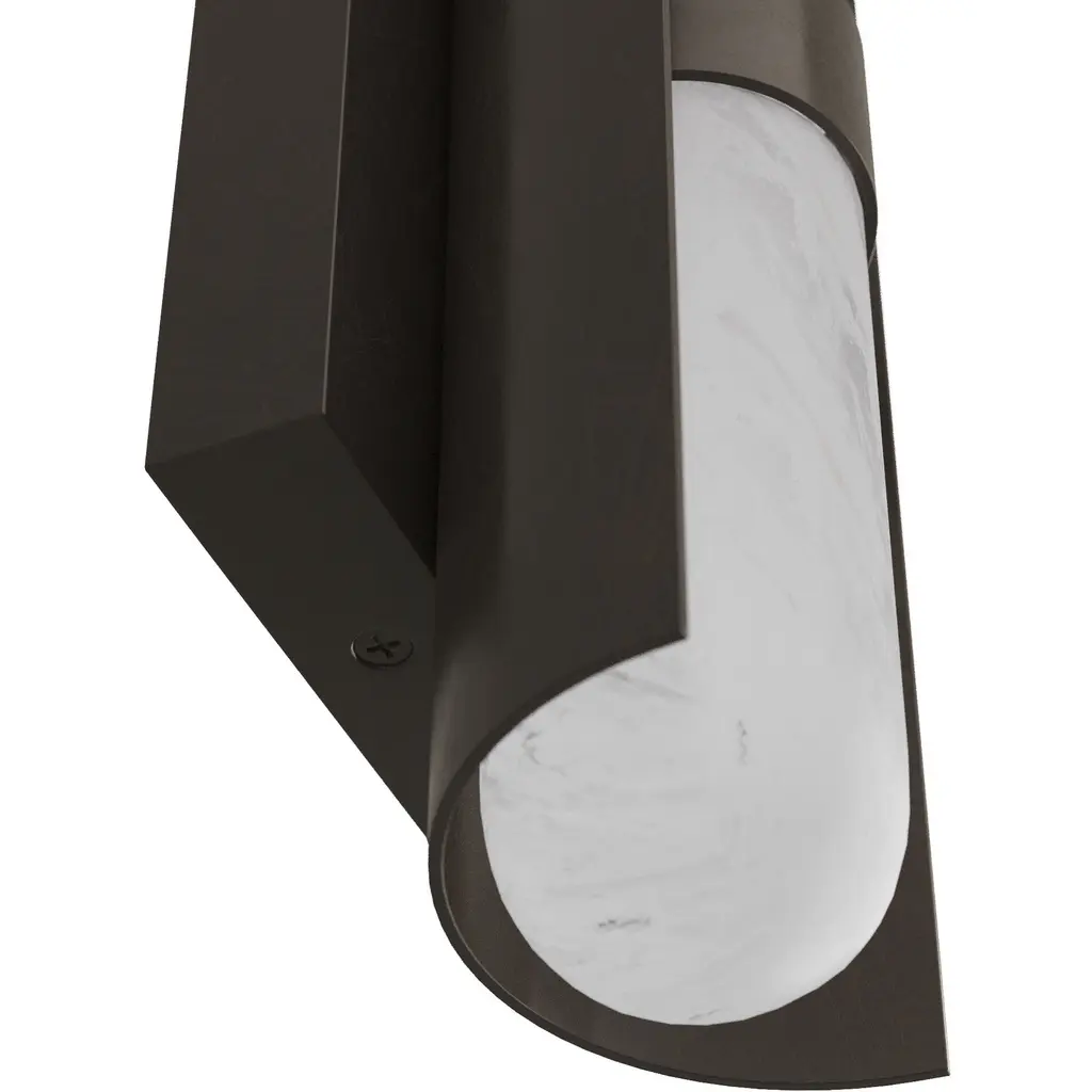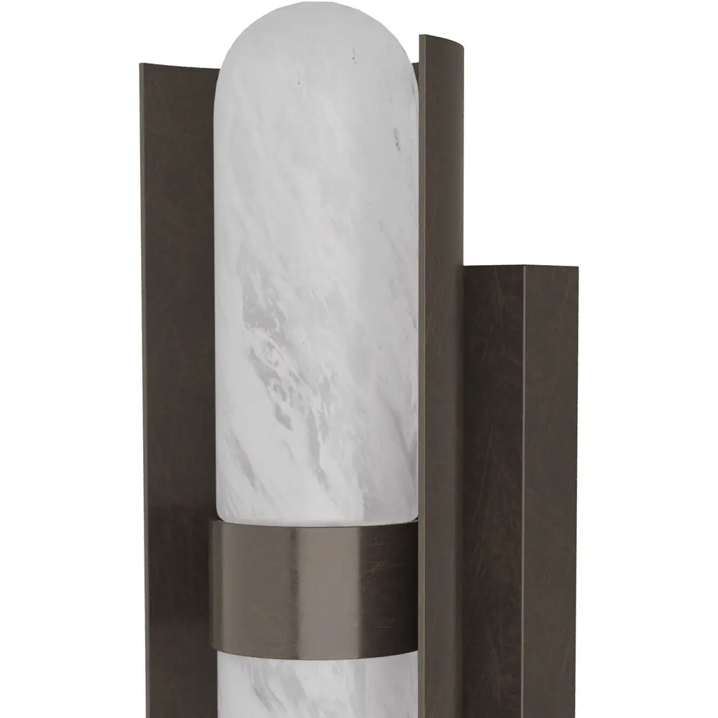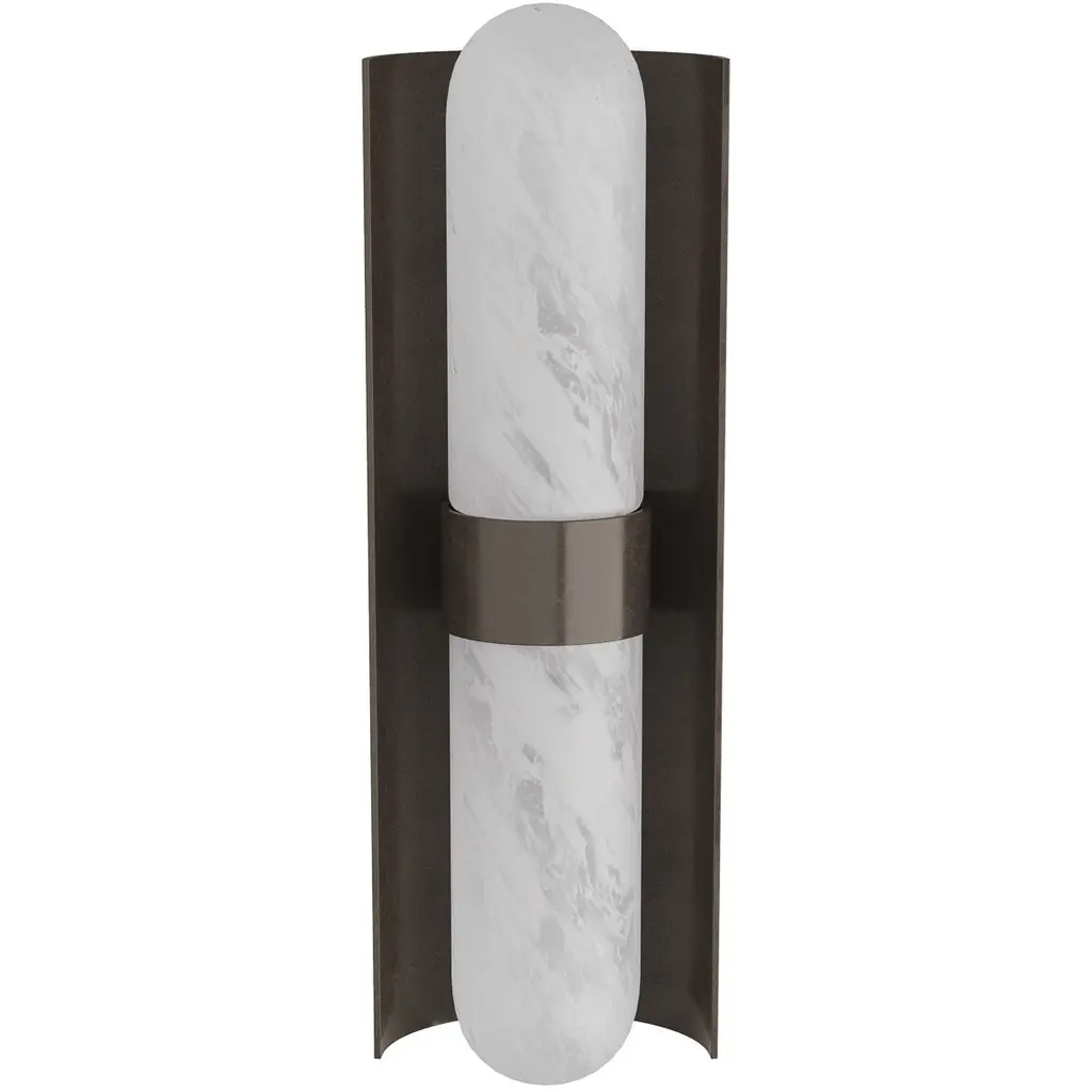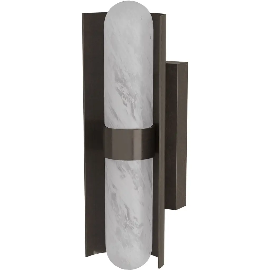 Brilliantly simple, this sconce of tubular glass in a matte swirled finish with a steel backplate of English bronze provides an elegant glow. The curved lines and burnished finish of the integrated LED design recall Deco furnishings, yet the technology is completely modern. Damp-rated, although limited covered outdoor conditions may affect finish. Finish will vary.