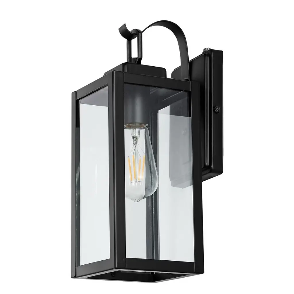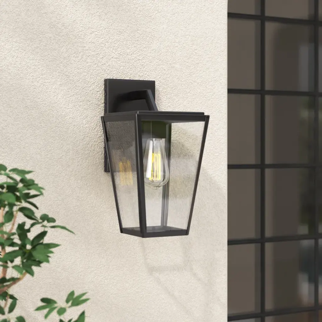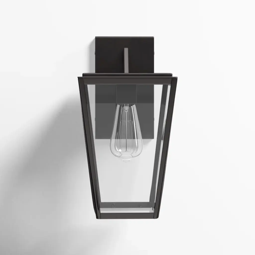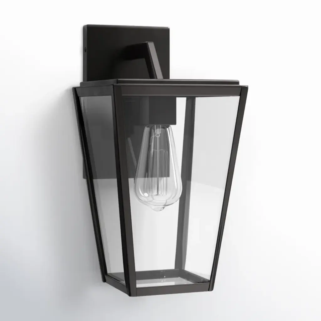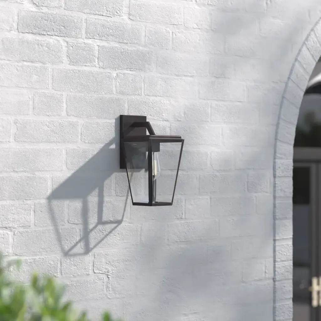 This wall lantern takes the classic rectangular shape and adds an edgy, angular geometric silhouette we love. It's made from metal with a sleek English bronze finish that's warm and welcoming. The tapered trapezoidal shade has clear glass panels on each side, which filter light from a single E26 bulb (sold separately). Best of all, this light is safe to use in damp locations and compatible with dimmer switches, so it's great for welcoming guests on a covered entryway or even adding ambiance to a relaxing shower in the bathroom.