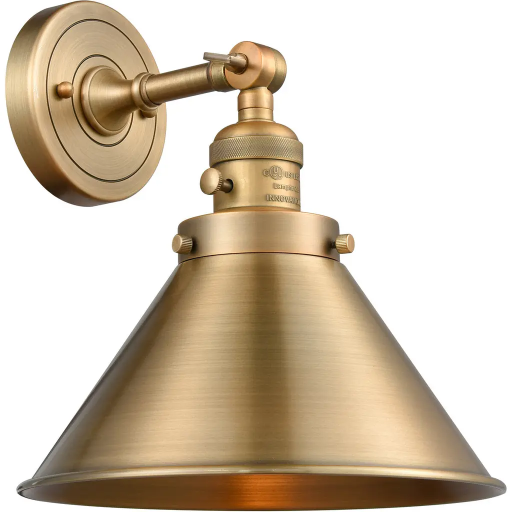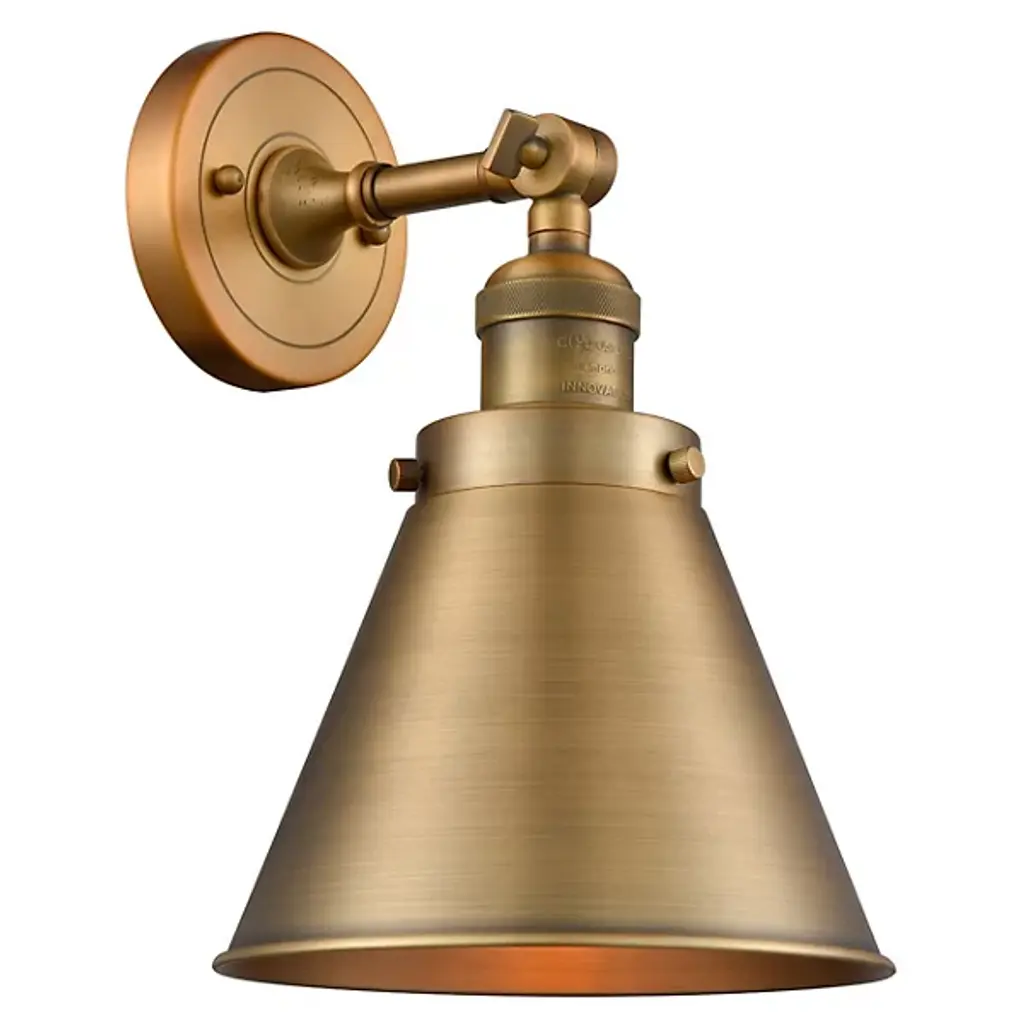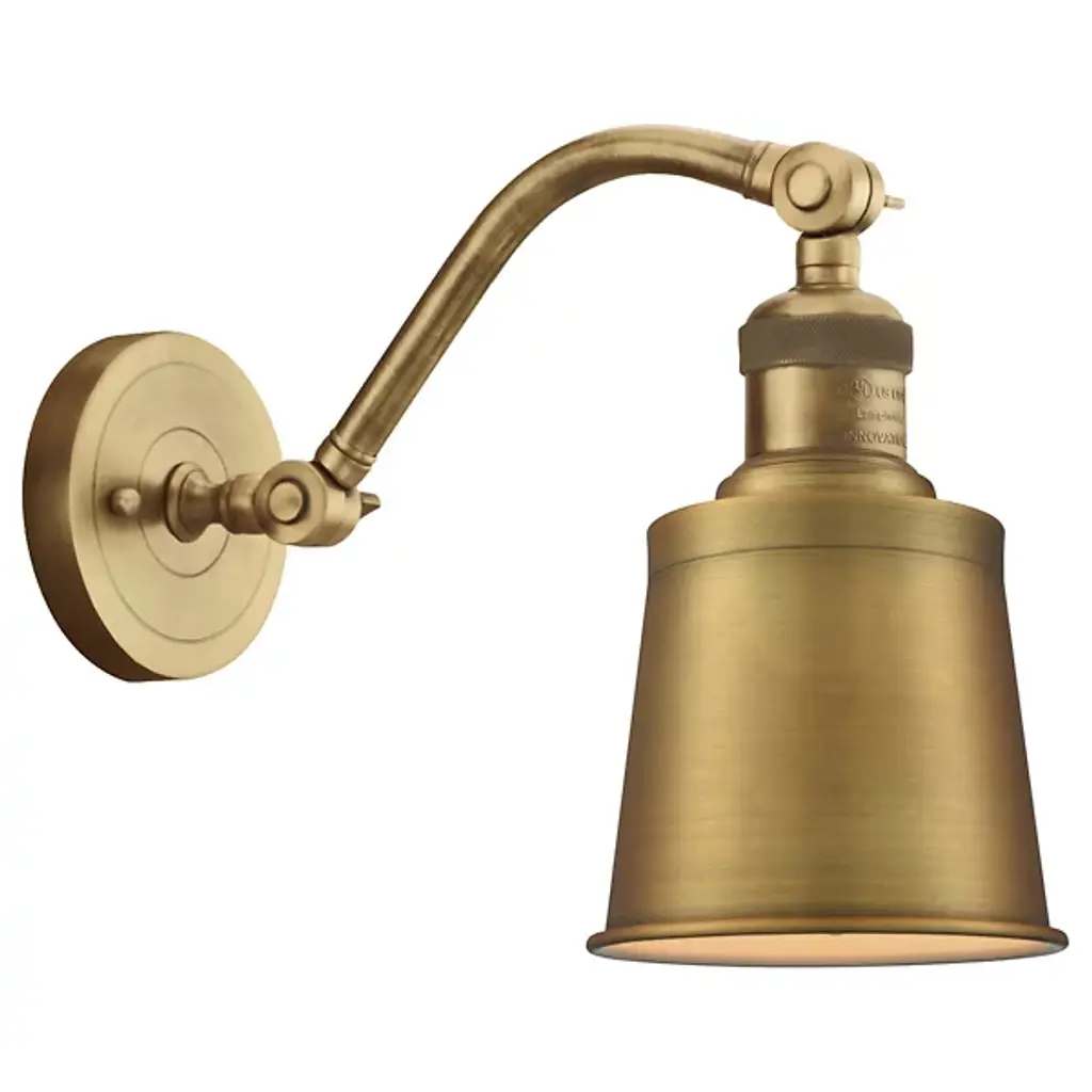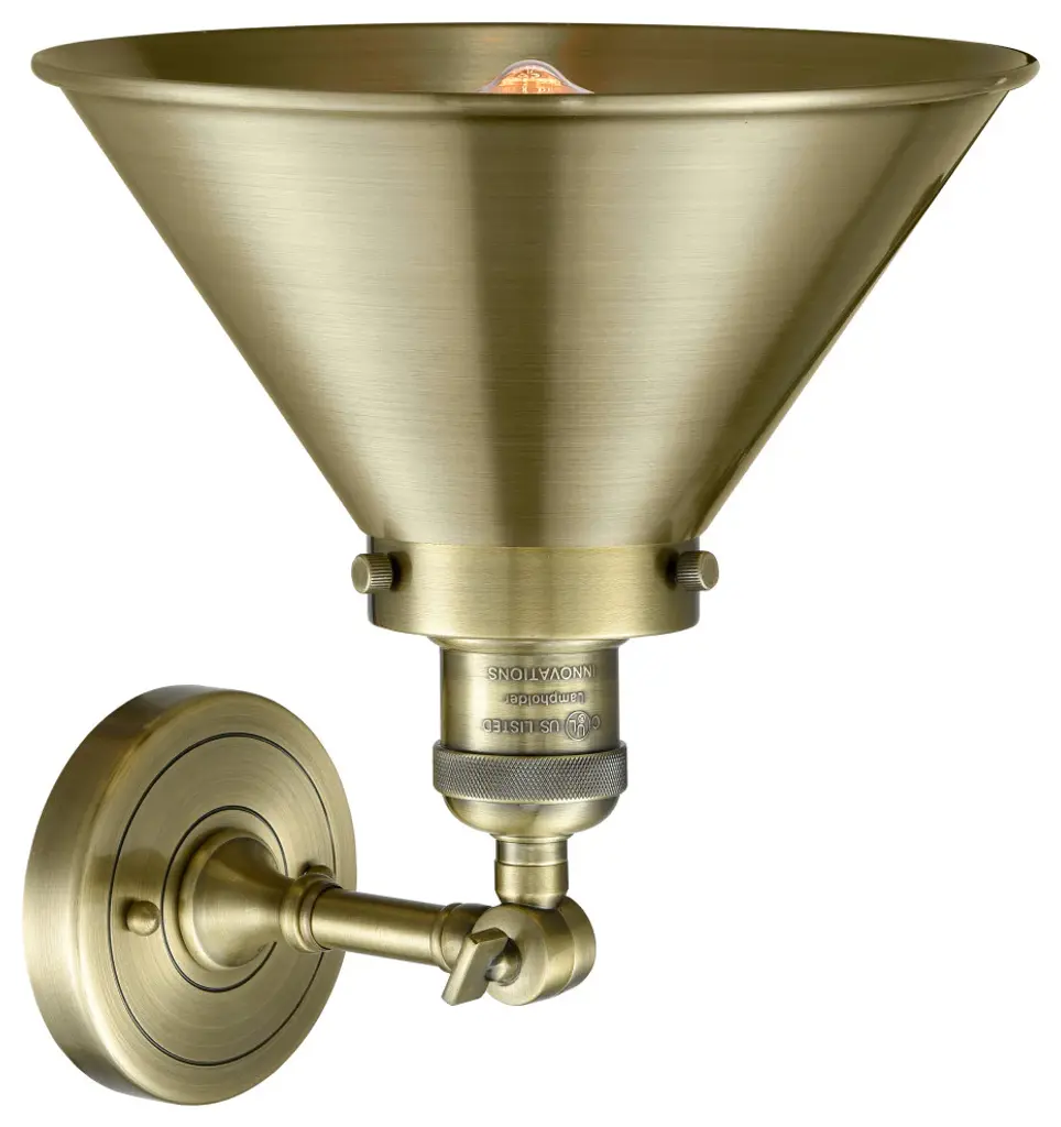 One of our largest and original collections, the Franklin Restoration is made up of a vast selection of heavy metal finishes and a large array of metal and glass shades that bring a touch of industrial into your home.Features:Solid brass 180 degree adjustable swivel with internal teeth that lock in at 5 degree intervals, and engraved cast cupFixture can be hung with bulbs facing up or down as a wall mount, or facing down as a ceiling mount4.5 inch 2mm heavy cast backplateThe interior finish of the shade matches the exterior finish of the shadeDistance from outlet opening to top of fixture 2.25 inchRated for 100 watt maximumUL/CUL and ETL/CETL damp ratedCompatible with incandescent, LED, fluorescent and halogen bulbsNumber of Bulbs: 1Bulb Wattage: 60Bulb Type: IncandescentBulb Included: NoVoltage: 120Finish: Antique Brass Finish Shade Finish: Antique Brass Shade