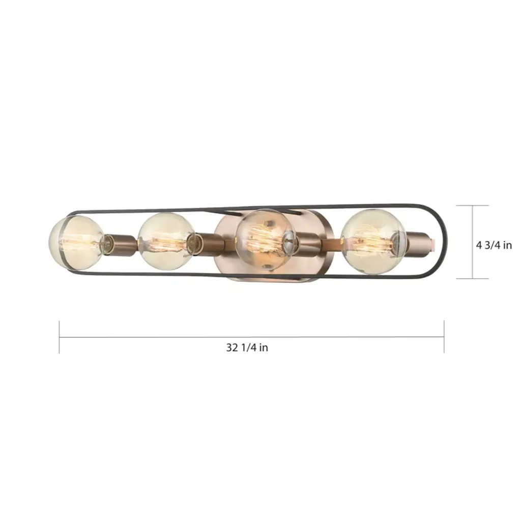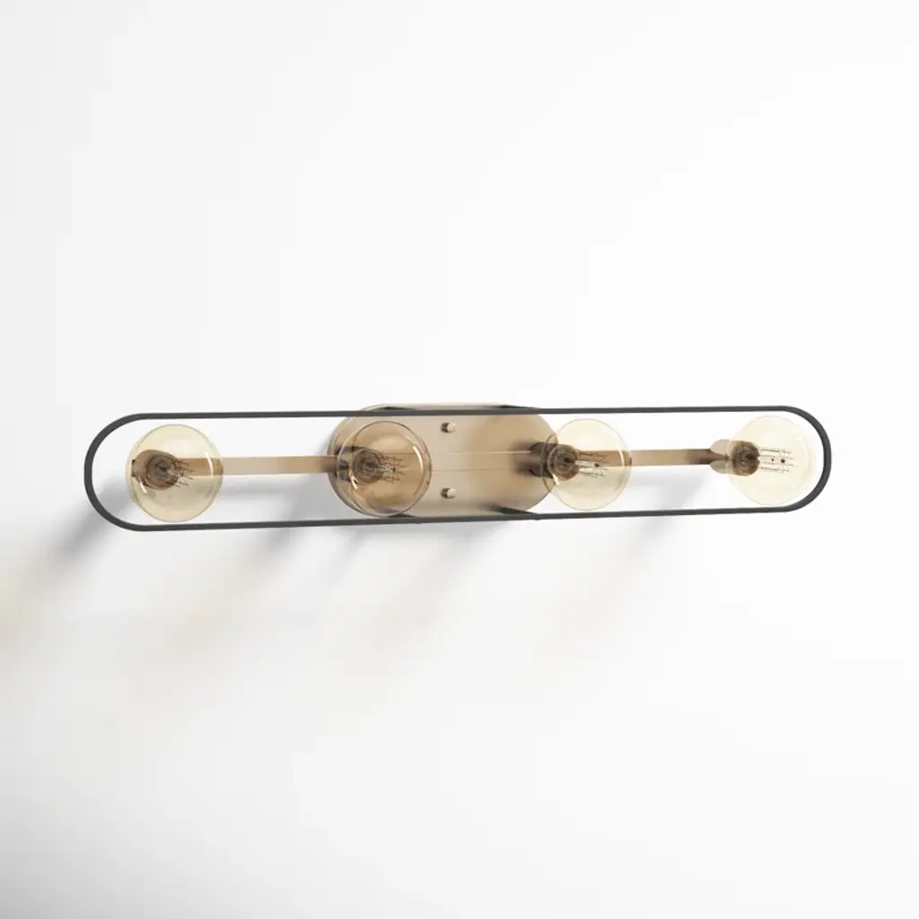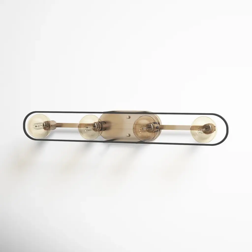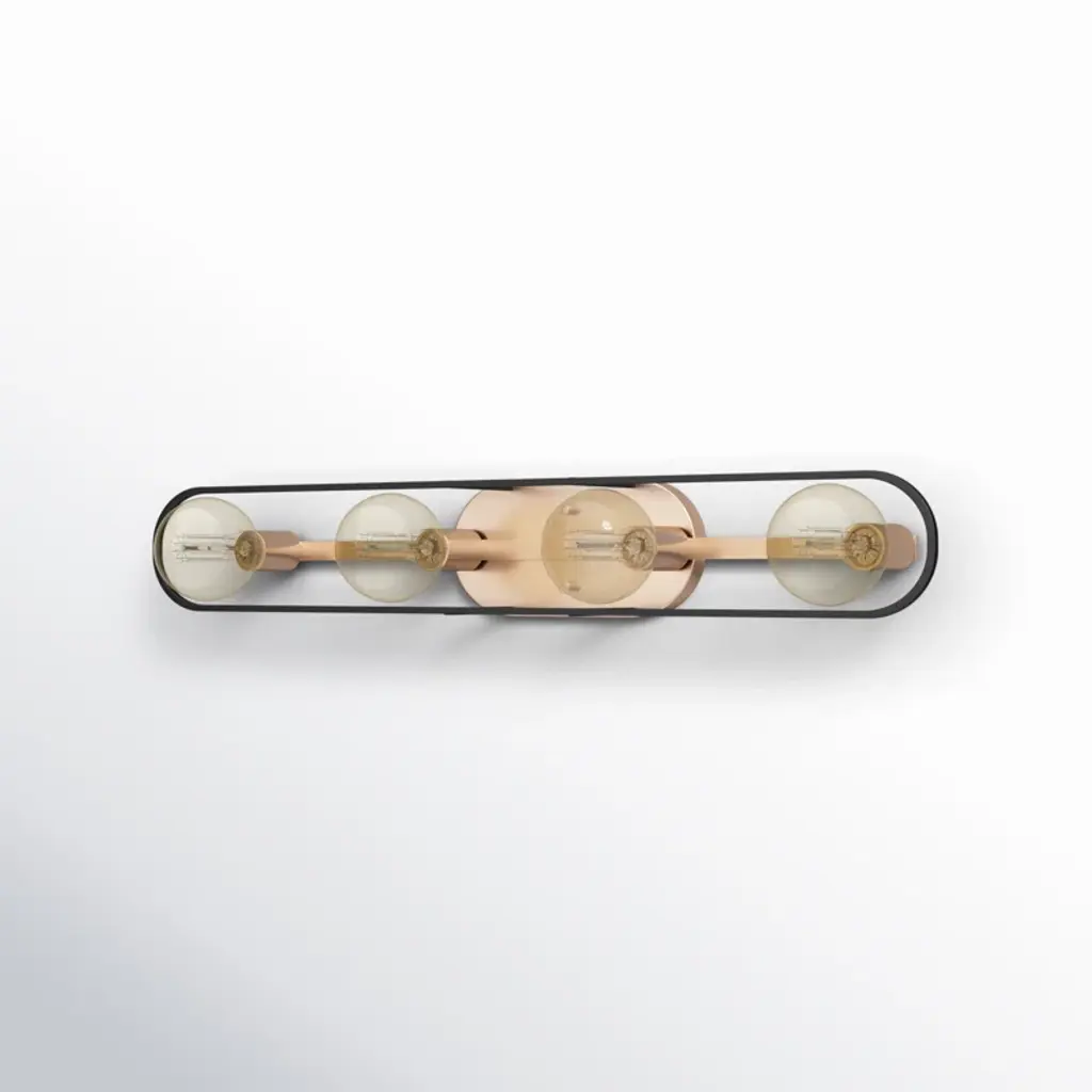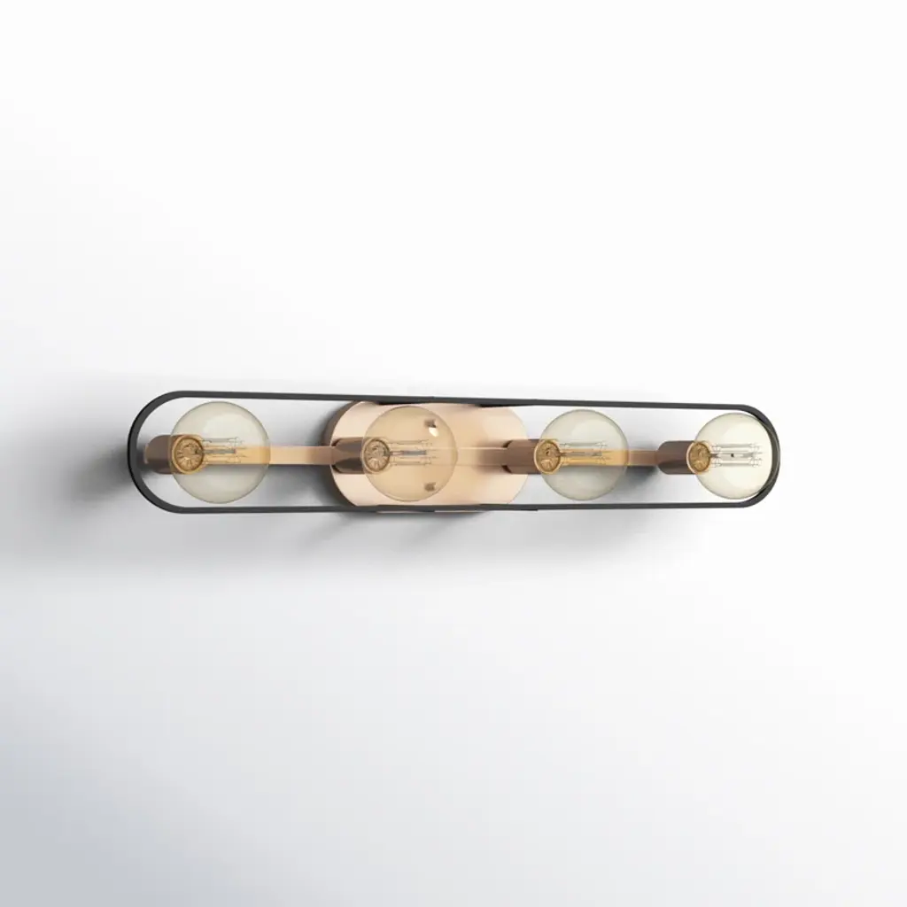 In a bathroom, where there might be fewer opportunities to show off your style, choose a vanity light that really shines! This four-light metal fixture features a stainless steel backplate in a copper brushed brass finish. It has a matte black frame for a modern look and four light bulb fixtures that house four 60W bulbs (sold separately). This hardwired, reversible-mounting vanity light is compatible with dimmer switches and safe to use in damp locations. It’s well-suited for single vanities but can work with a double vanity too.