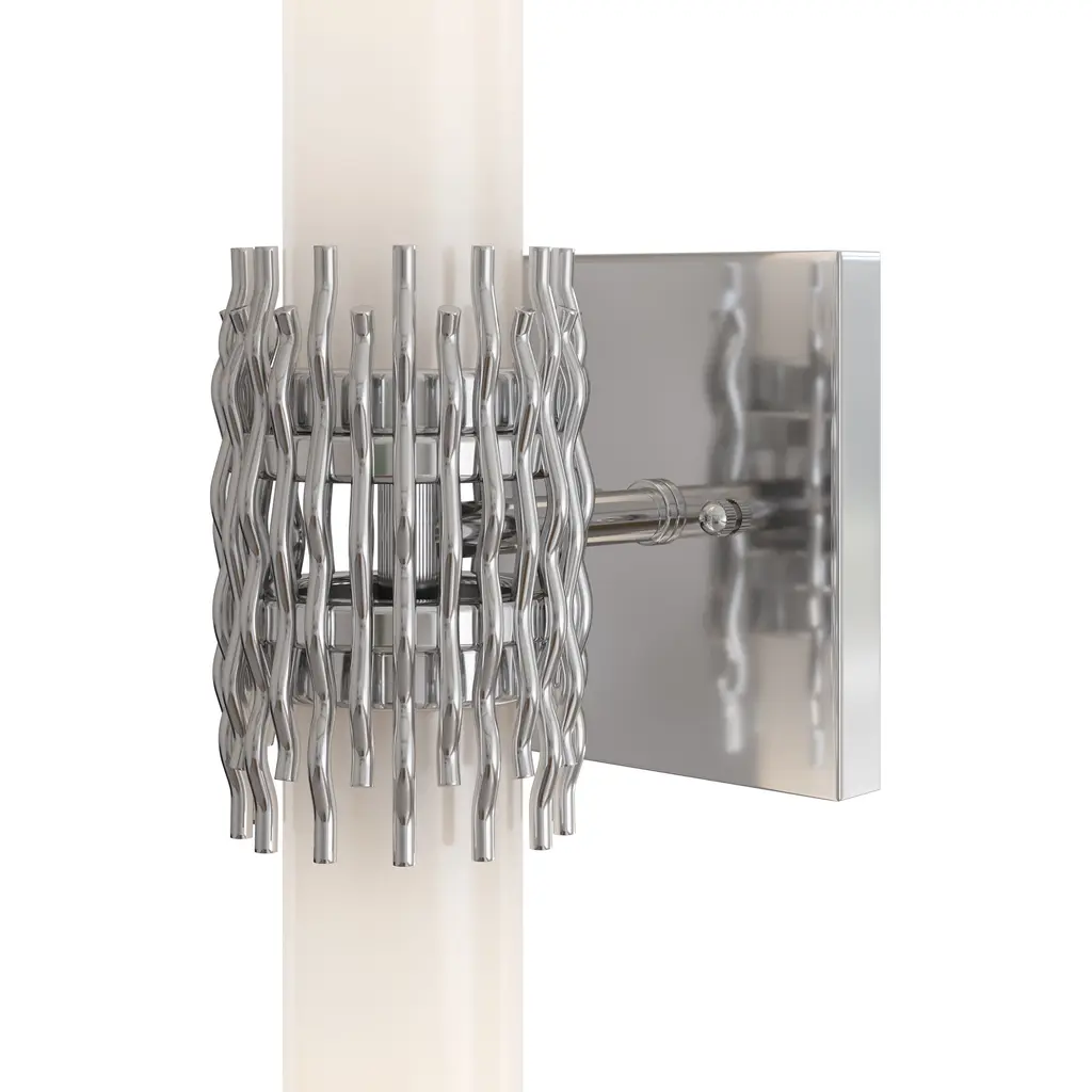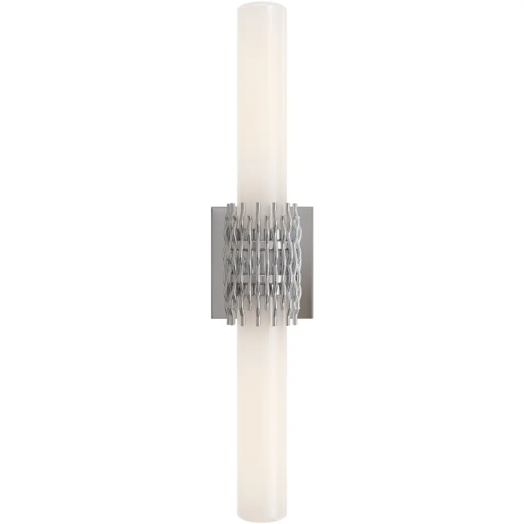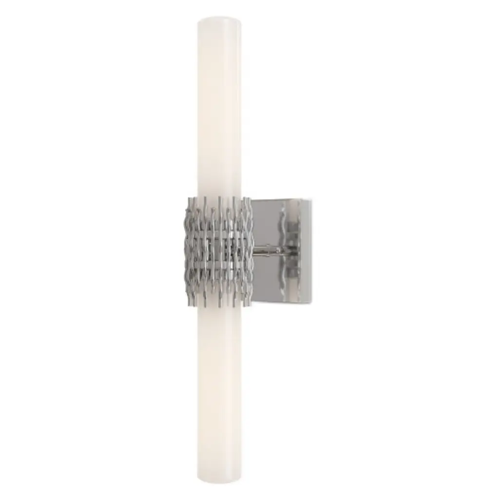 The Brietta Nickel Bath Wall Sconce is made of metal in a polished nickel finish with a design that features undulating wirework that cradles two milky glass tubes, leaving an intentional negative space at the center that adds visual intrigue. Fitted with two elongated bulbs that fully illuminate the glass, a soft, ambient glow enhances the sculptural form.