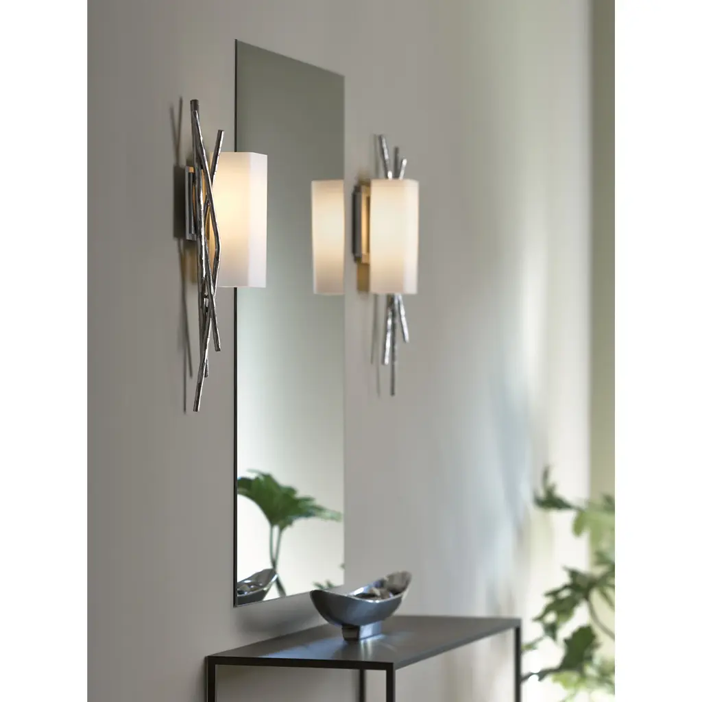 Sylvan meets steel with multi-faceted "twigs" forged from red-hot round bar stock hammered for texture and shape by our Vermont artisans. The steel sculpture couched beside the square glass tube offers an eye-catching accent.