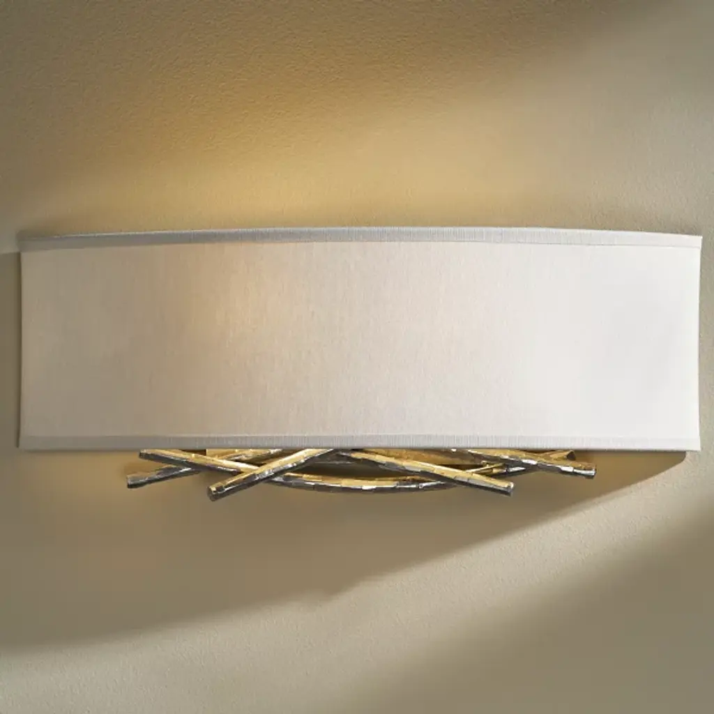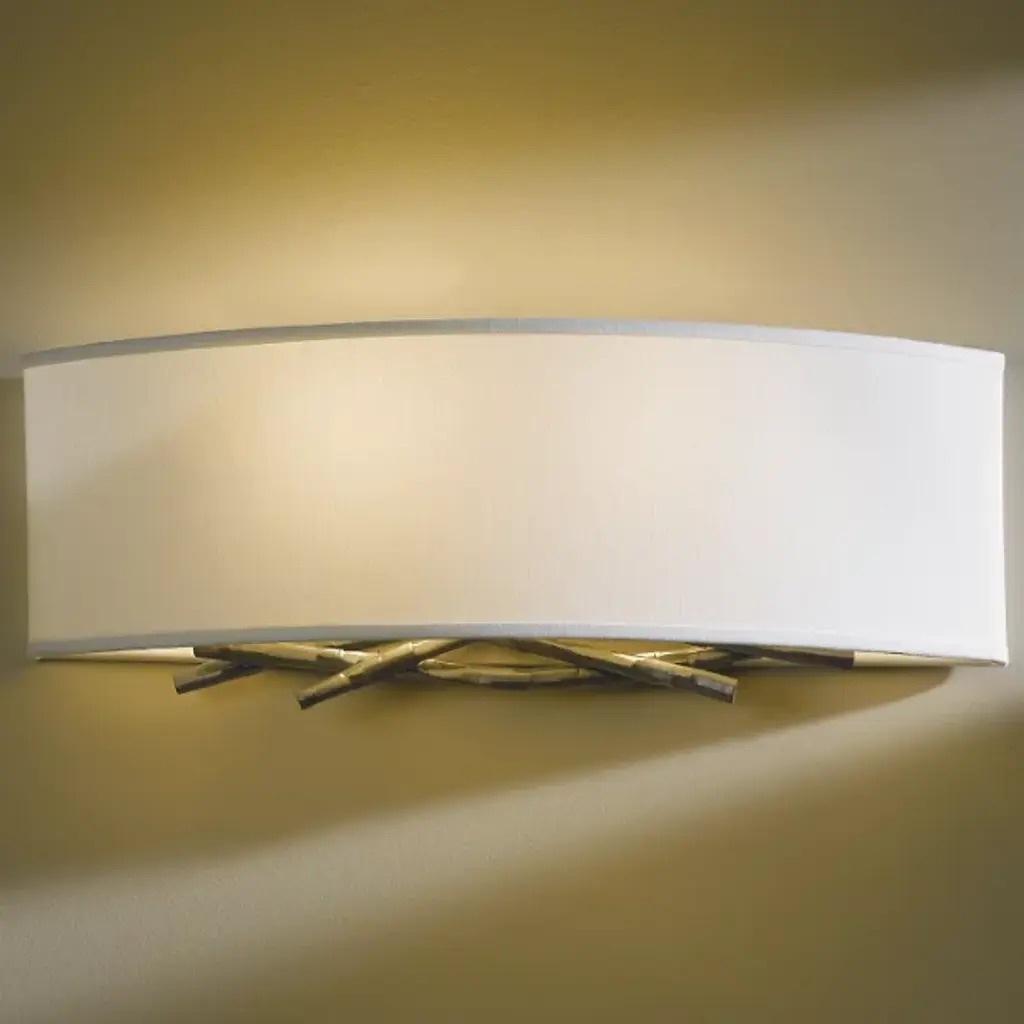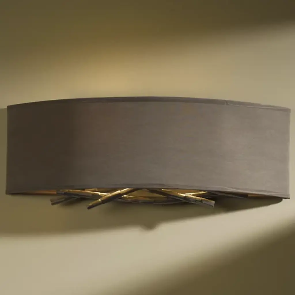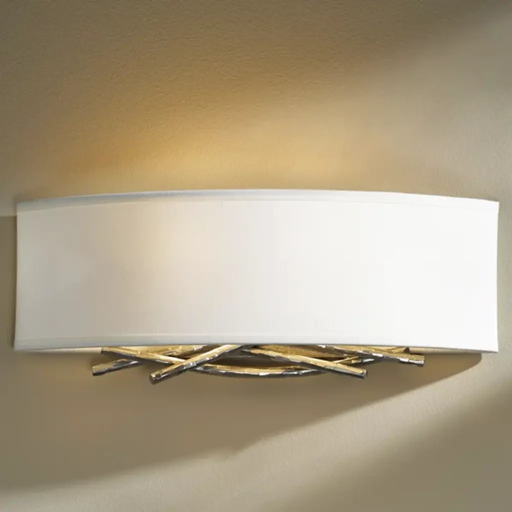 Hammered, forged and formed, the Hubbardton Forge Brindille Wall Sconce features metal stakes that have been expertly shaped to represent natural-looking twigs, giving the sconce a warm, organic feel for the soft contemporary space. Choose from several finish and shade options to best complement the space.