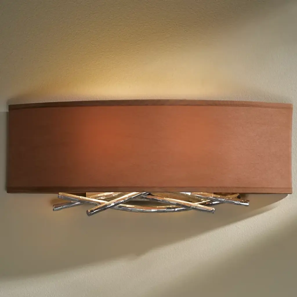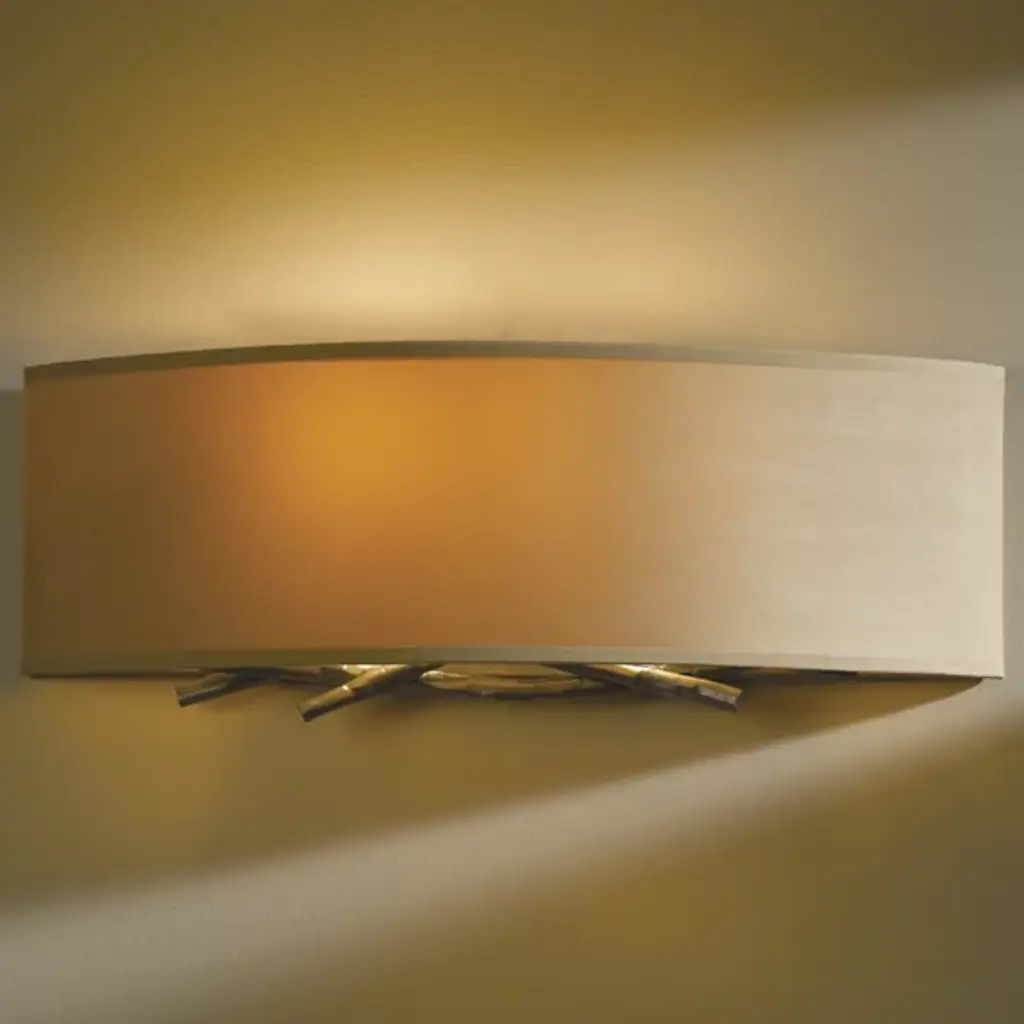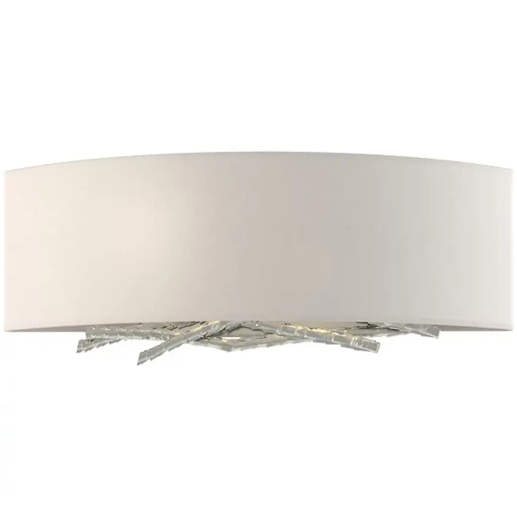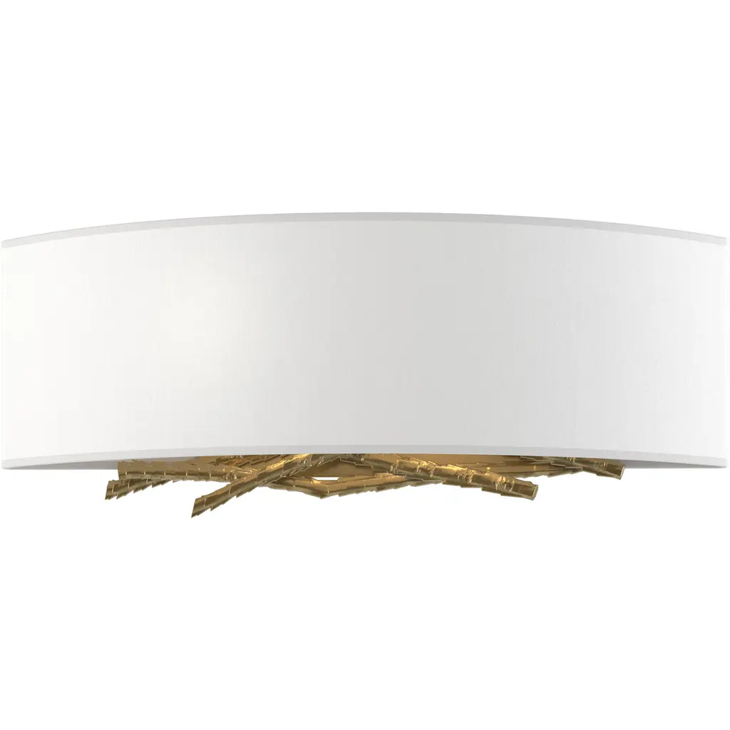 Hammered, forged and formed, the Hubbardton Forge Brindille Wall Sconce features metal stakes that have been expertly shaped to represent natural-looking twigs, giving the sconce a warm, organic feel for the soft contemporary space. Choose from several finish and shade options to best complement the space.