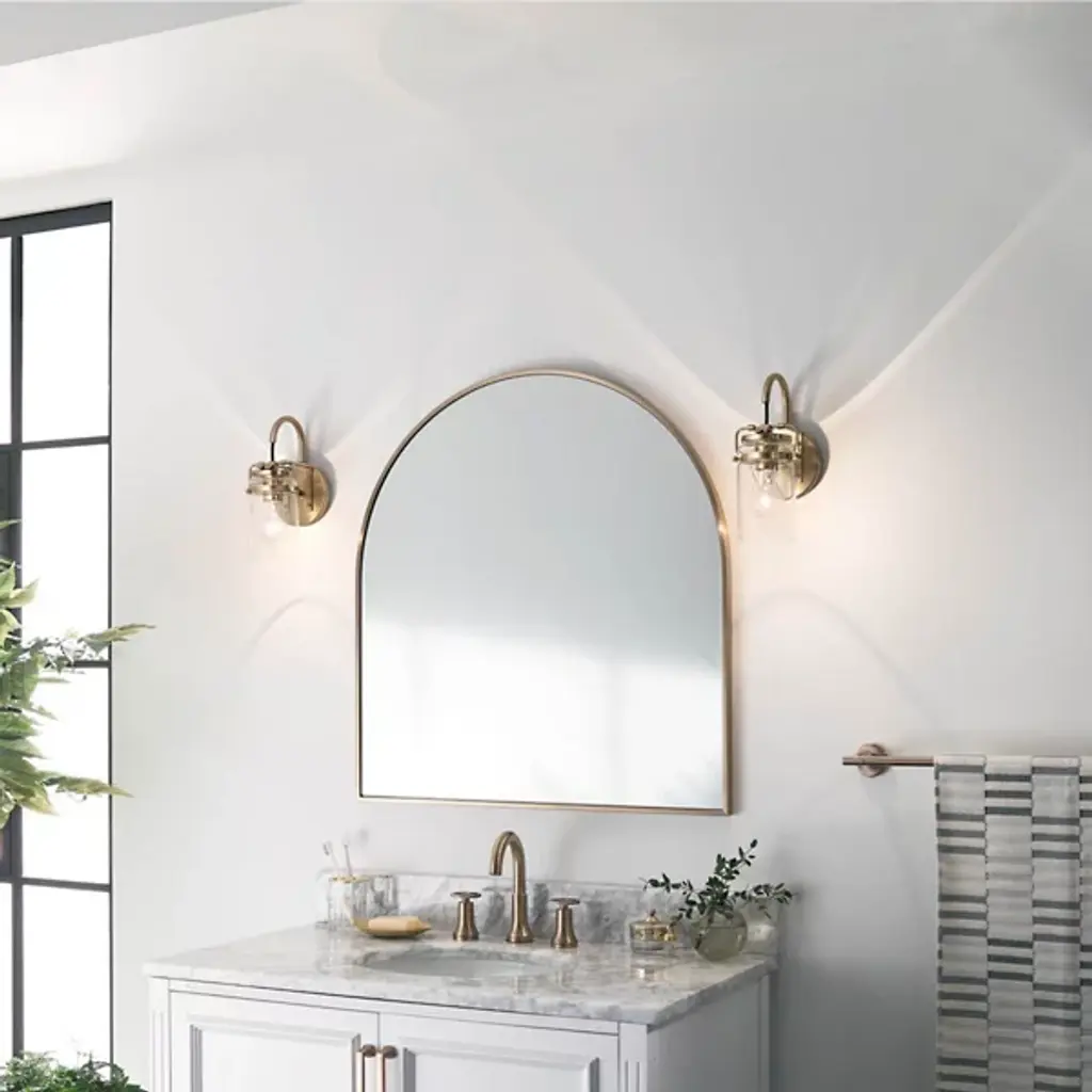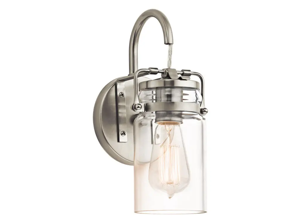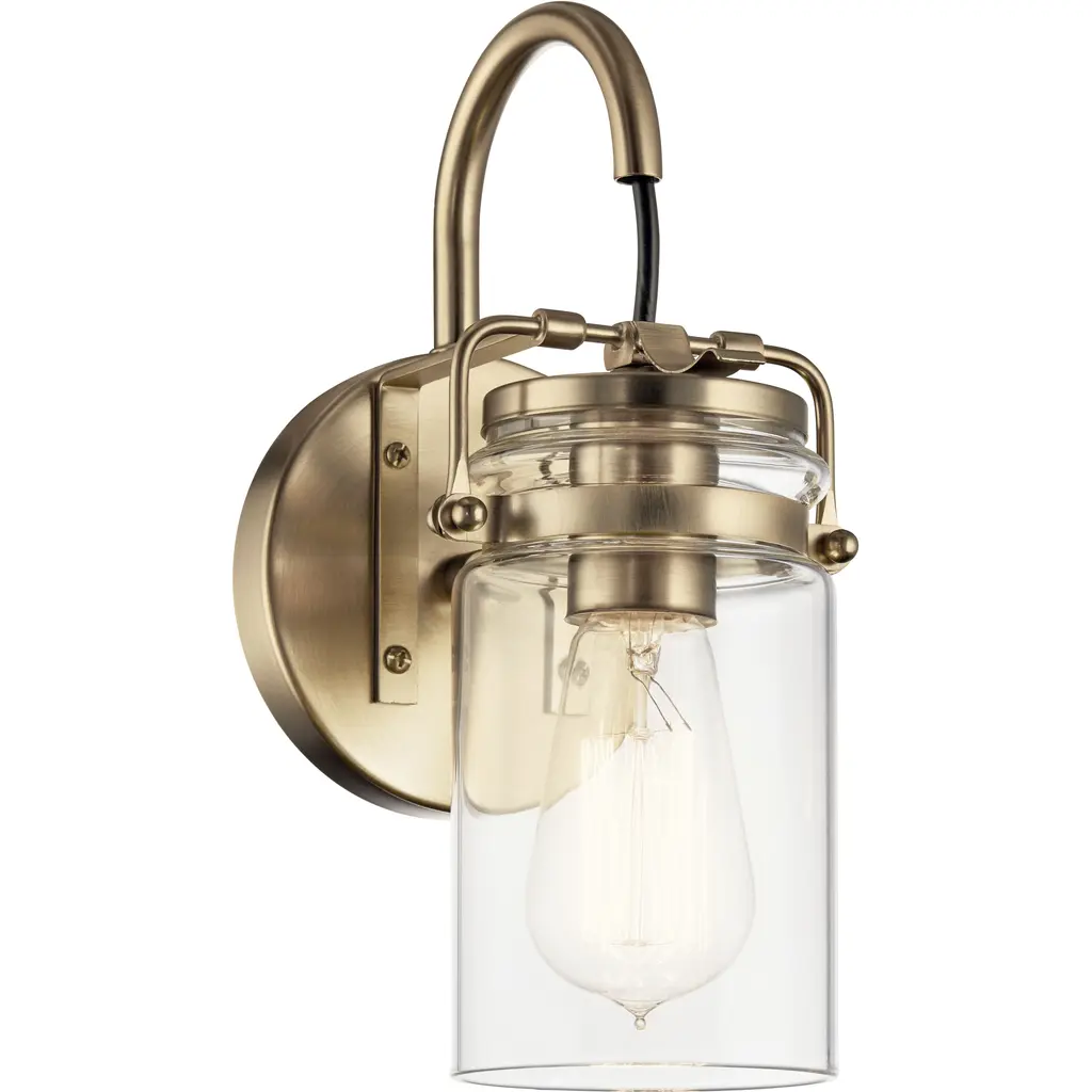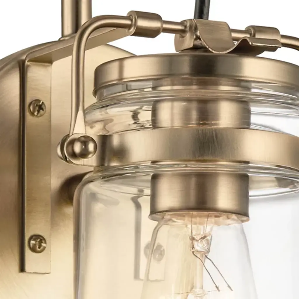 A casual glass jar style shade integrated into a vintage industrial-style fixture, the Kichler Brinley Wall Sconce revives the antiquated lighting trend with a modern feel. Conveying the familiarity and comfort of basic canning jars, the Brinley Wall Sconce delivers ample illumination through a punctuated Clear Seedy glass design for a subtle visual enhancement. Mounts firmly by a rounded backplate. Install with vintage filament bulbs for a genuinely antiquated look. The Champagne Bronze finish offers a warm, muted brushed gold style and pairs beautifully with coordinating Delta® plumbing fixtures by Delta Faucet.