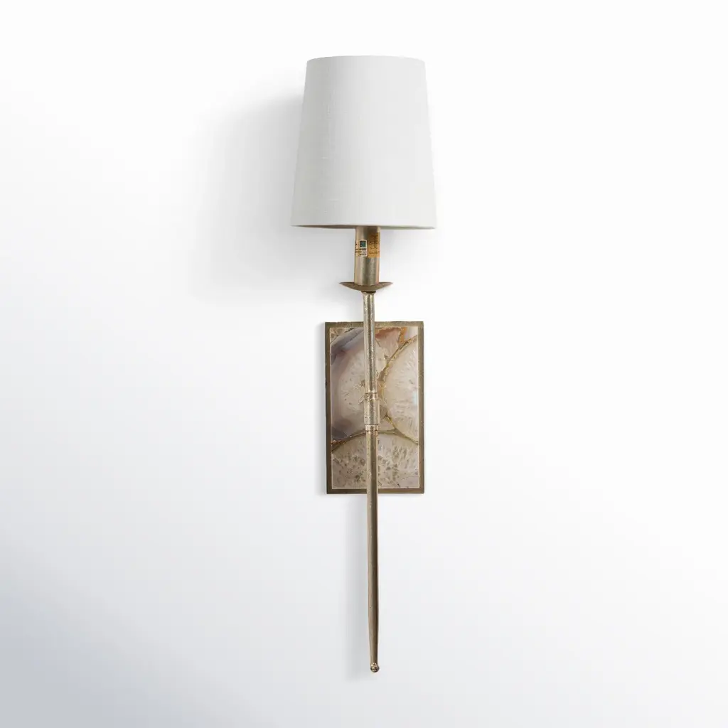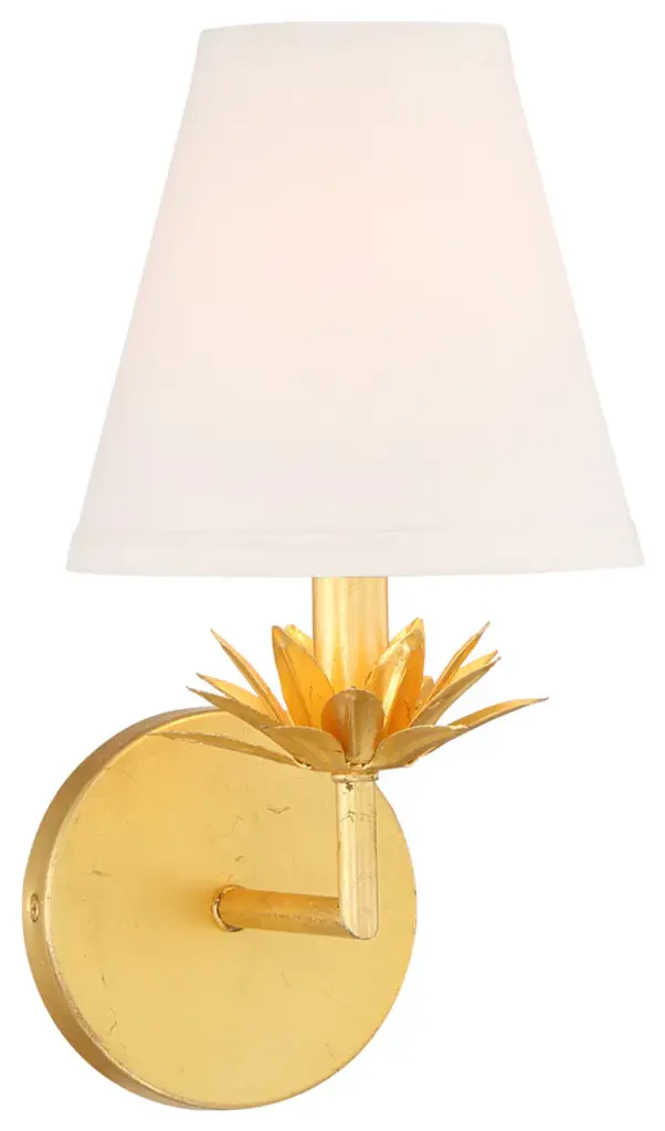 Elegantly anchored to a grooved backplate, this sconce shows off an exaggerated finial and a gilded finish. A slender linen shade makes for a classic finishing touch. Hardwired.