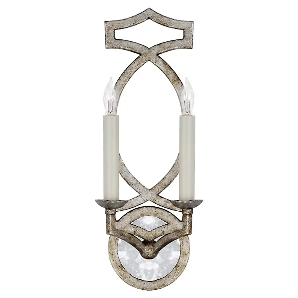 The picturesque Brittany Double Wall Sconce by Visual Comfort is the perfect addition to your contemporary home. A circular, metallic backplate secures to your wall boasting well-made plates which hold dual candle-like fixings. Flame-shaped bulbs produce warm light that dispenses throughout your entryway or hall. The eye is drawn to the finely contoured metalwork, which forms an oval that rests underneath a beautiful crowning embellishment. Take control of the brightness level of the emitted light by pairing this sconce with a standard dimmer.